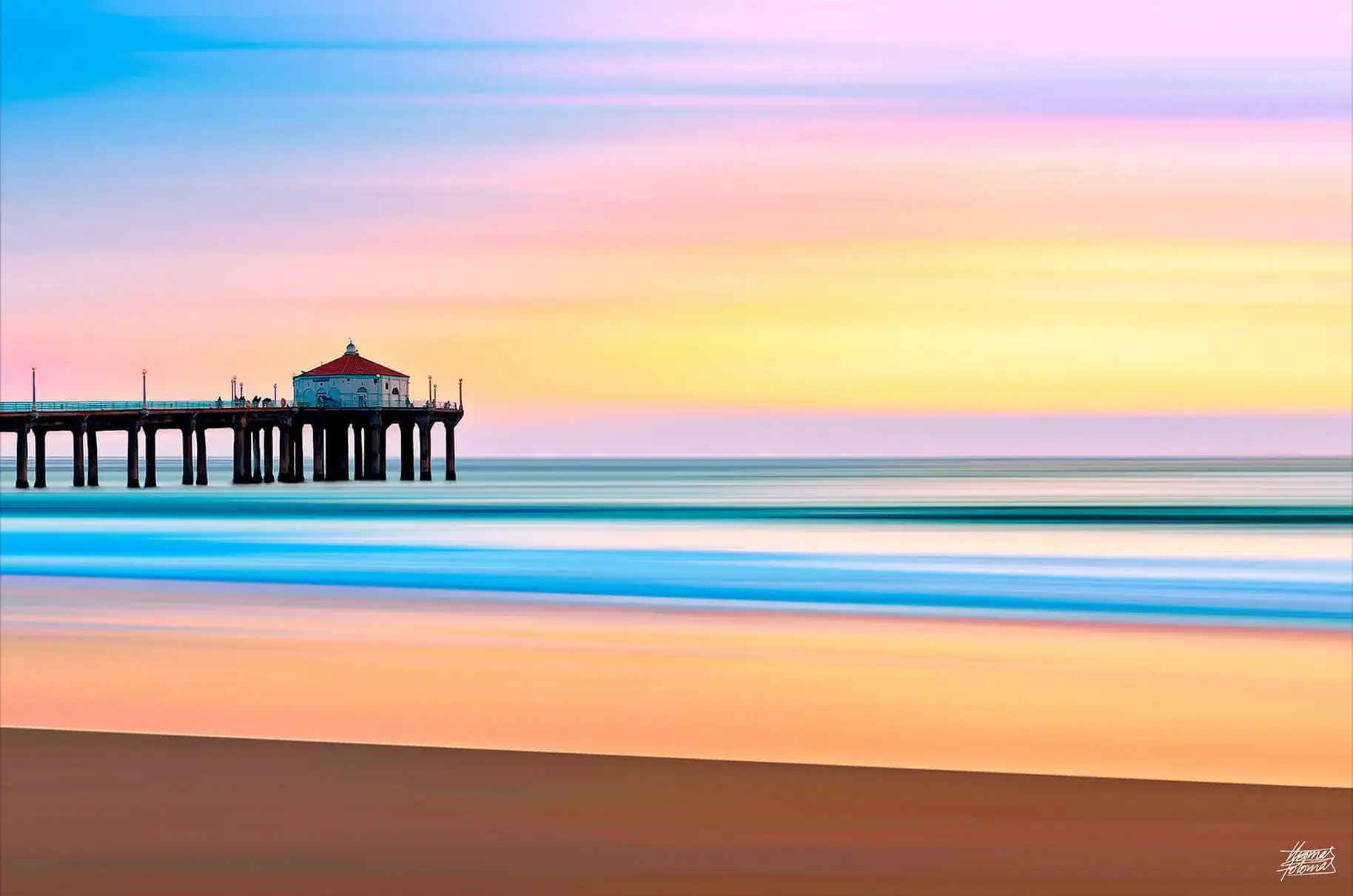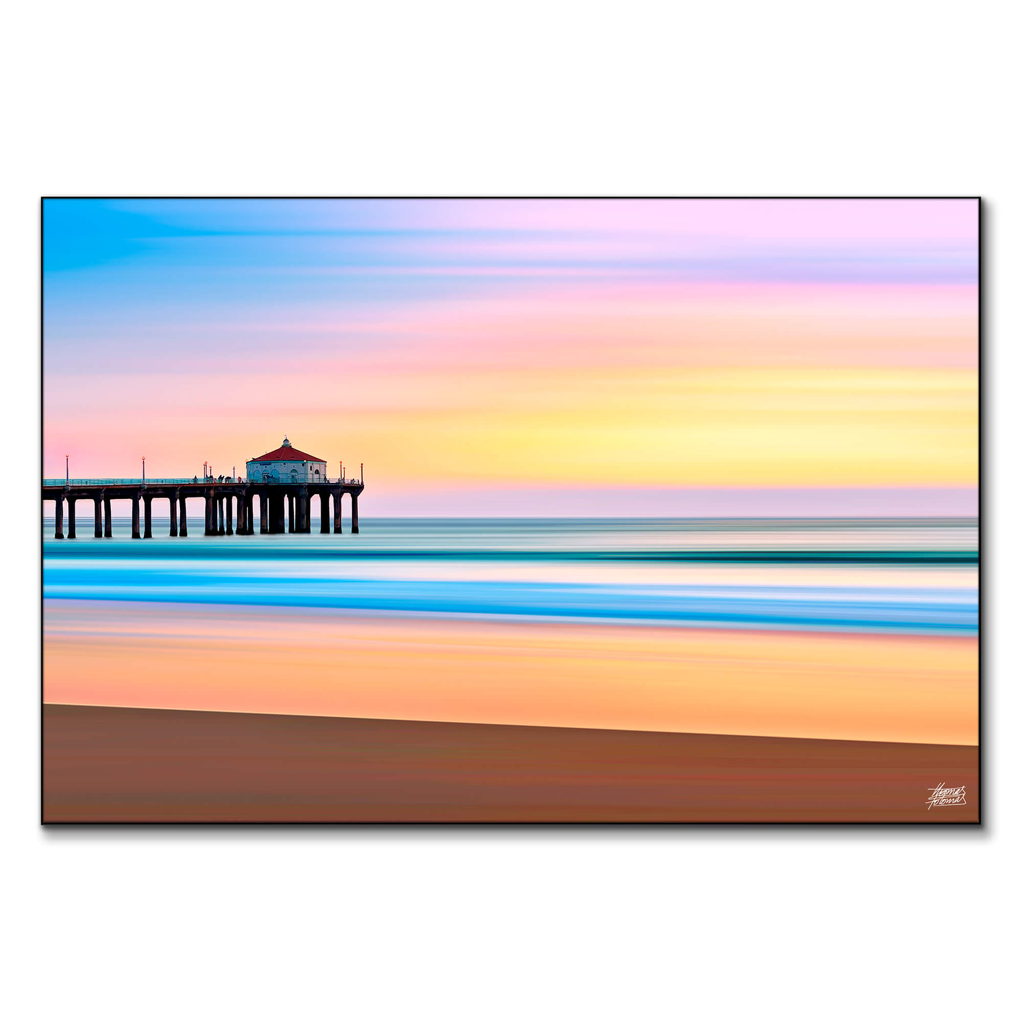 This stunning artwork showcases the iconic Manhattan Beach Pier at sunset, with a palette of warm oranges, pinks, and cool blues. The serene scene captures the beauty of the beach as the sun dips below the horizon, creating a tranquil atmosphere. The detailed depiction of the pier invites viewers to envision themselves walking along the shore, making it an ideal piece for those who cherish coastal living.