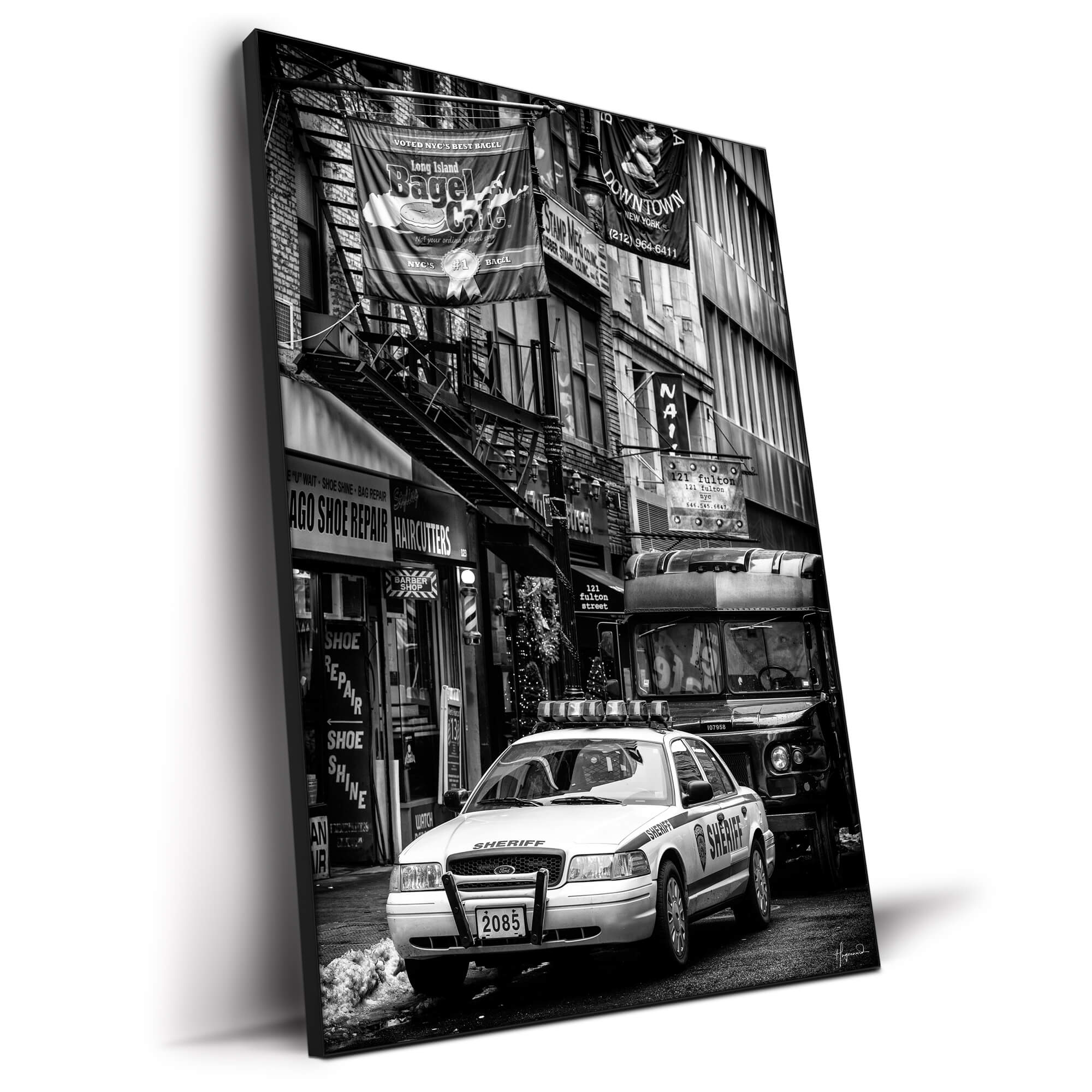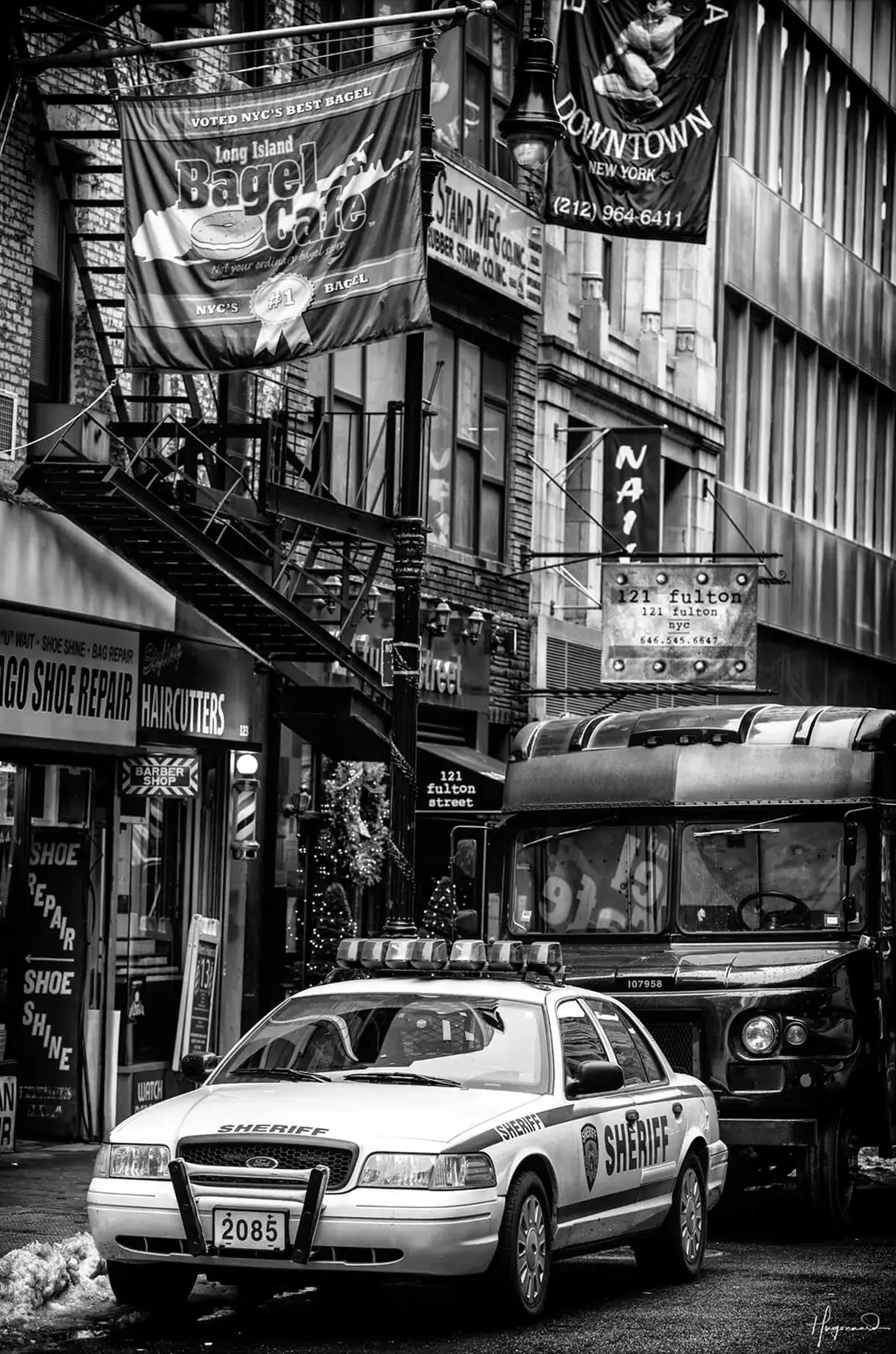 This black and white photograph offers a gritty slice of Manhattan life, focusing on a New York Police Department car parked on a bustling city street. Above the police car, the urban landscape is dense with signs and awnings, including one for the iconic ‘Coney Island Bagel’, hinting at the city’s culinary diversity.