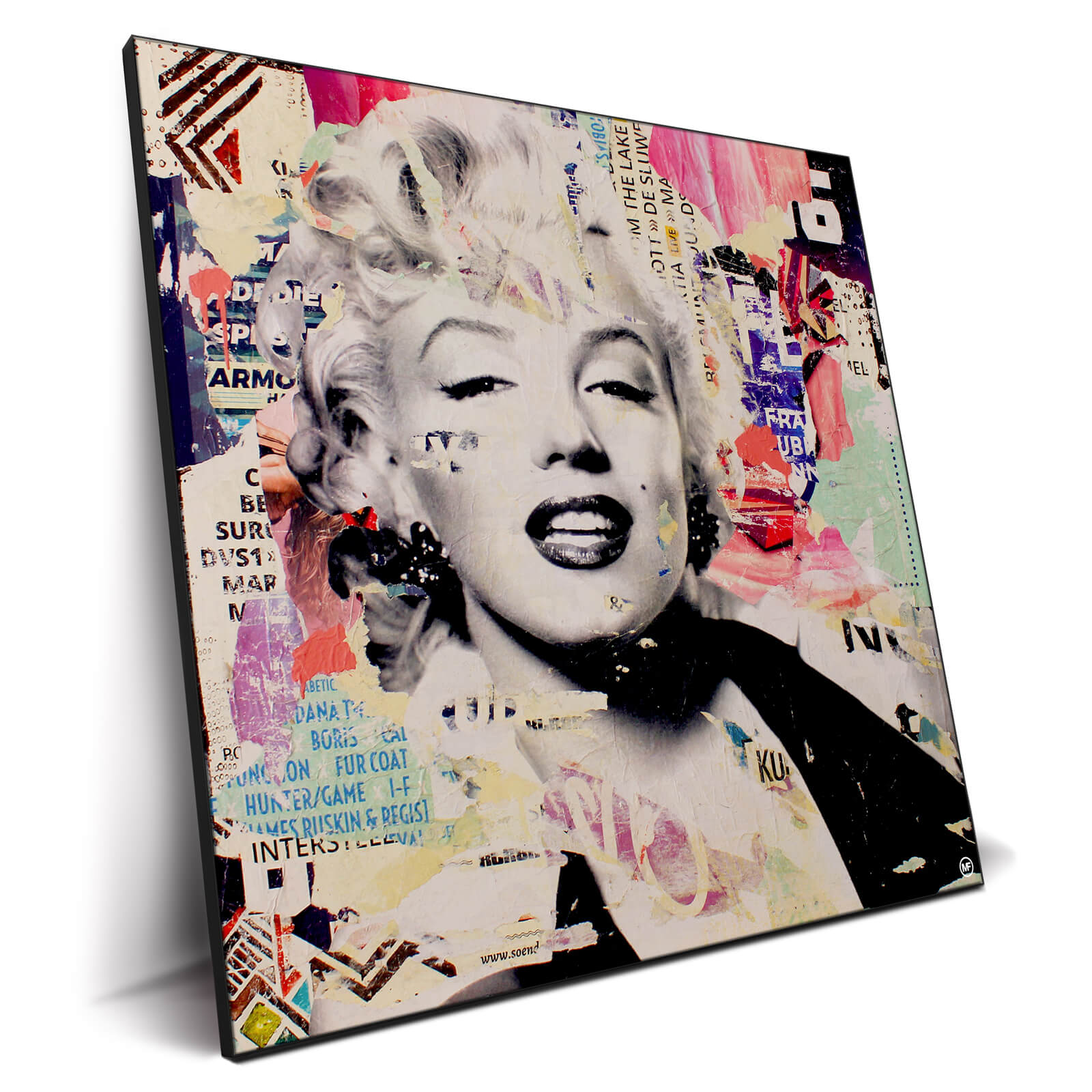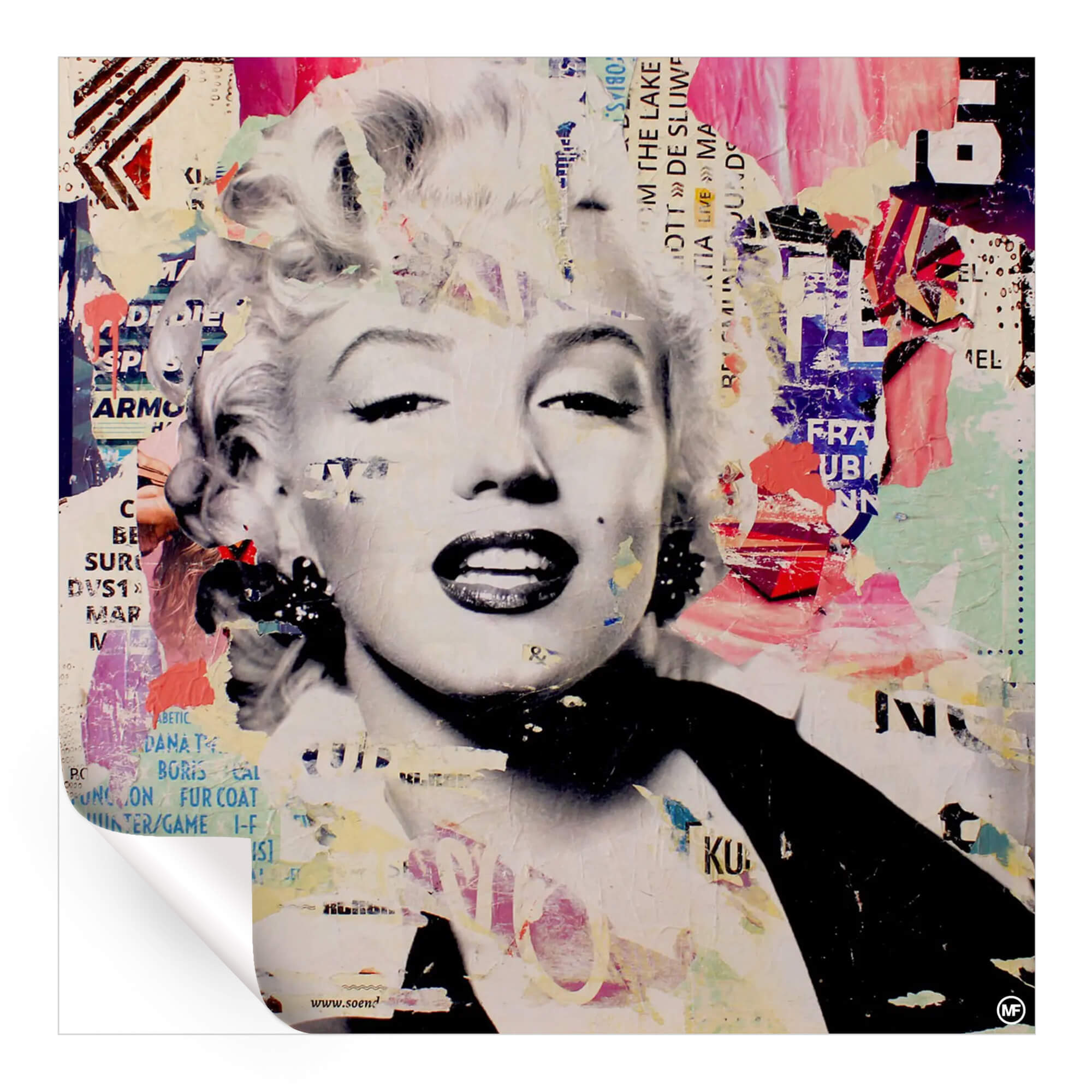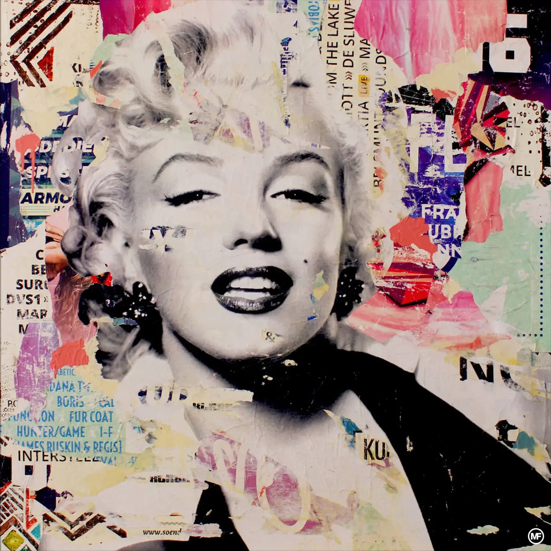 Marilyn Monroe comes to life in this vibrant collage, her effervescent smile and playful pose forever captured amidst a flurry of pop art imagery. A spectrum of colors and snippets of text surround her, creating a dynamic backdrop that speaks to the chaos and charisma of the era she symbolized.