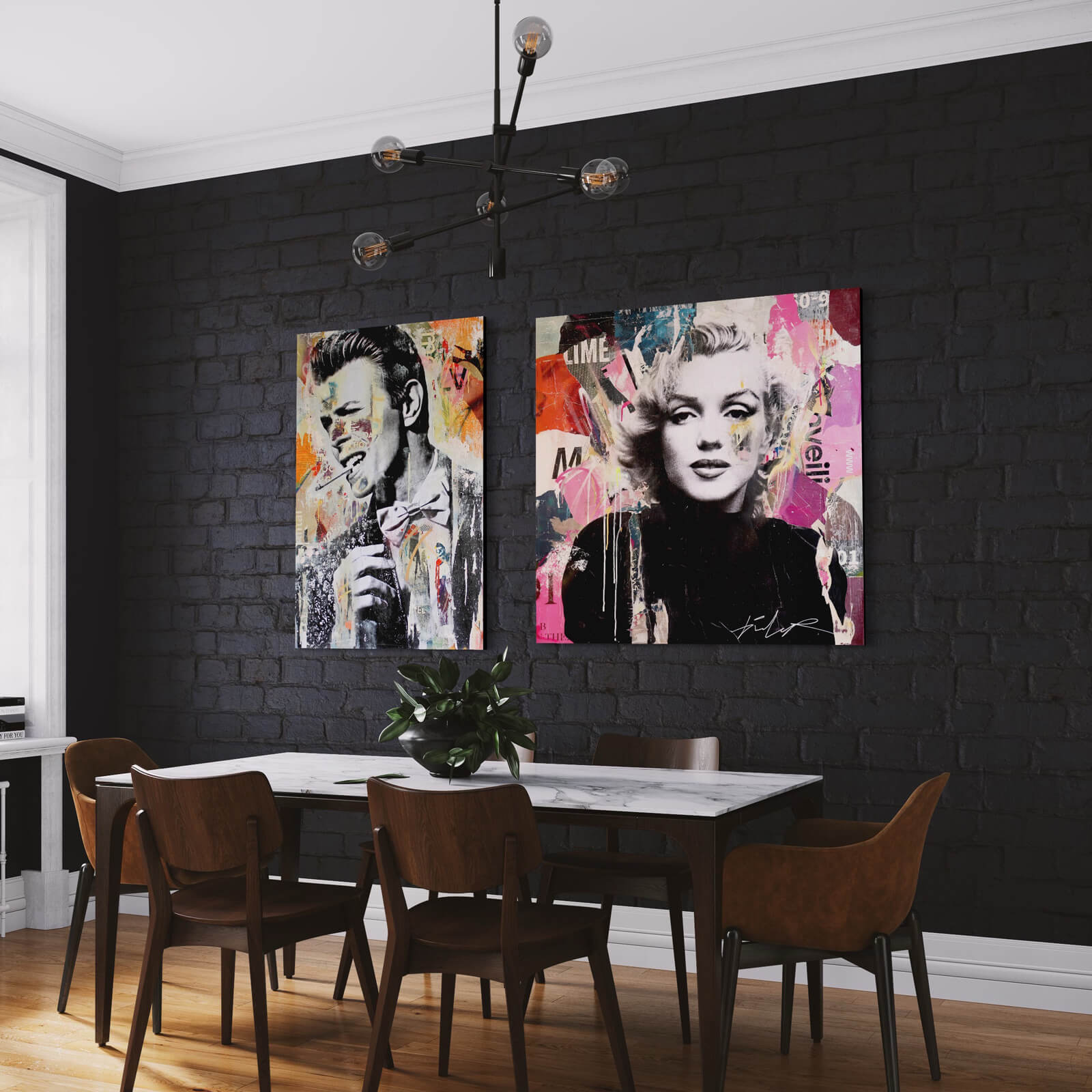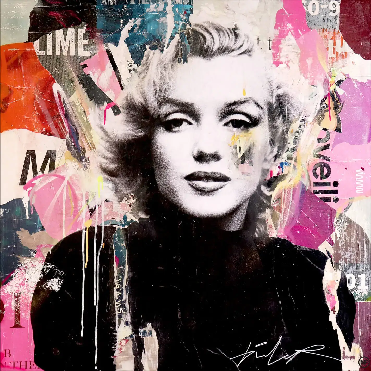 Her alluring gaze is punctuated by splatters of paint and collage pieces, creating an energetic and modern homage to the silver screen legend. This art piece is not just decor; it’s a celebration of Marilyn’s timeless allure, reimagined through the lens of modern pop culture.