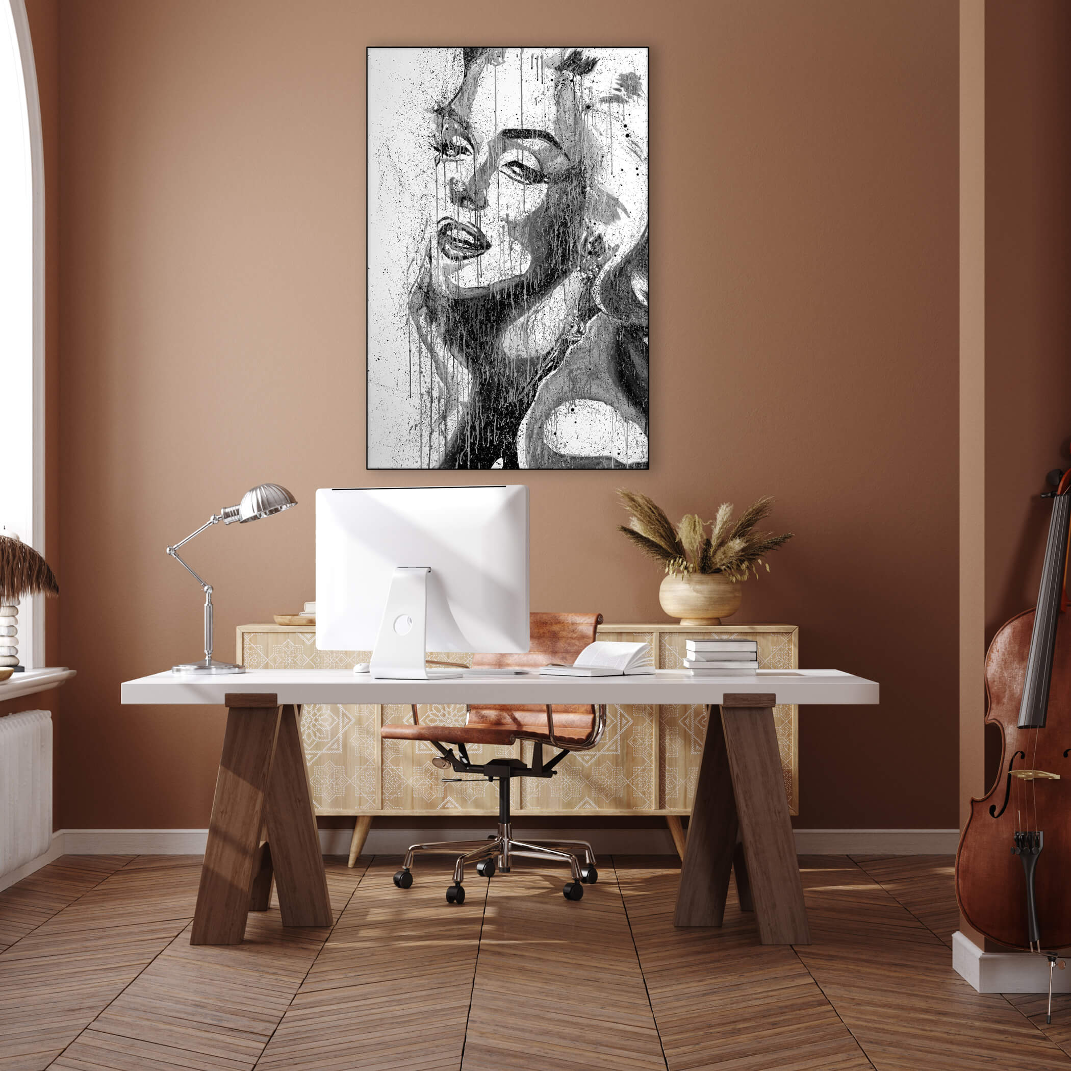 Captured in a cascade of black and white, Marilyn Monroe’s iconic image is reimagined with a modern twist by P Muir Art, her features emerging through a veil of paint drips and splatters.