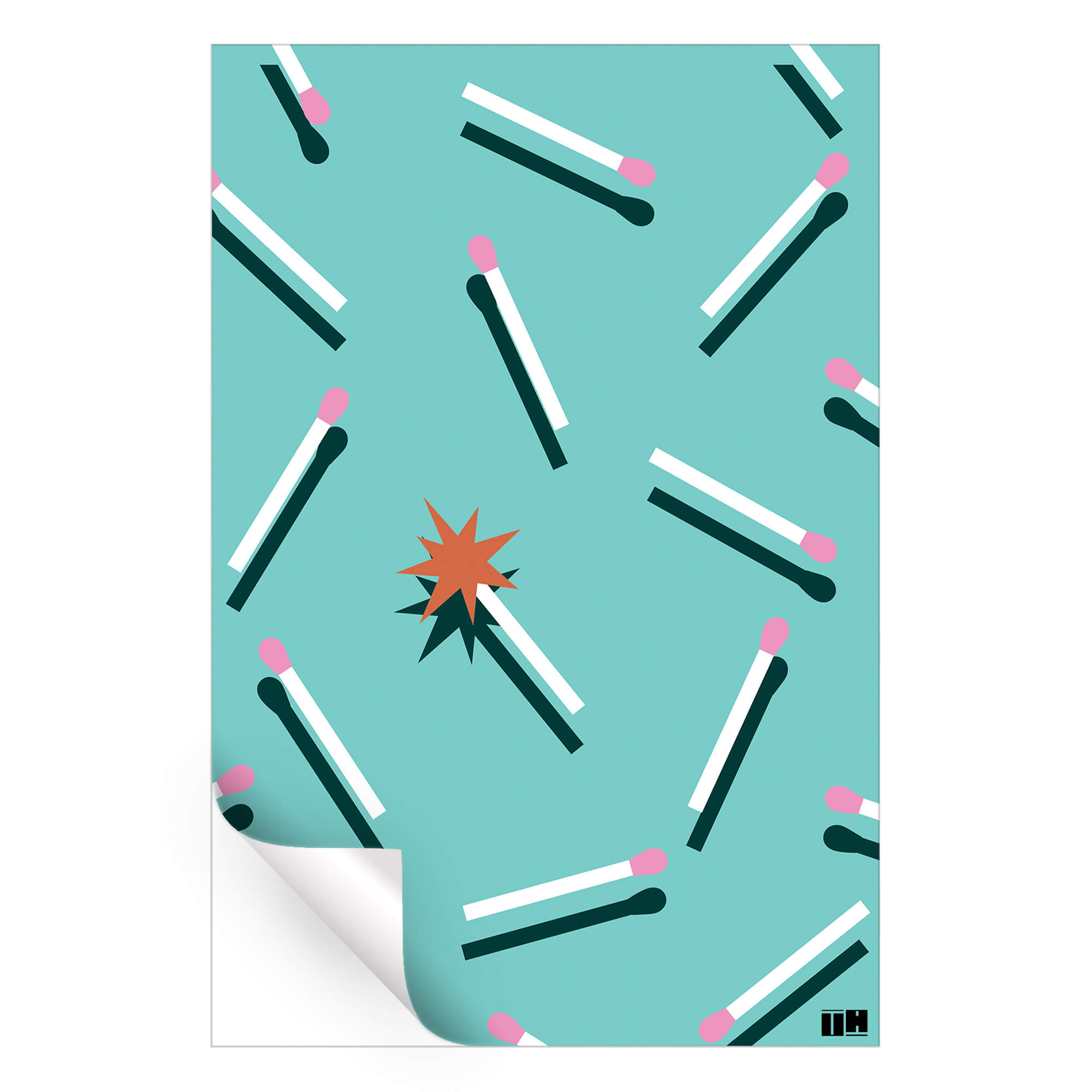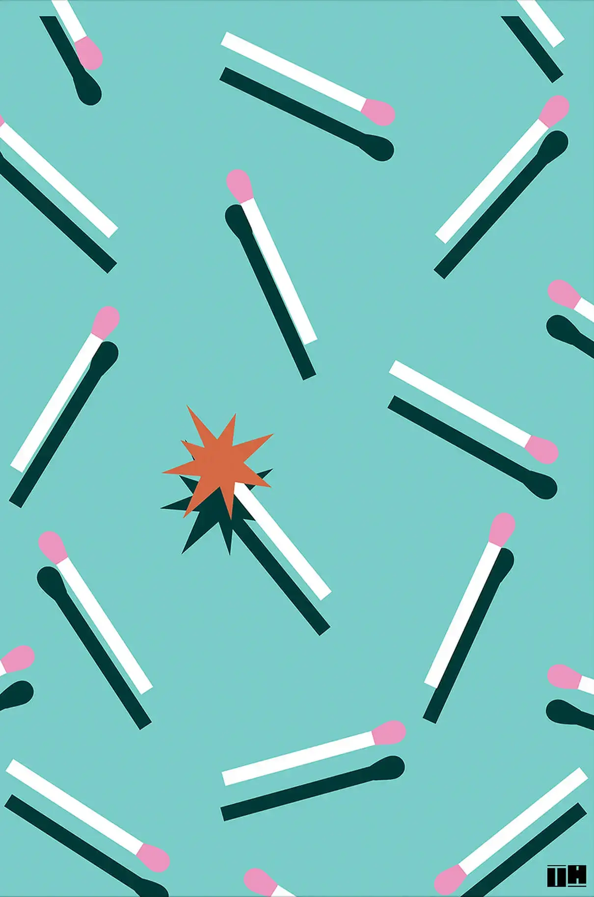 Bright teal sets the stage while matchsticks scatter across the scene like a playful pattern. Soft pink match heads pop against the cool background, mixing calm color with a fun spark of energy. One match ignites at the center, breaking the rhythm just enough to draw your eye and add a little drama to the mix. The vibe is light, graphic, and modern with that cheeky pop art spirit.
