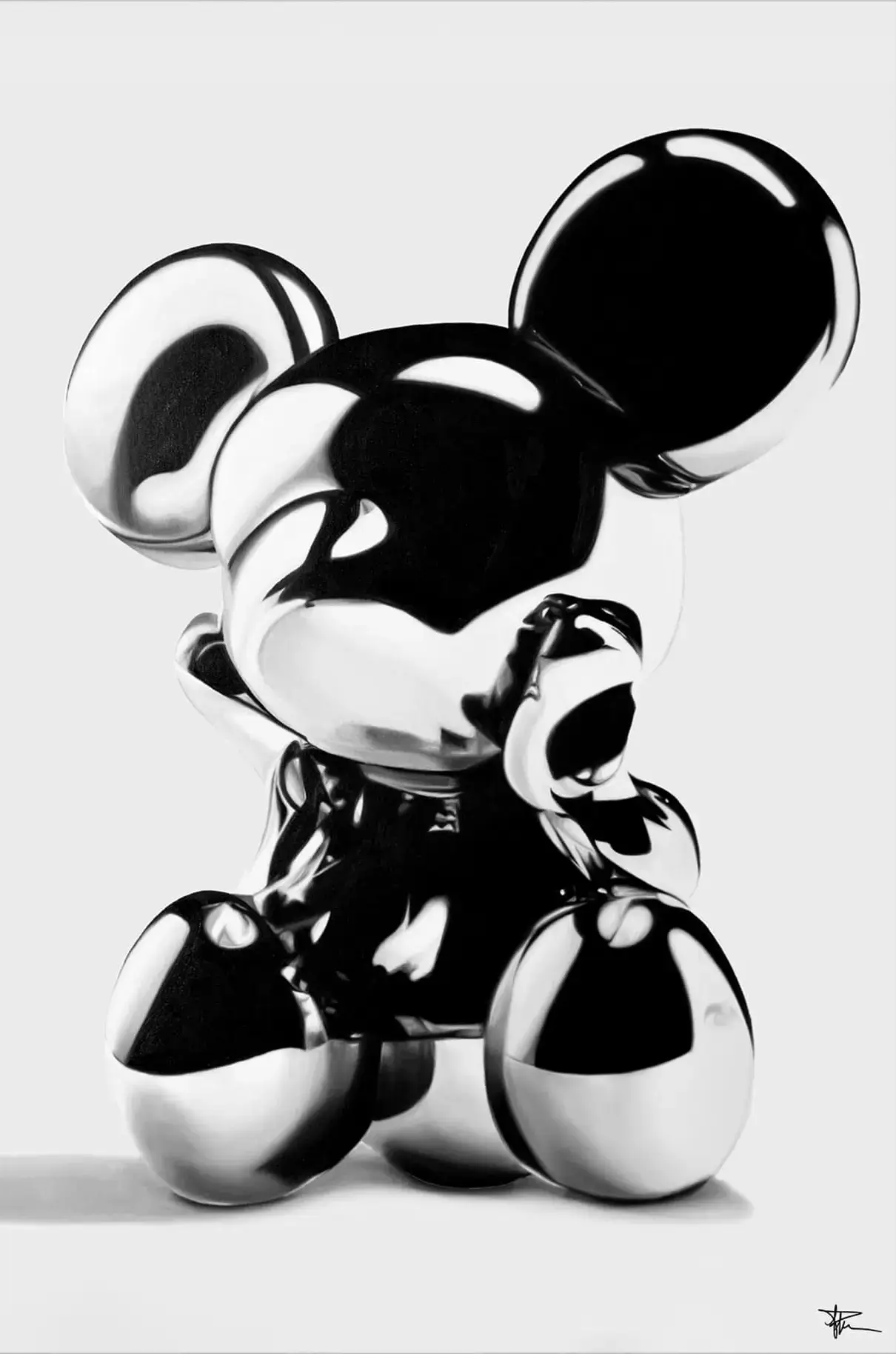 The artwork presents a striking figure reminiscent of a mouse, composed of polished metal that gleams with reflected light. Its curves and edges merge to form a playful yet statuesque structure, evoking both familiarity and innovation.