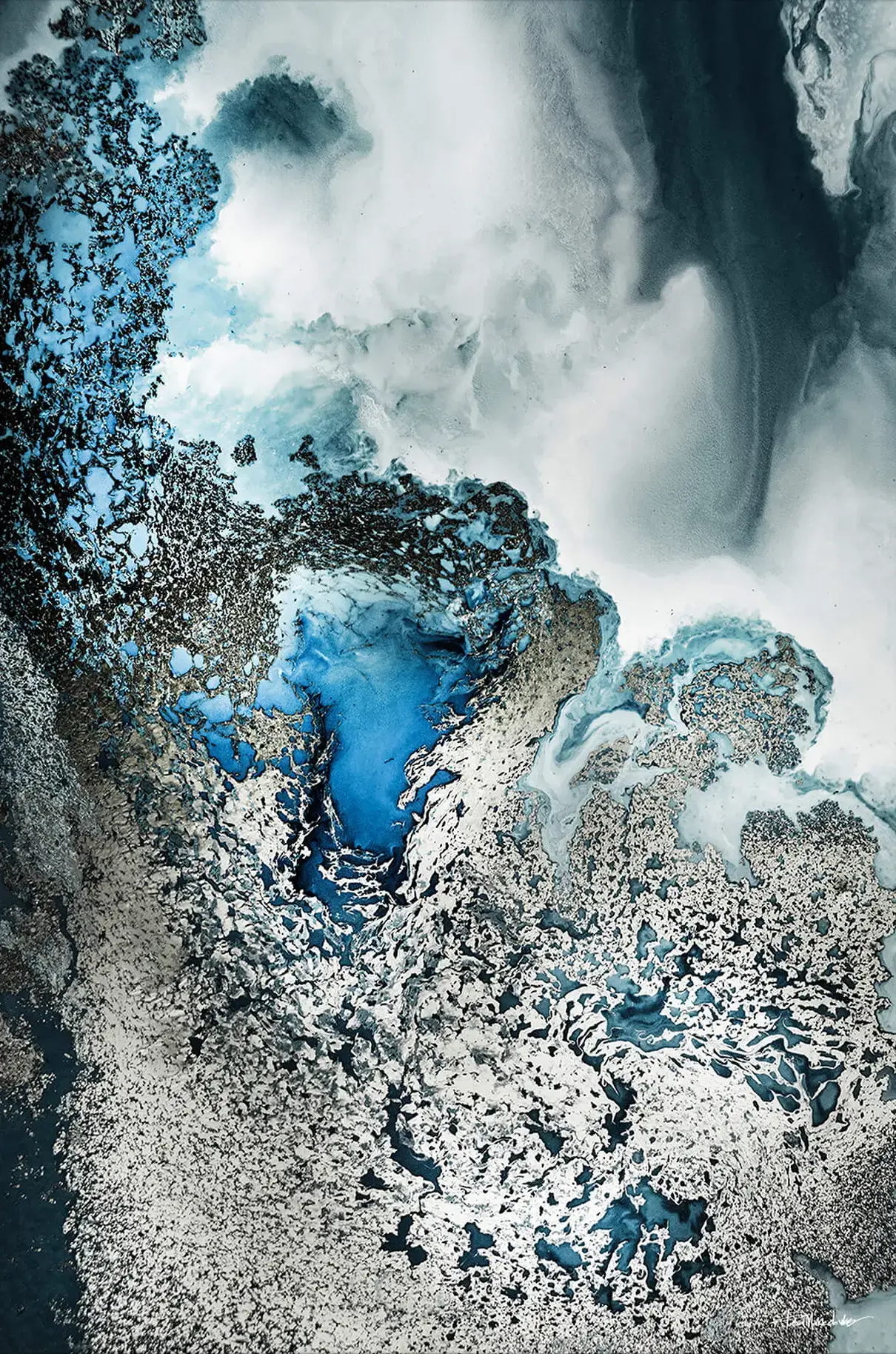 This stunning abstract piece channels the power and beauty of nature, featuring dramatic swirls of icy blues and deep blacks contrasted with shimmering silver textures. The fluid motion of the design evokes the raw energy of glaciers and turbulent waters, capturing a frozen moment in time. With its striking color palette and textured details, this artwork adds a sense of depth and intrigue to any room. Printed on high-quality materials, it serves as a bold statement piece, perfect for modern, minimalist spaces or anyone who appreciates nature’s fierce elegance.