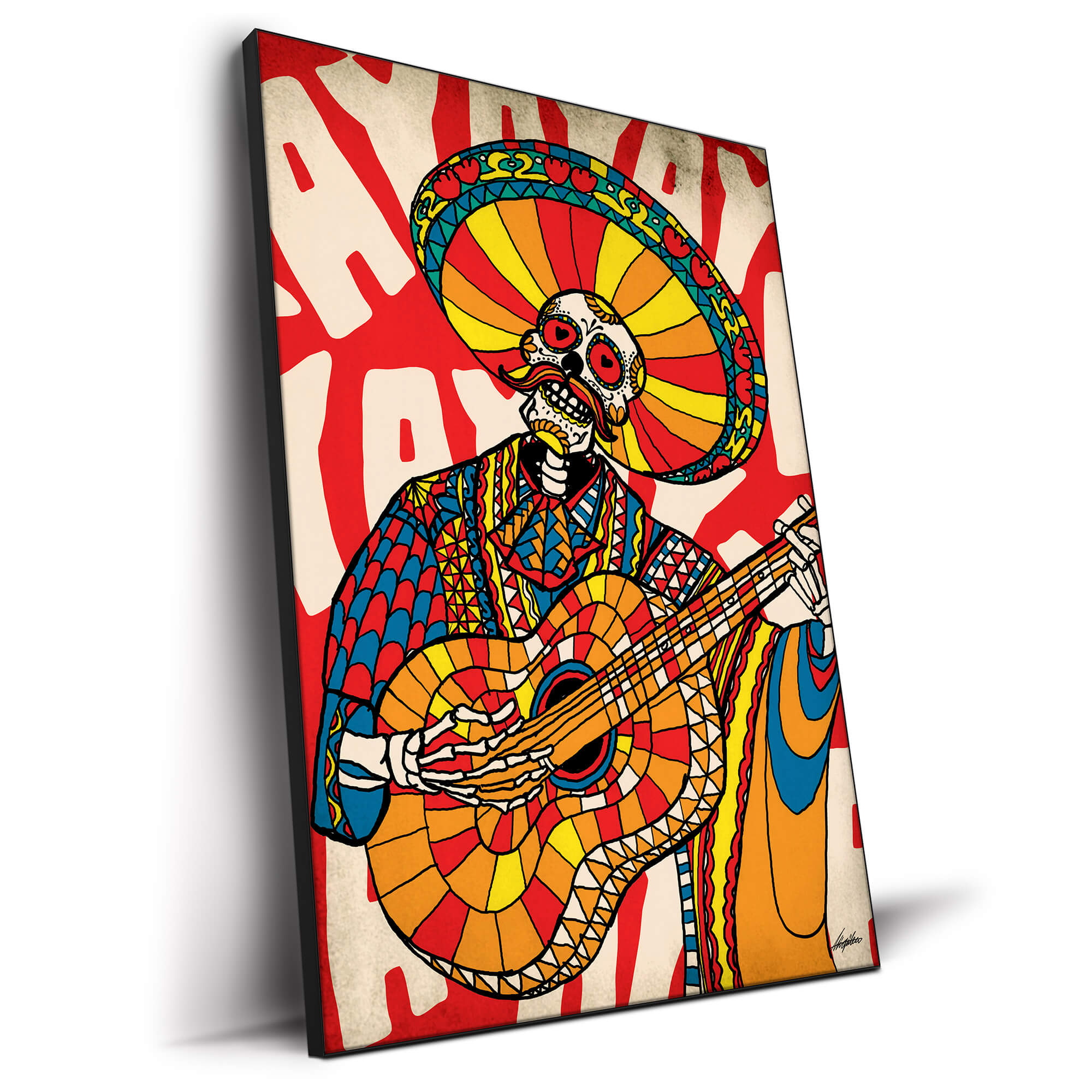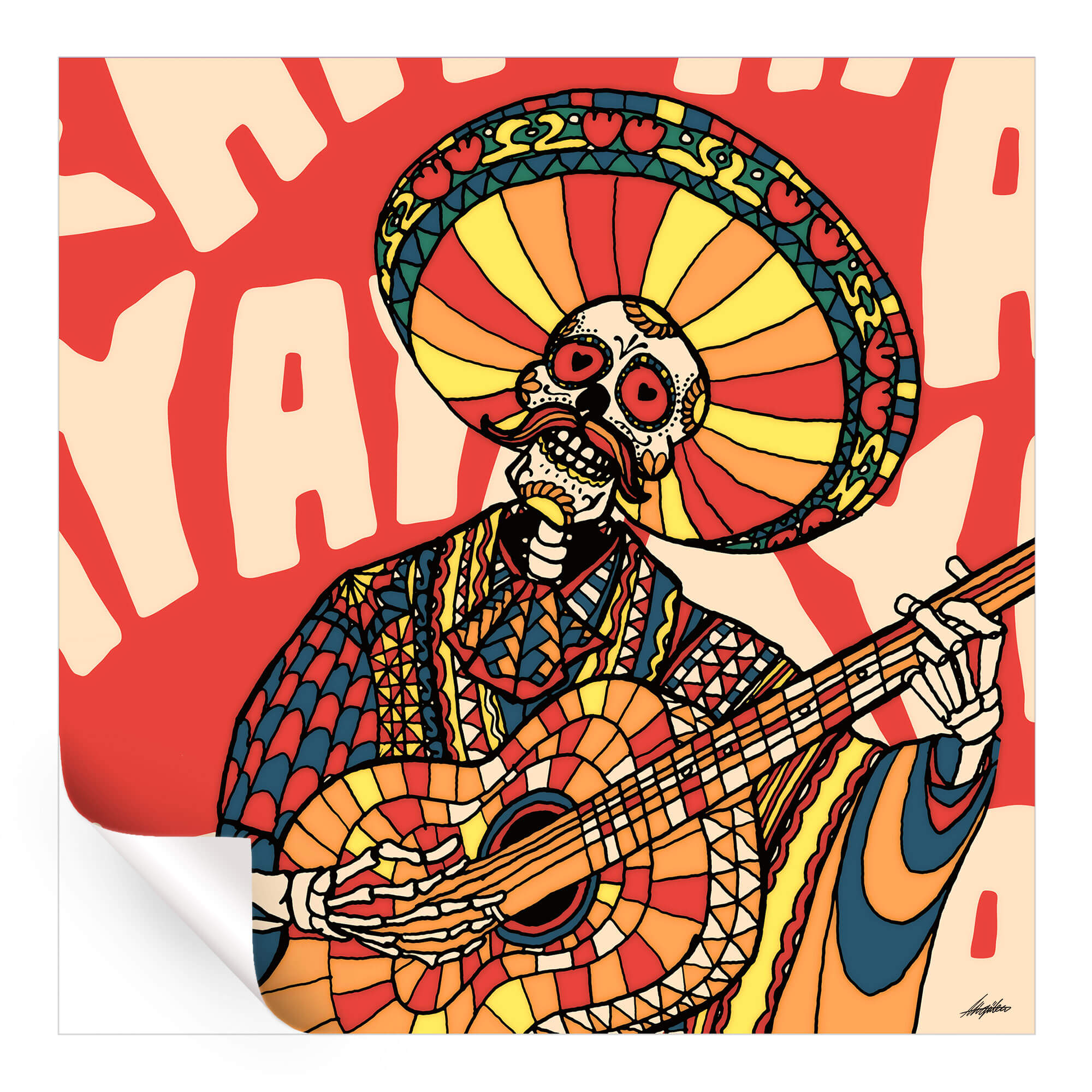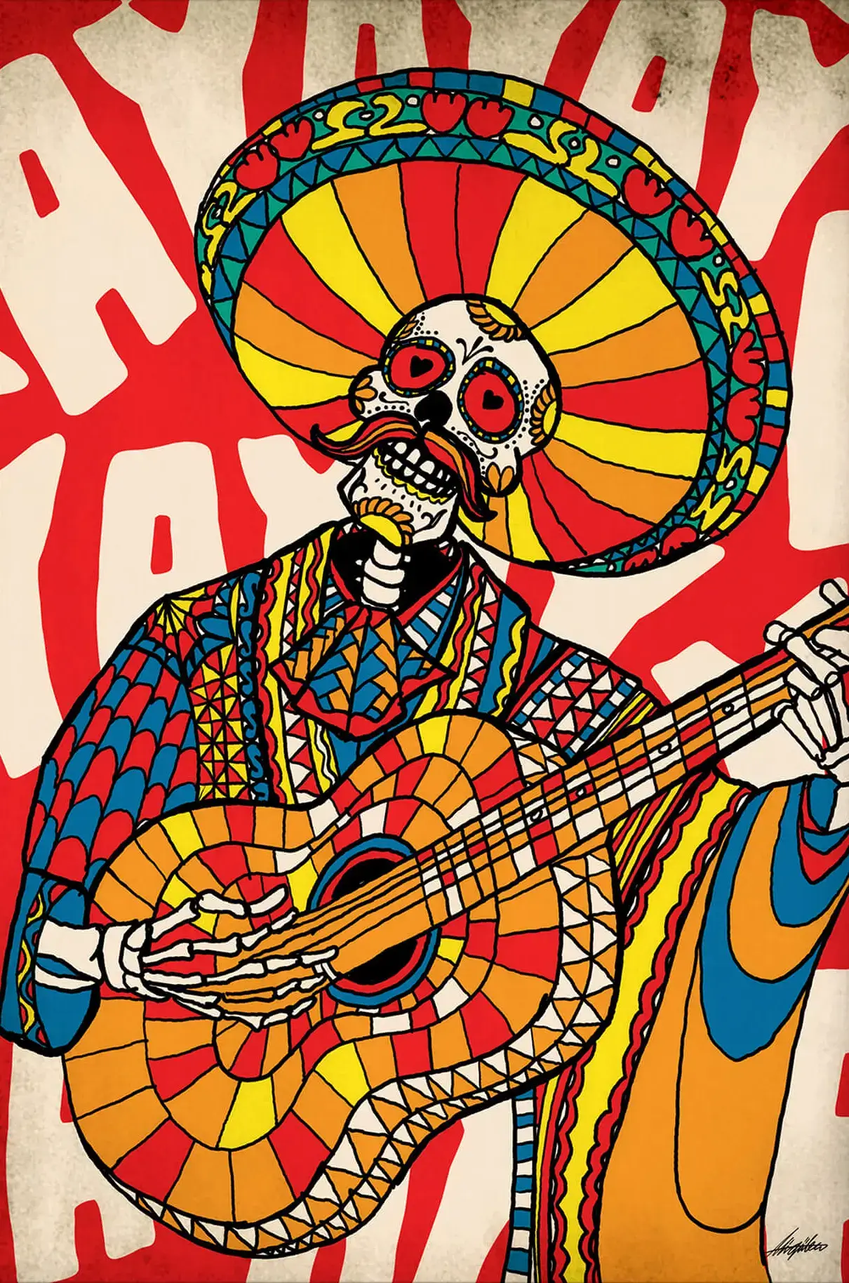Vibrant, a skeletal mariachi musician plays a guitar, bursting with color and energy. The skeleton is adorned in a traditional, multicolored mariachi outfit with intricate patterns, and a large, ornate sombrero. His face is painted in a Day of the Dead style, adding to the festive theme. The background features bold white letters, enhancing the lively atmosphere.
