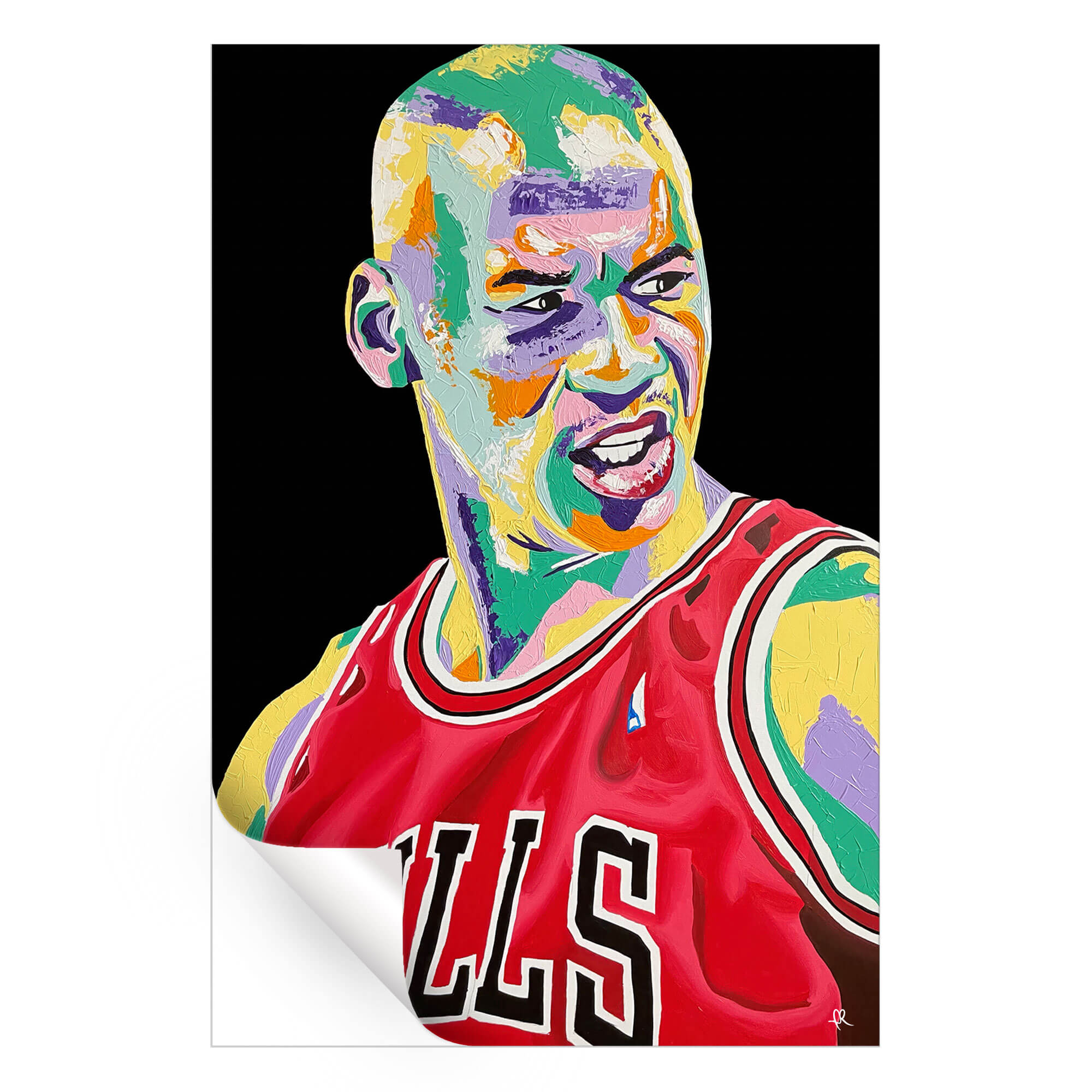 A colorful, pop art-style portrait of iconic basketball player, Michael Jordan.