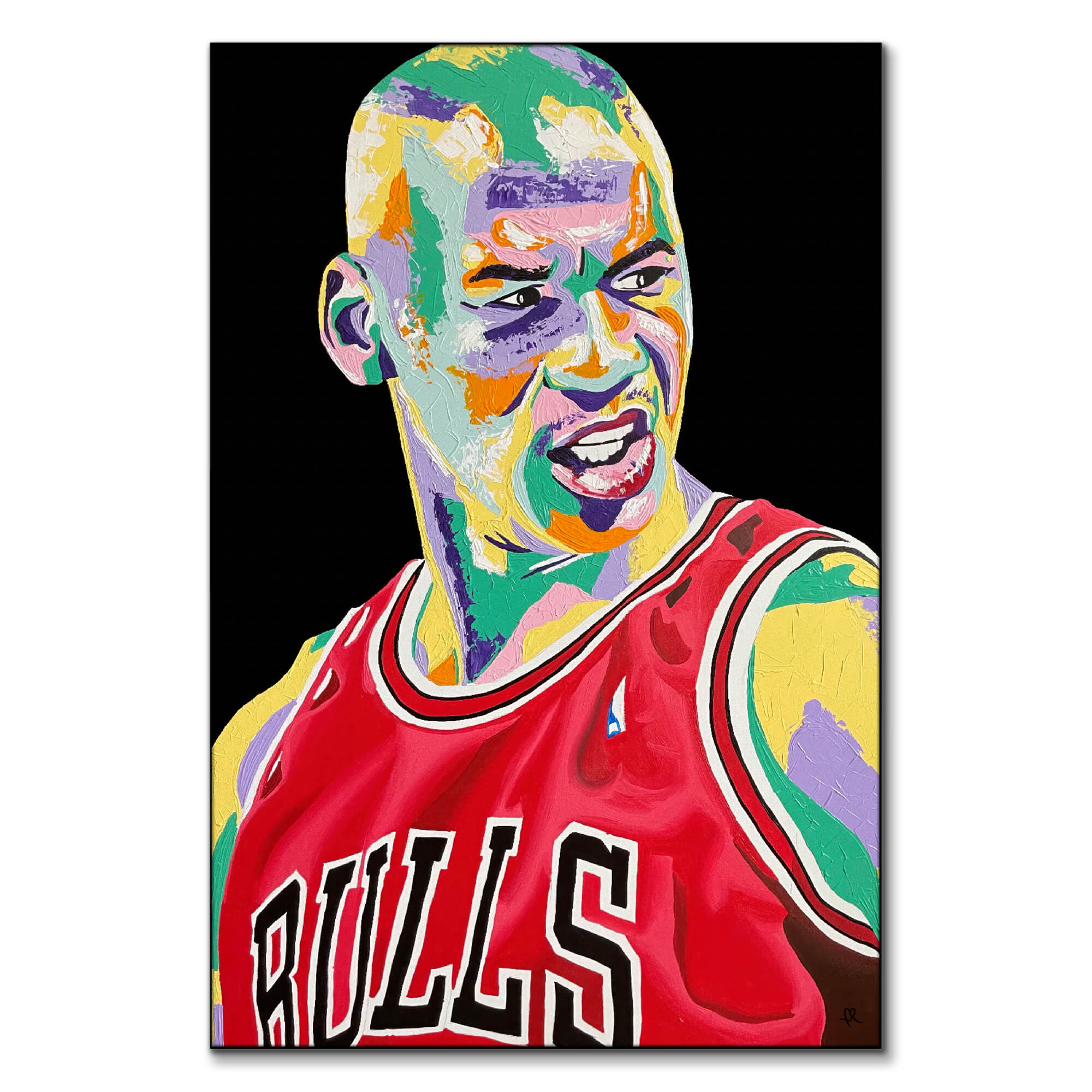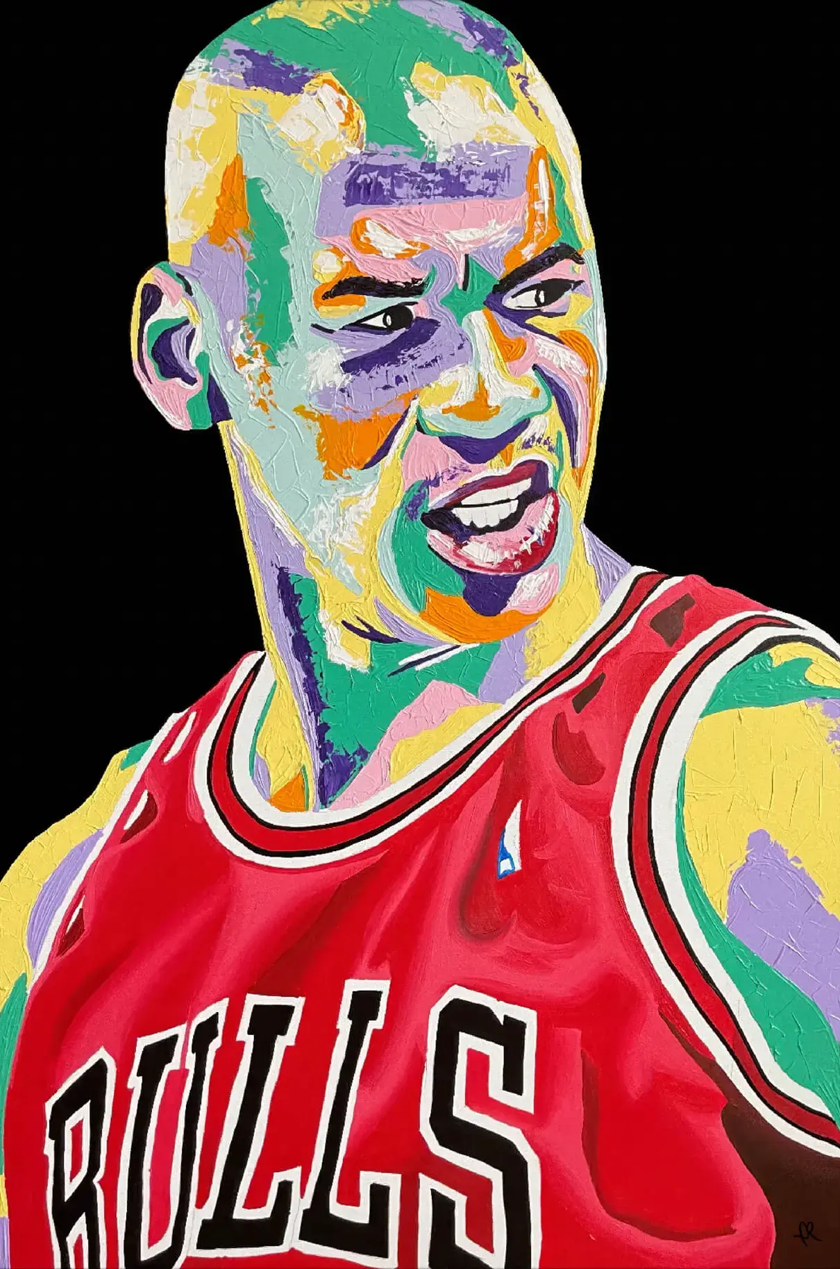 Jordan’s skin, depicted in a vibrant patchwork of colors like green, yellow, purple, and orange, contrasts with the realistically rendered bold red jersey, enhancing the painting’s abstract quality.