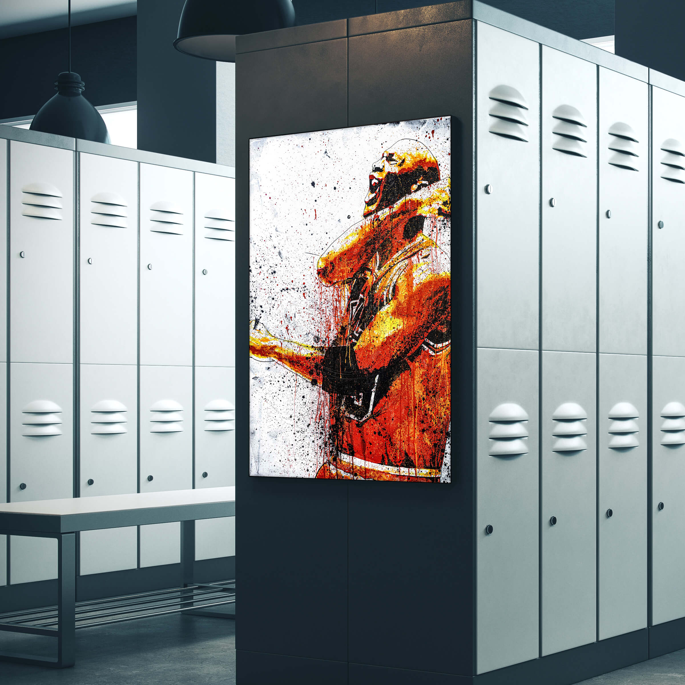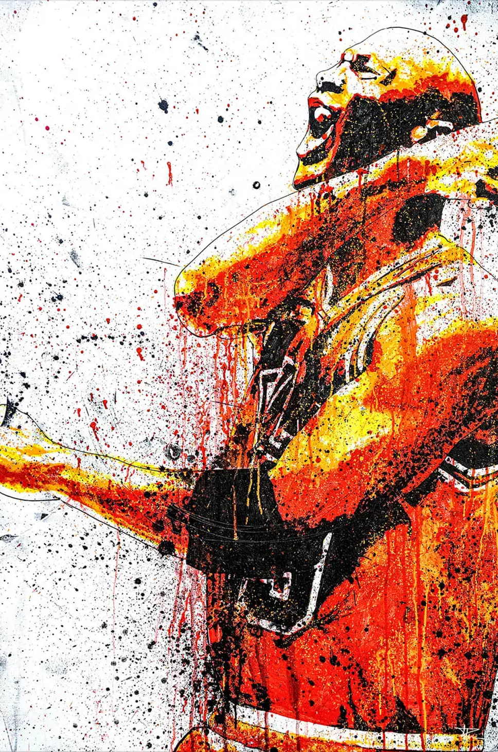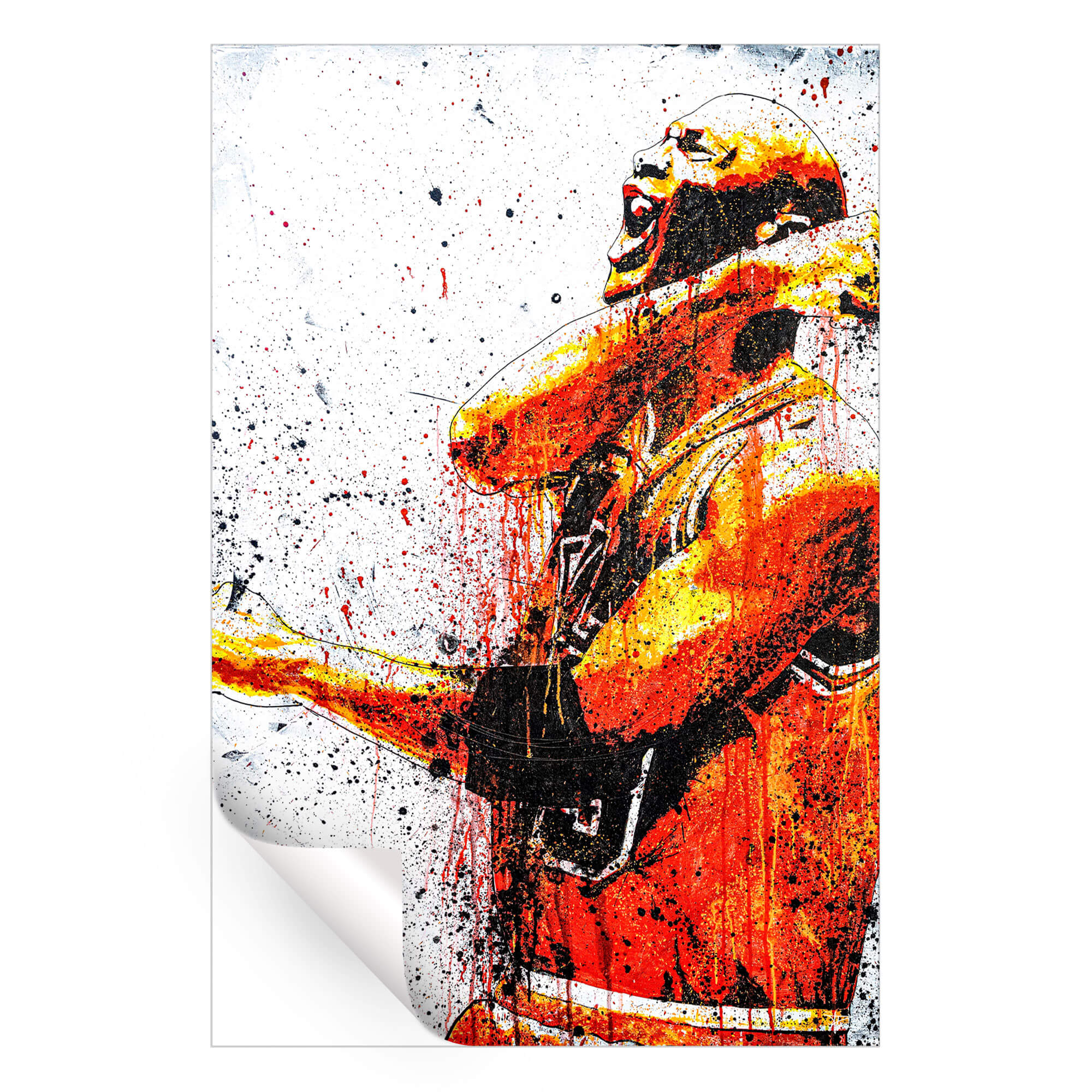 This dynamic artwork by P Muir captures the legendary energy of Michael Jordan in a burst of fiery red and vibrant yellow tones. The splatter technique used adds to the sense of motion and intensity, as if capturing a moment of explosive talent on the basketball court.
