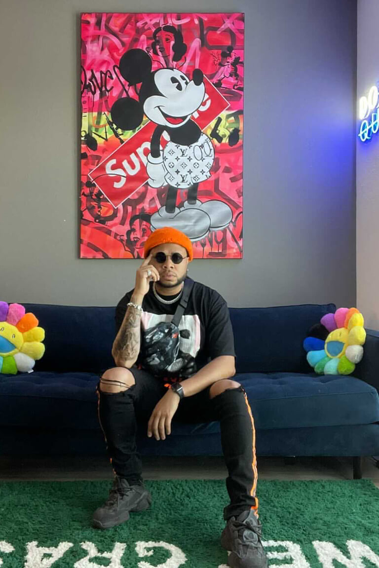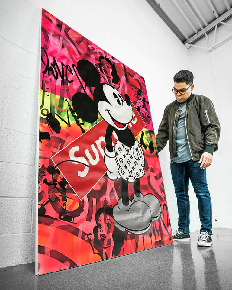 This piece melds nostalgia with contemporary street art flair, presenting a mesh of classic animation and modern design.