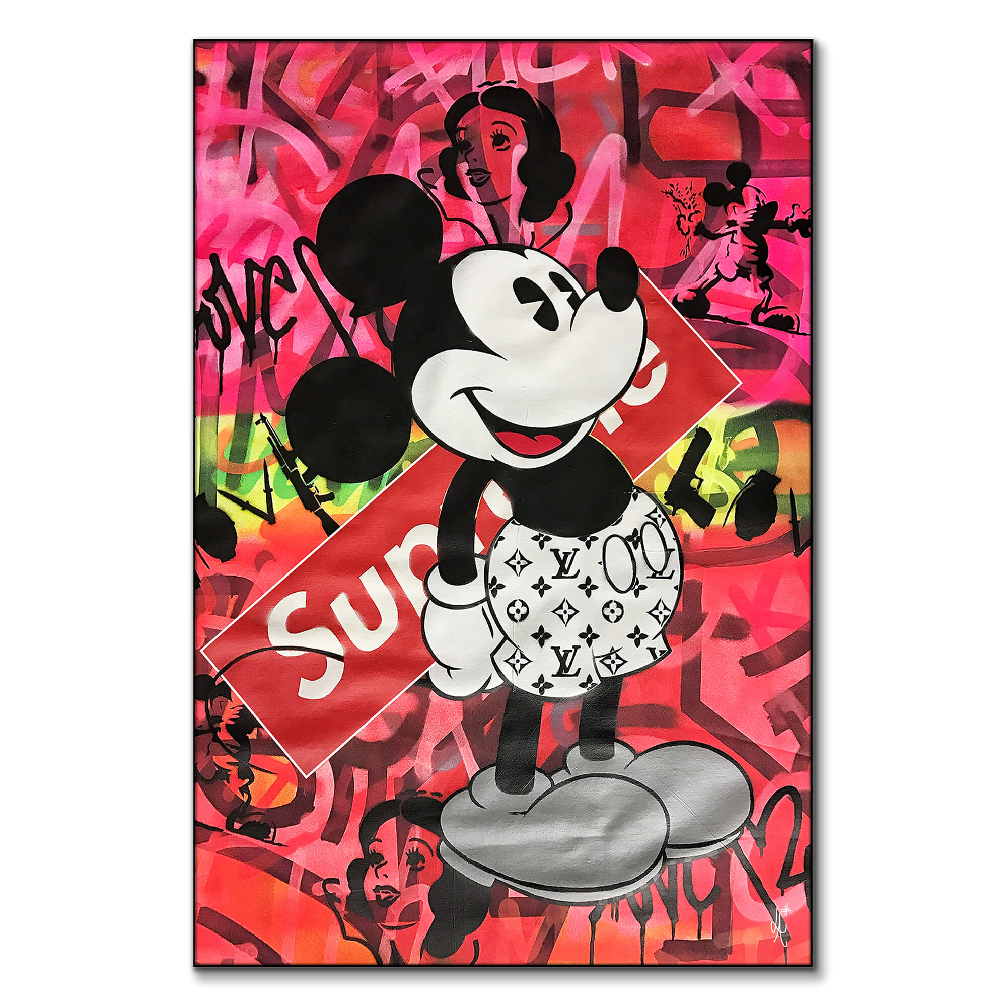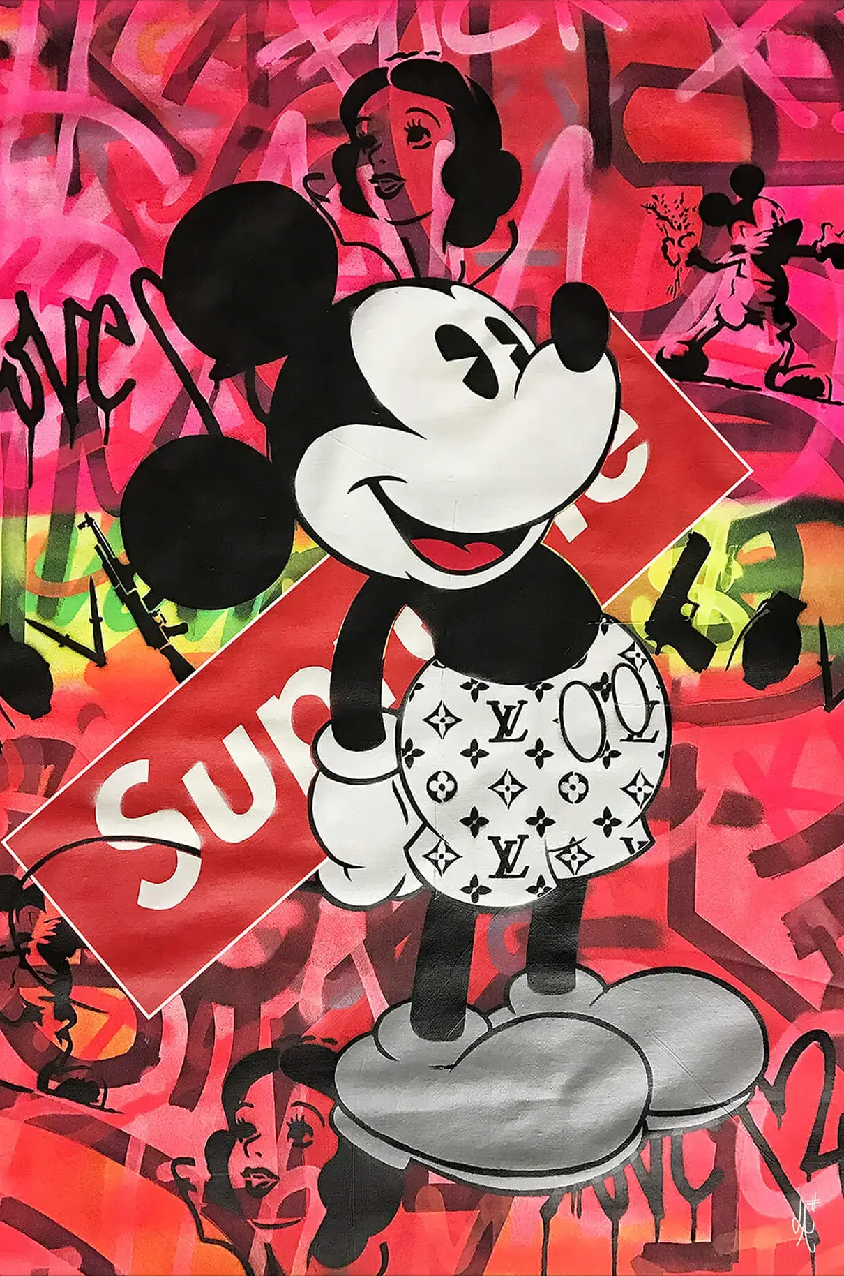 Engulfed in vibrant graffiti, this iconic Mickey Mouse art stands front and center. The character is clutching a boldly branded Supreme banner. Bold black lines define the character against a chaotic backdrop of symbols and color, with a classic cartoon companion depicted in action, adding a dynamic contrast.