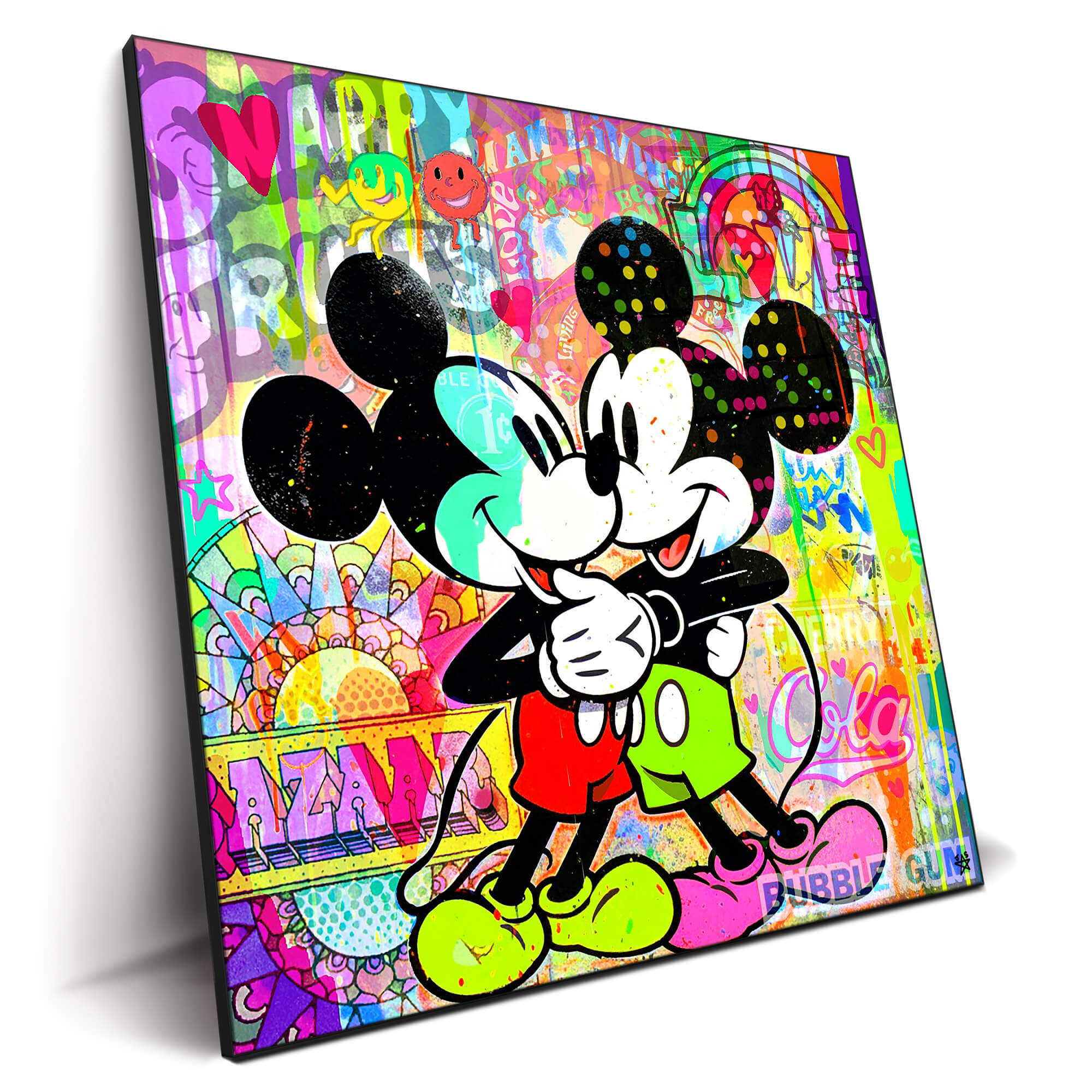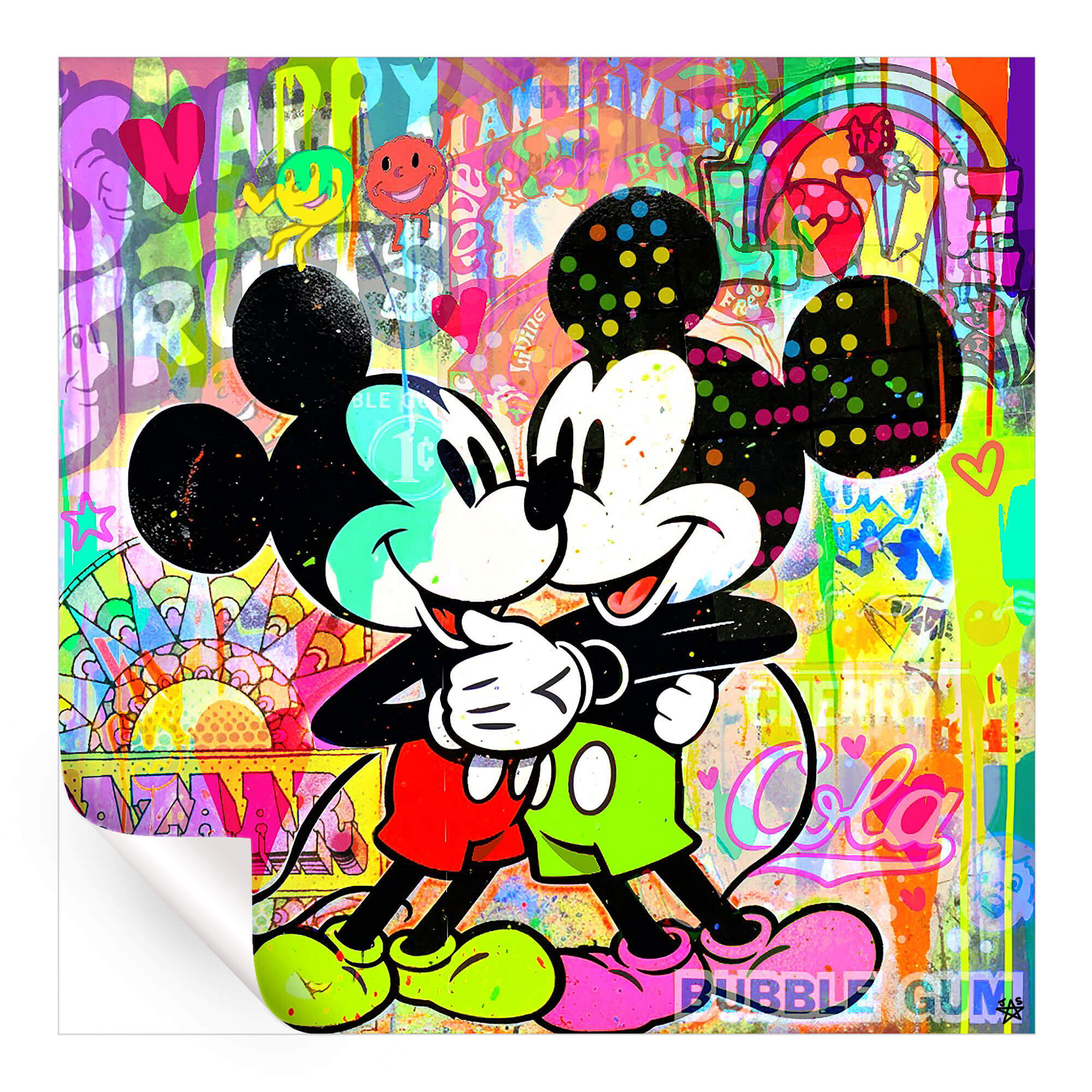Two Mickey Mice embrace in a colorful pop art collage. Both characters are in black and white, with red and green shorts. The background is a kaleidoscope of vibrant colors, words, and playful icons. Phrases and symbols like “LOVE” and smiley faces pepper the scene.
