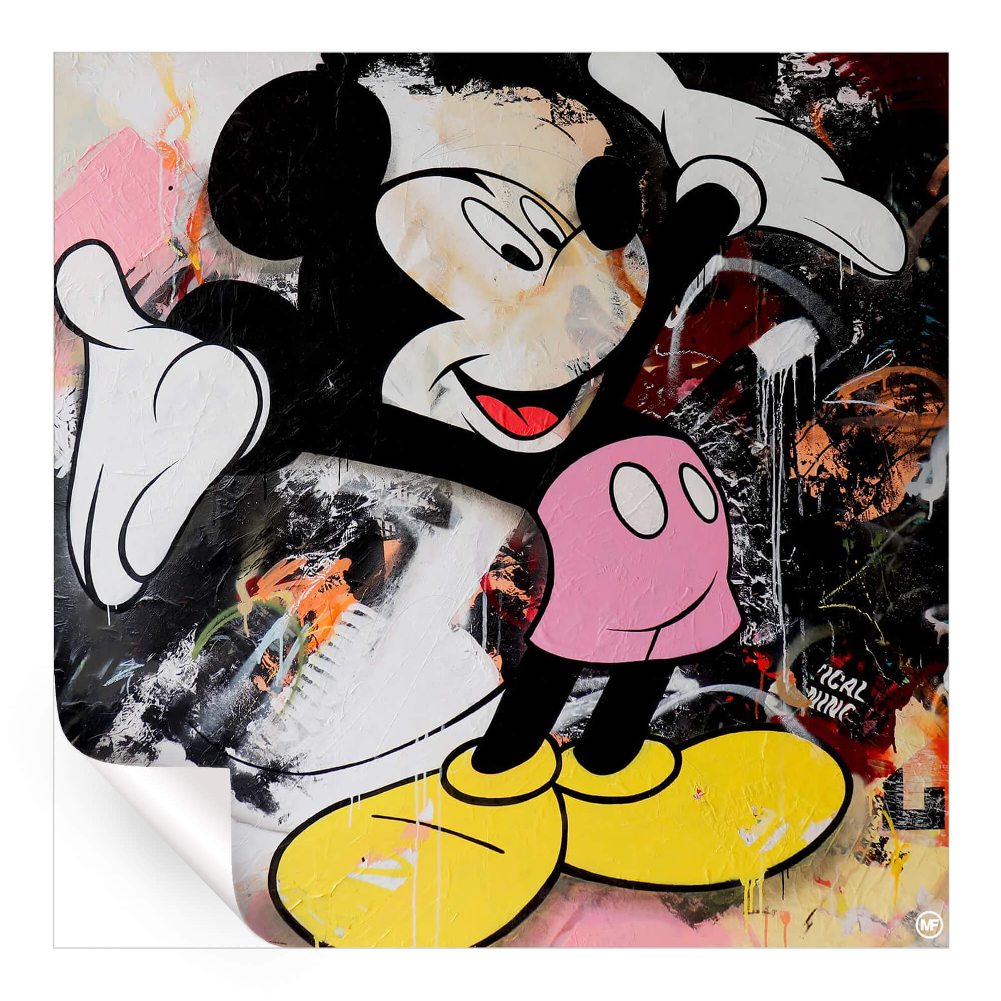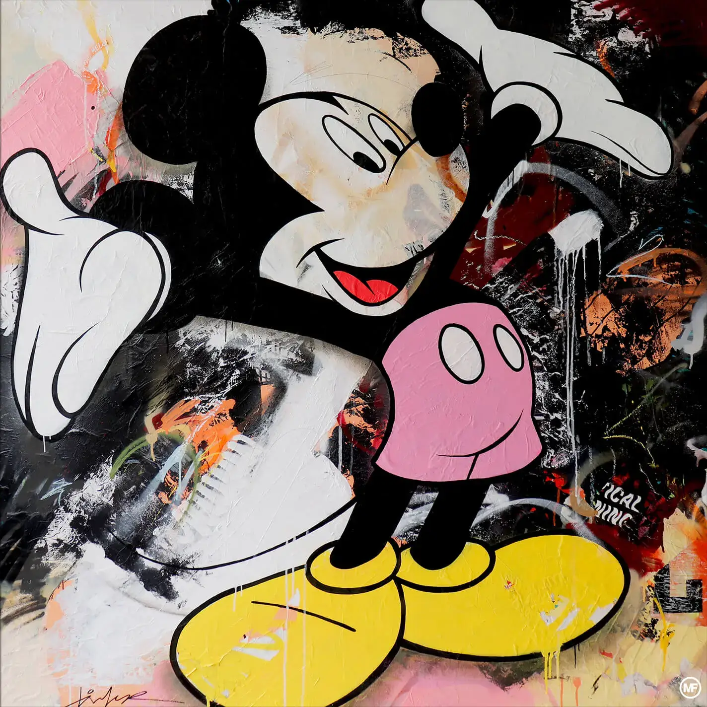 The most iconic mouse is reimagined in a burst of contemporary style. The playful juxtaposition of classic black, white, and red with a dynamic background speaks to the timeless charm of Mickey Mouse, while infusing a modern edge. Layers of abstract elements dance behind Mickey’s joyful expression, offering a fresh take on the beloved character.