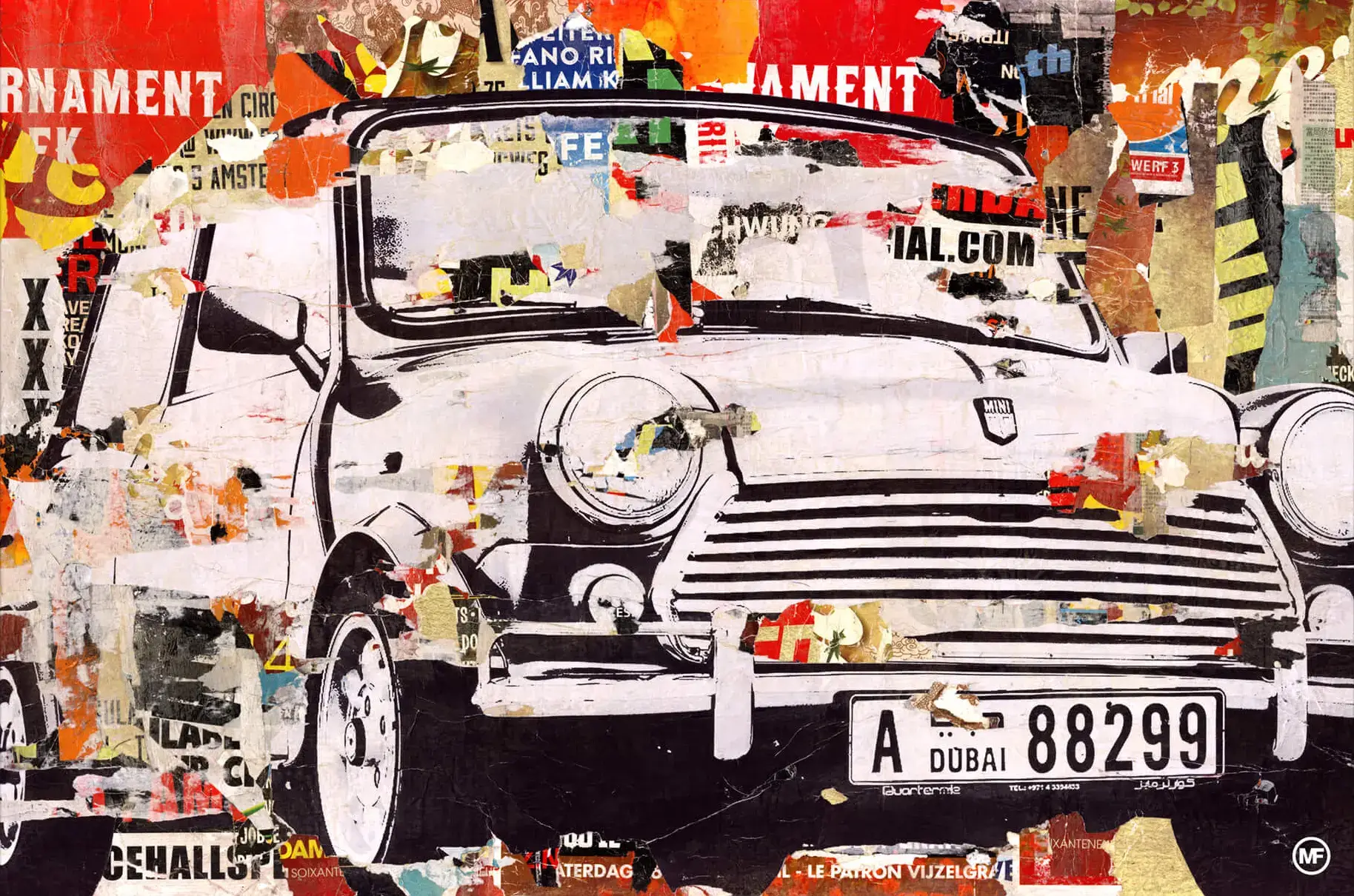 A classic Mini Cooper takes center stage, rendered in black and white against a collage that sings with color and text. The backdrop is a patchwork of advertisements and graffiti, echoing the car’s cultural journey through the ages.