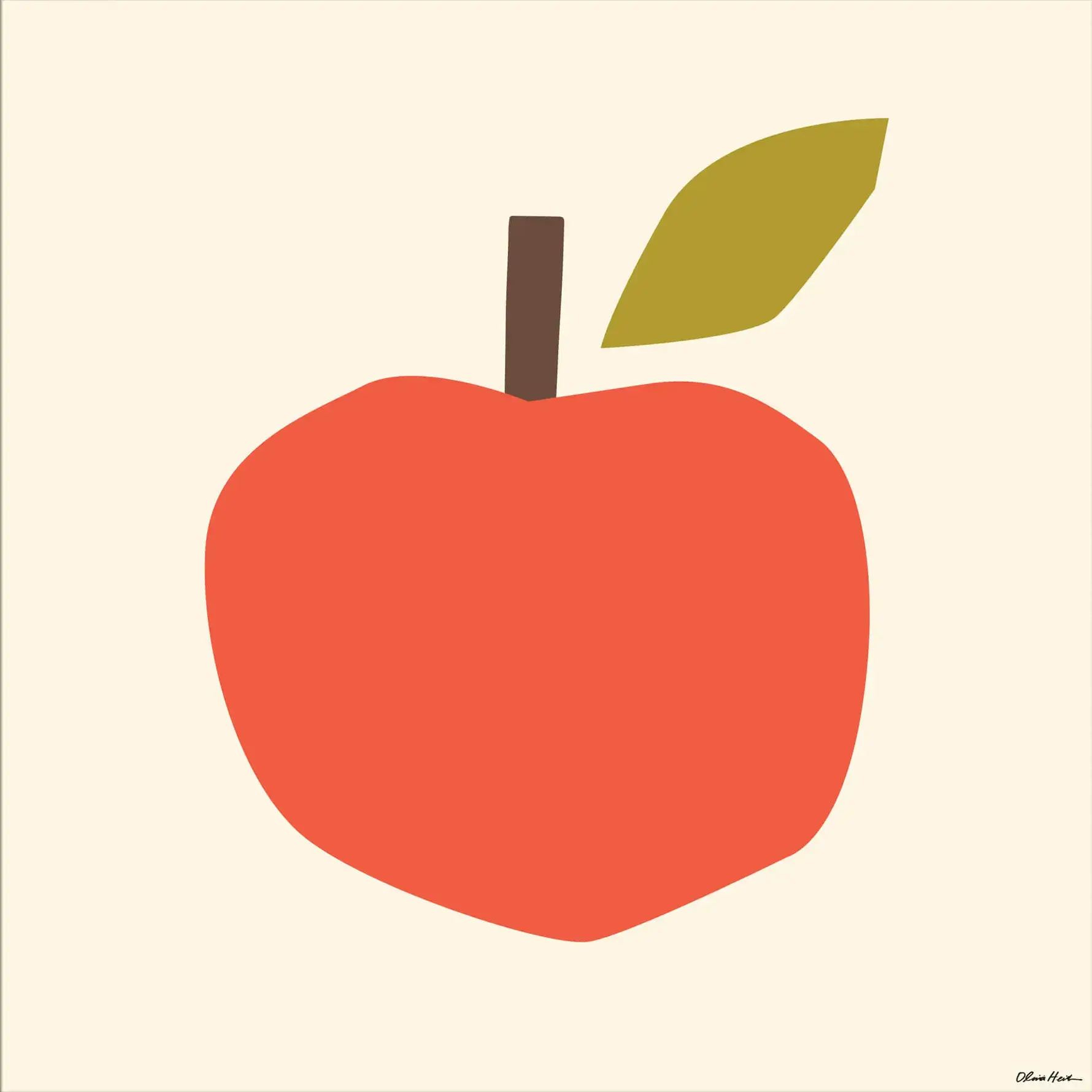 This minimalist artwork features a stylized red apple with a crisp, clean outline against a neutral background. The apple, with its bold color and simple brown stem with a single green leaf, embodies freshness and simplicity.