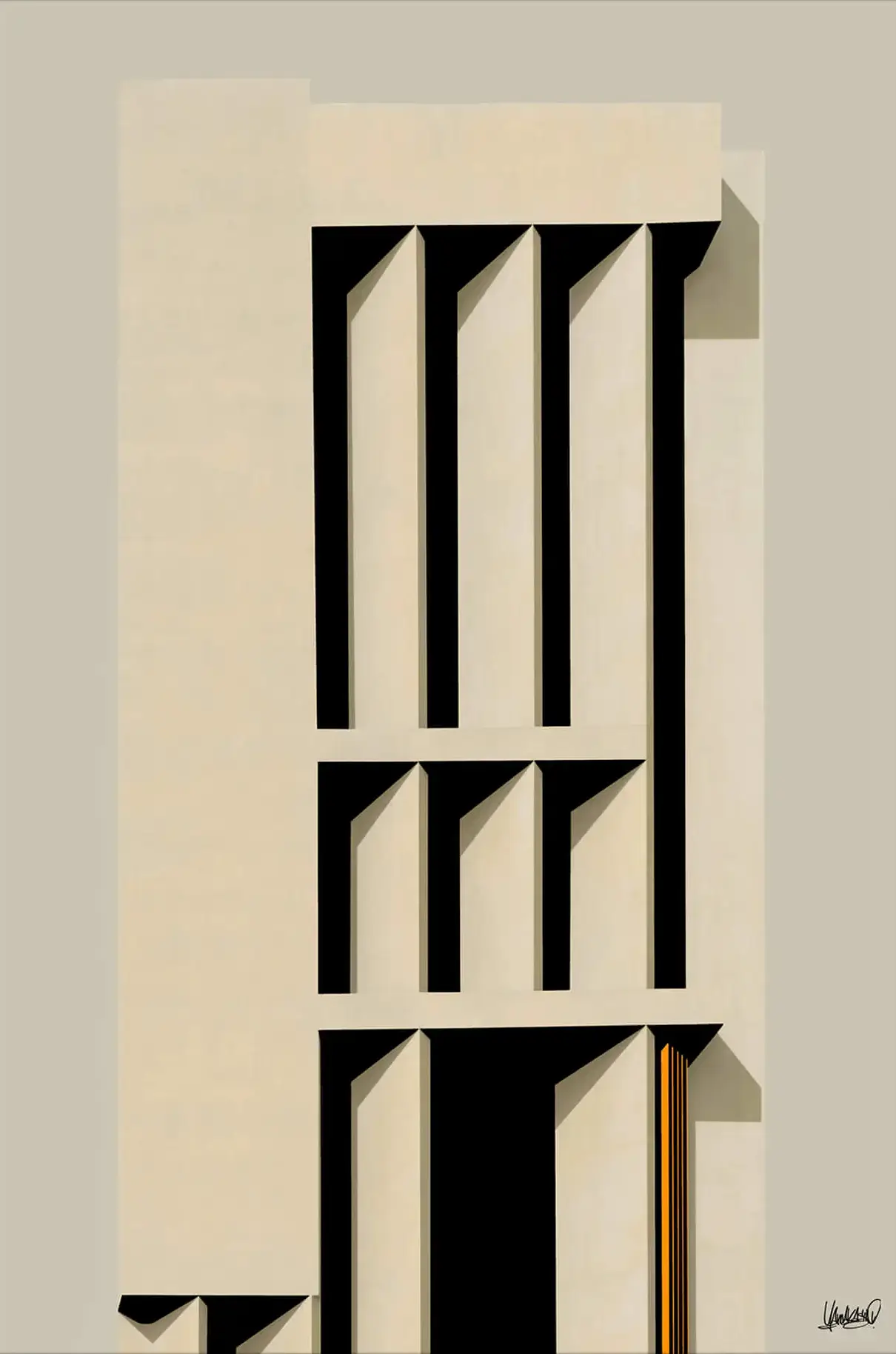Elegant, a minimalist architectural facade features clean, vertical lines in a subtle beige tone. The strong shadows cast by the sun create a dramatic exchange of light and dark, emphasizing the depth and geometric precision of the design. The simplicity and symmetry of the vertical elements draw the eye, giving the structure a refined and modern appearance.
