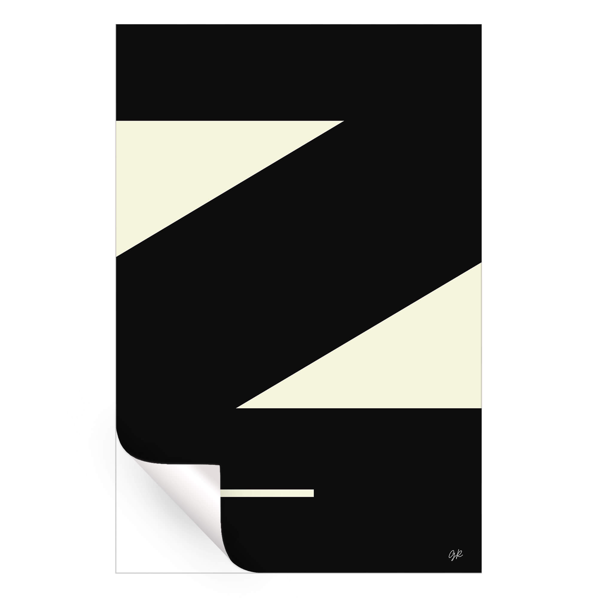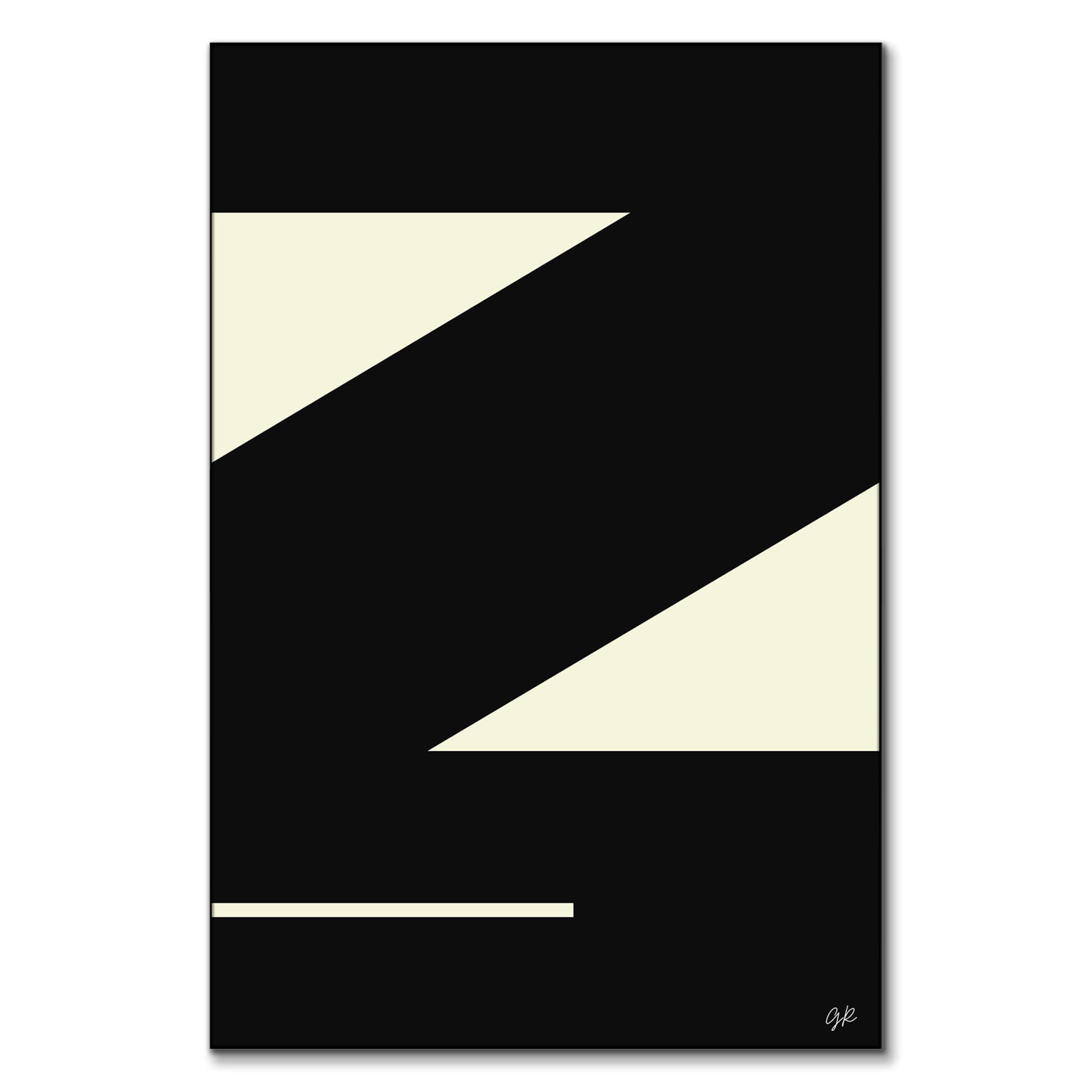 A stark contrast of cream and black shapes creates a bold, abstract design. Diagonal lines cut through the space, segmenting the composition into dynamic triangular forms. A solitary horizontal cream bar lies at the base, anchoring the visual movement implied by the diagonals.