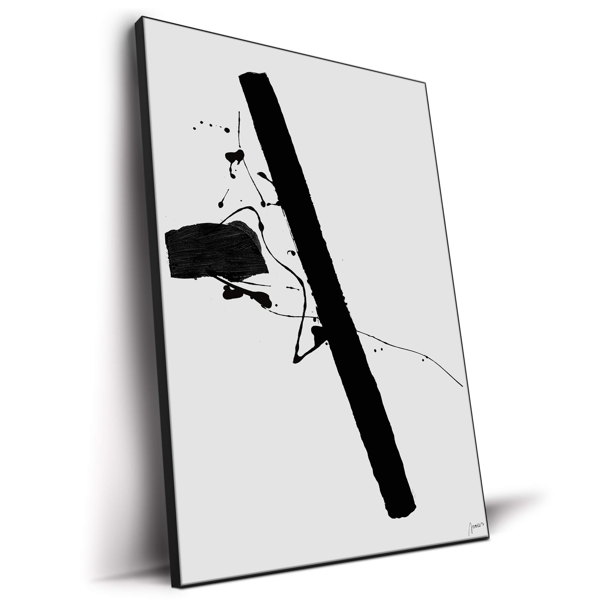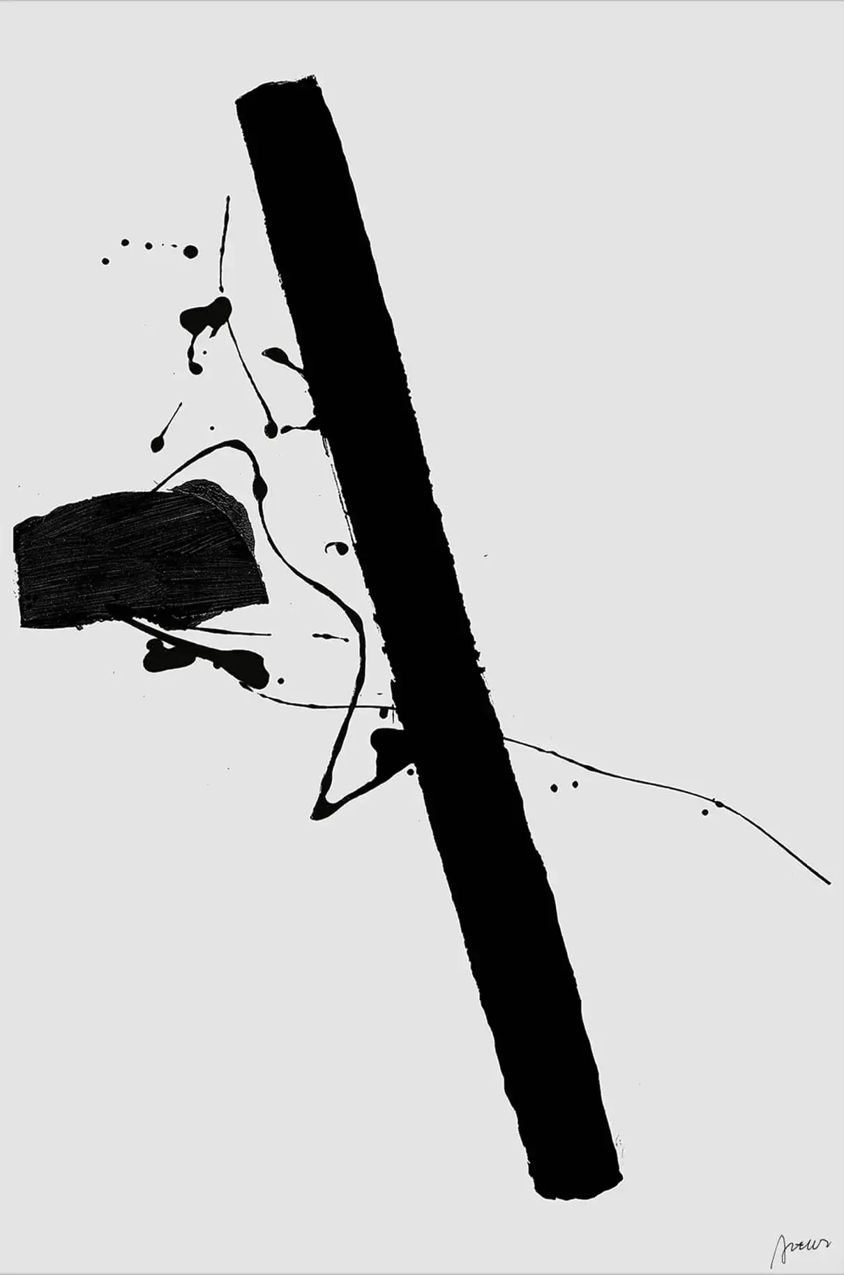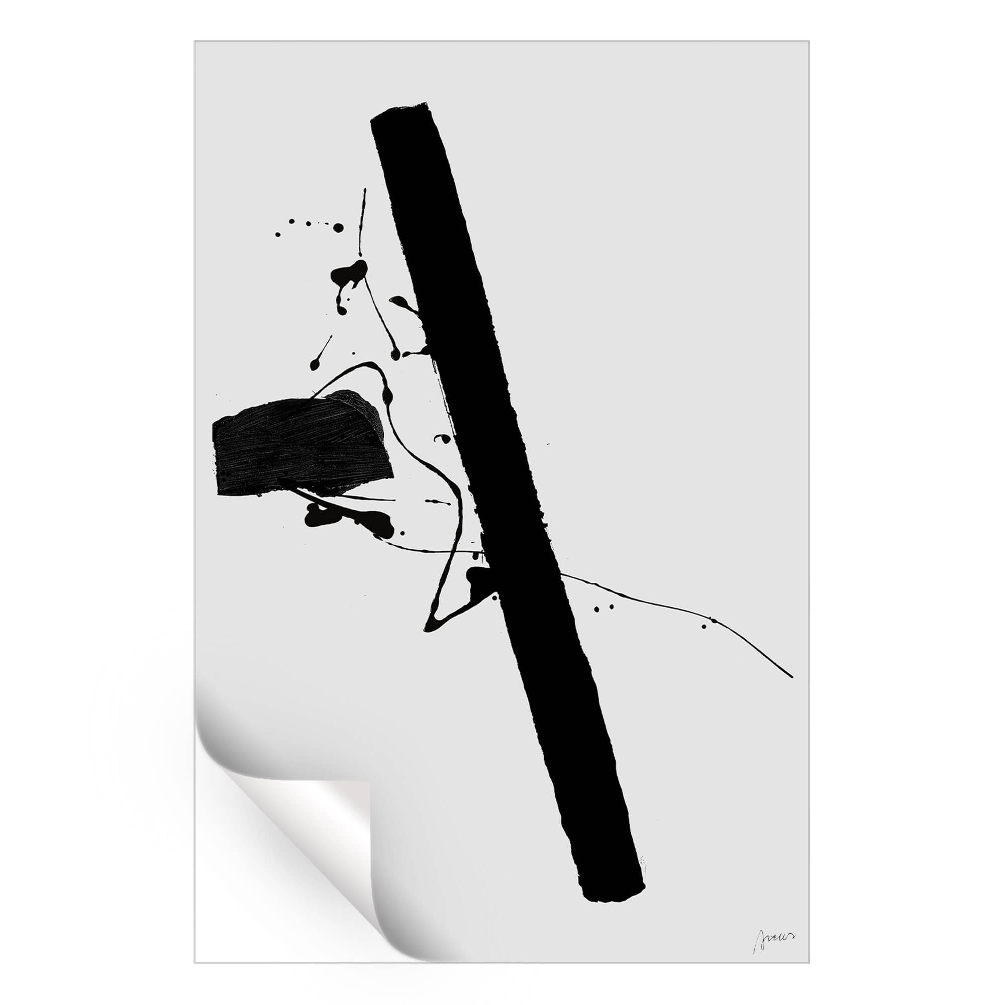 A bold black vertical line slices through the blank space, accompanied by a dense block of color to its right. Flecks and splatters of black ink dot the surroundings, as if capturing a moment of creation in an otherwise undisturbed void. The randomness of the splashes against the deliberate stroke create an impactful visual tension.