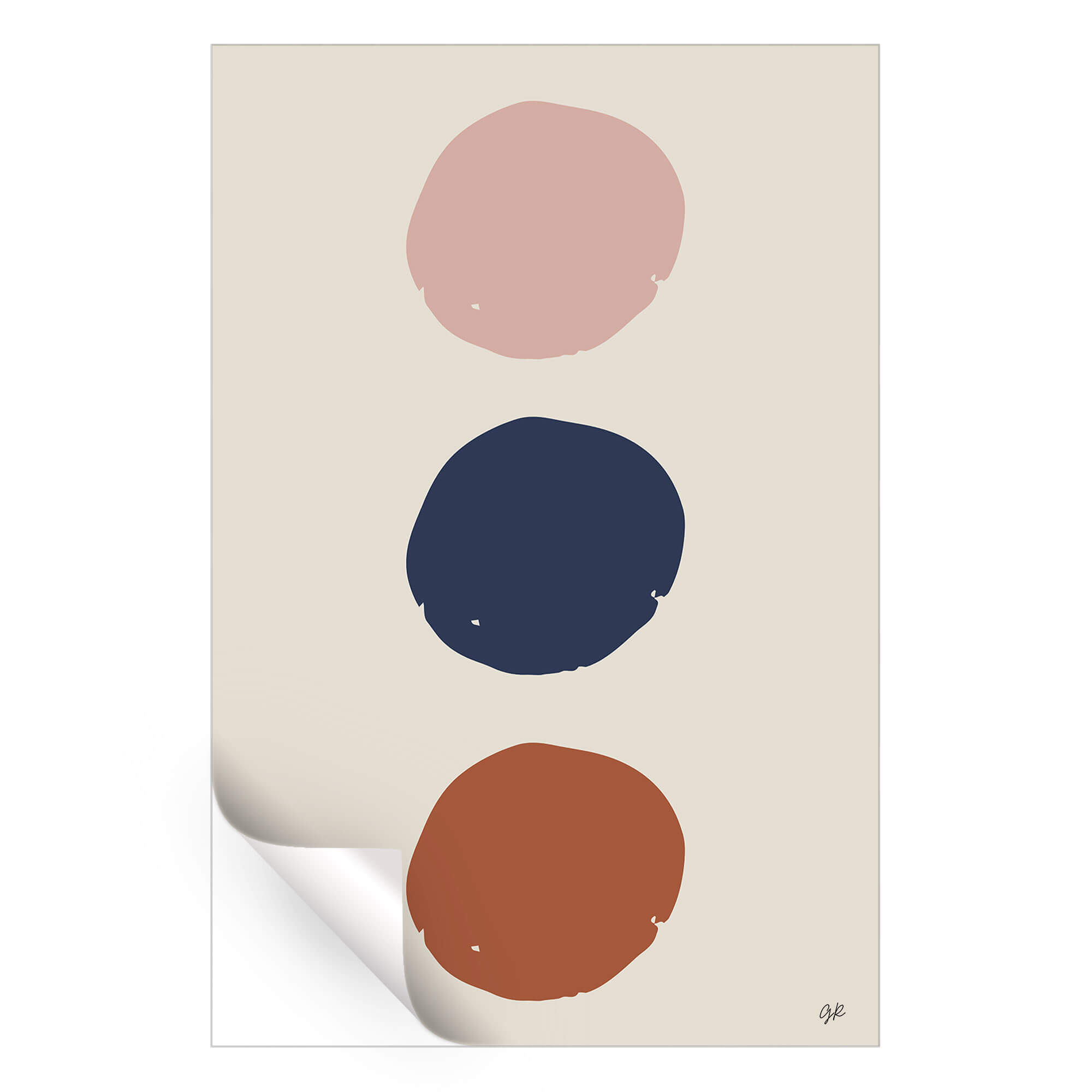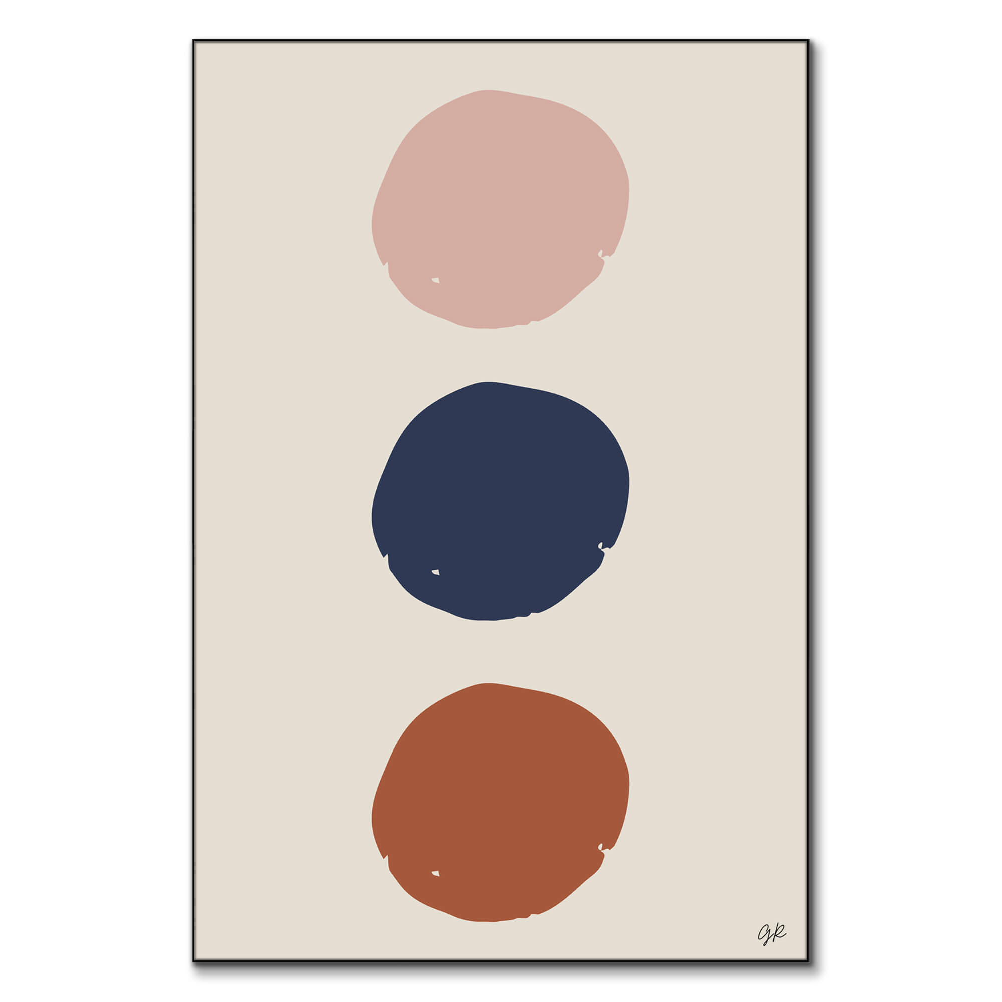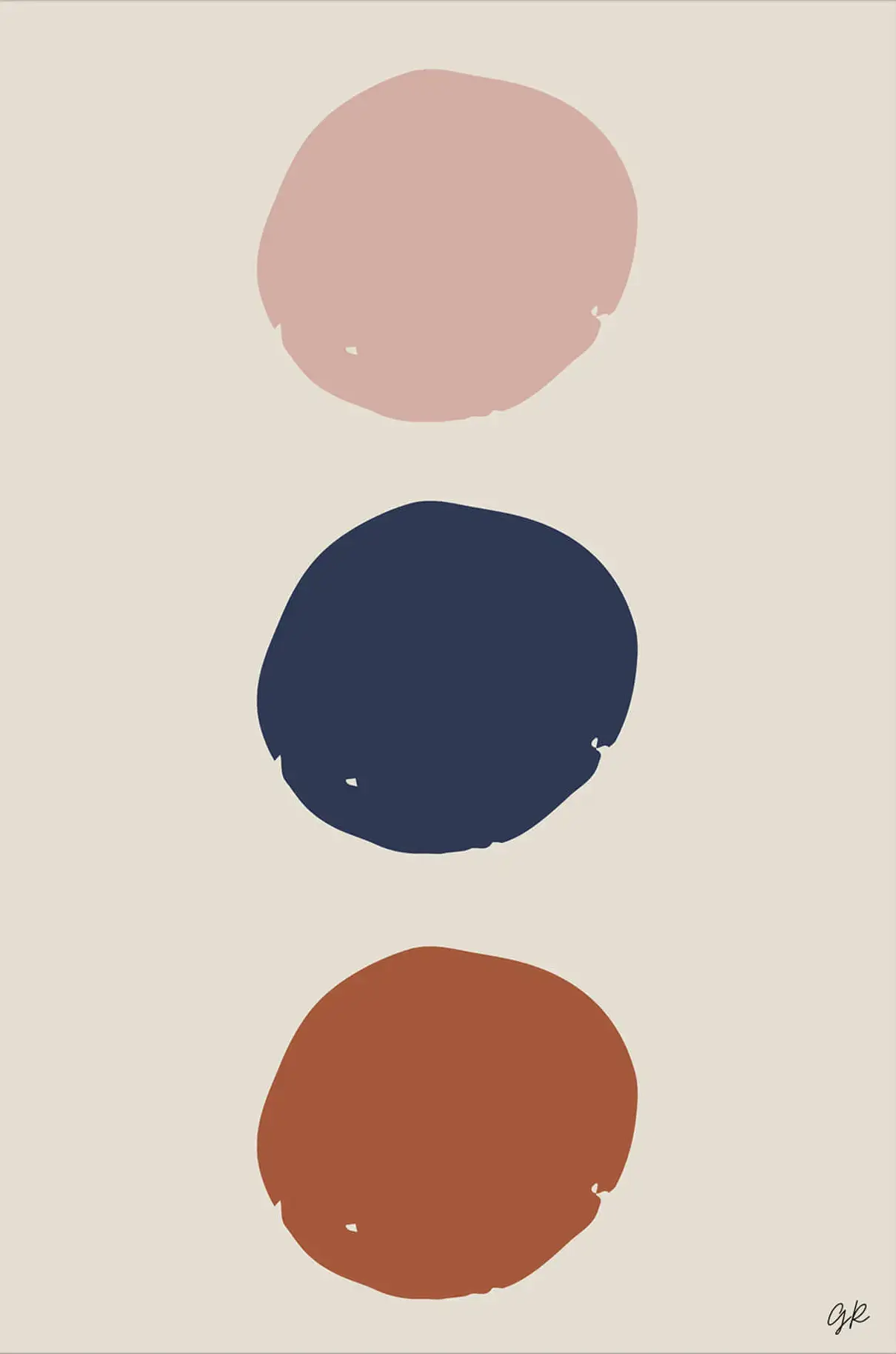 Three oval shapes in a vertical arrangement provide a study in color and form. The topmost is a light blush, the middle a deep navy, and the bottom a rich terra cotta. Each appears softly brushed against a pale background, their imperfect edges adding a handcrafted quality to the simplicity of the design.
