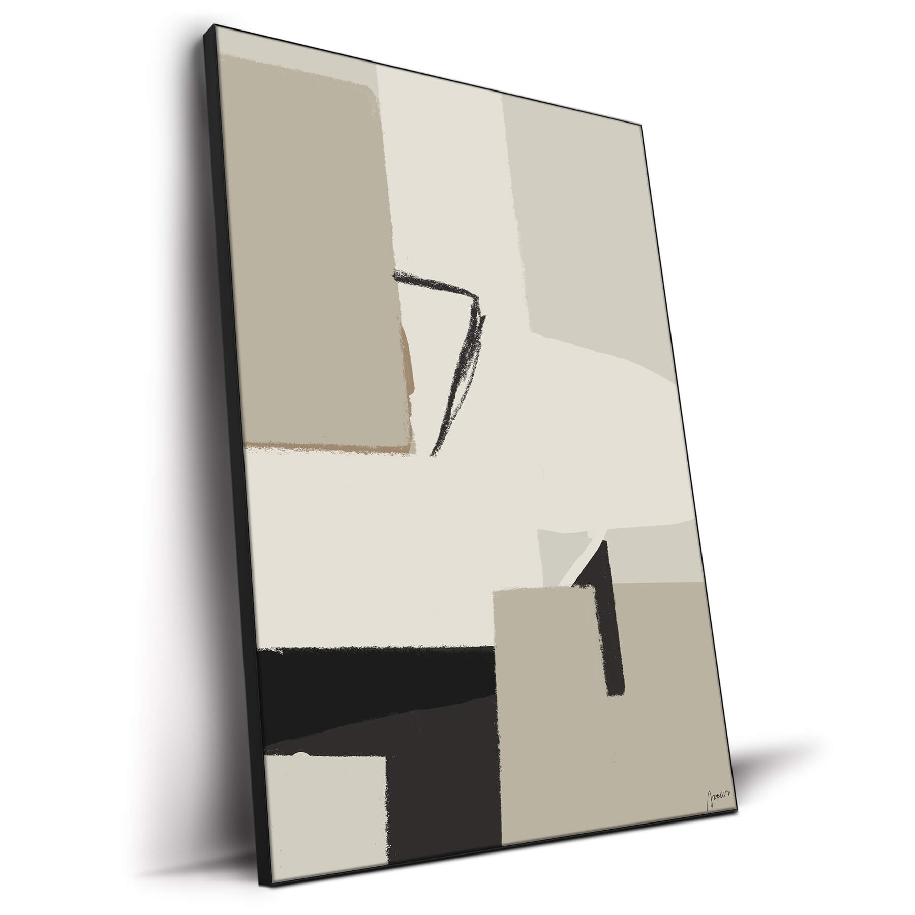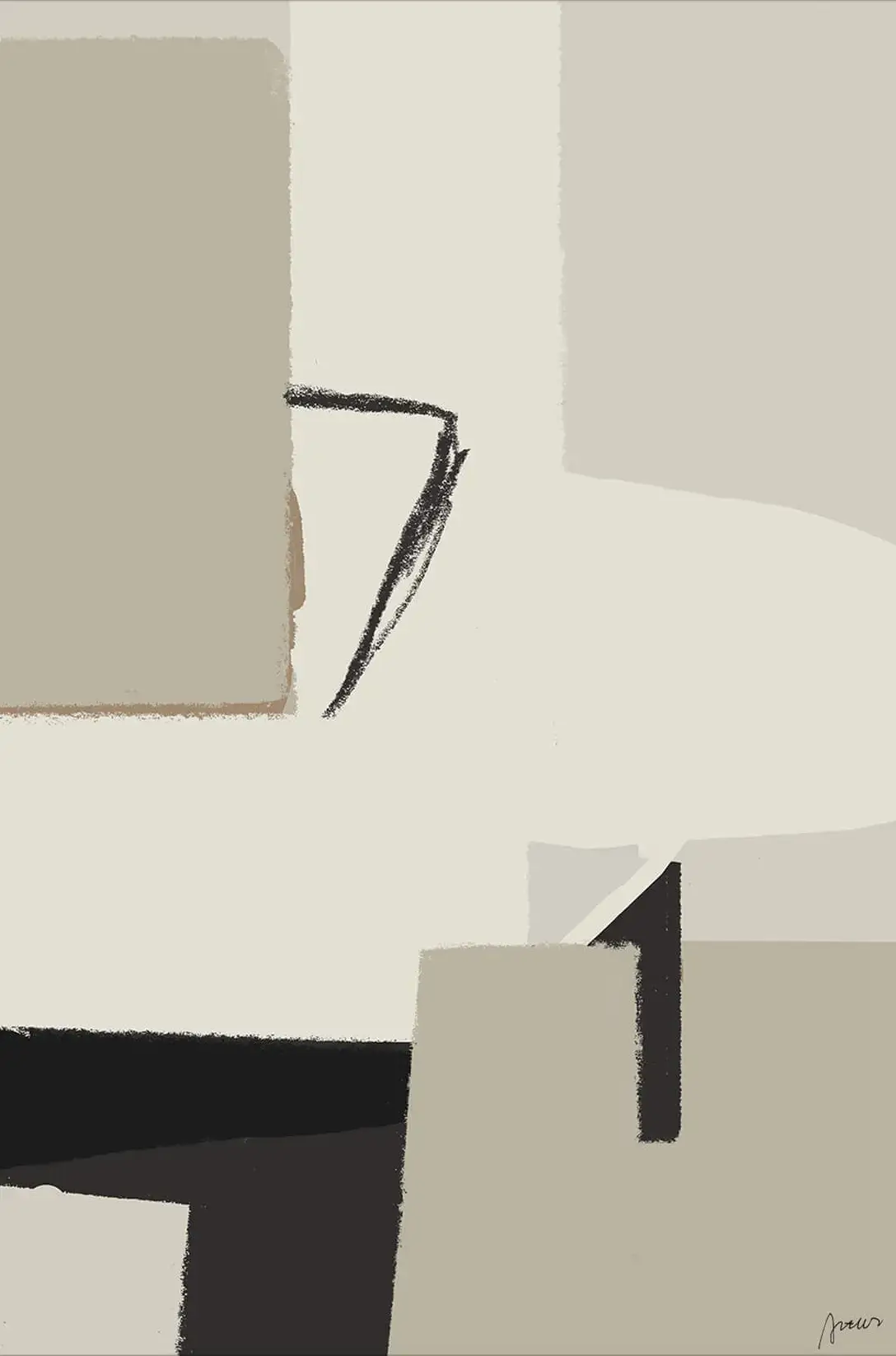 Geometric forms in shades of tan, cream, and black are arranged in a composition that is both balanced and spontaneous. Sharp lines intersect with softer shapes, creating an intriguing visual dialogue. The simplicity of the palette is enlivened by the dynamic tension between the elements, suggesting both structure and the possibility of narratives within the abstract space.