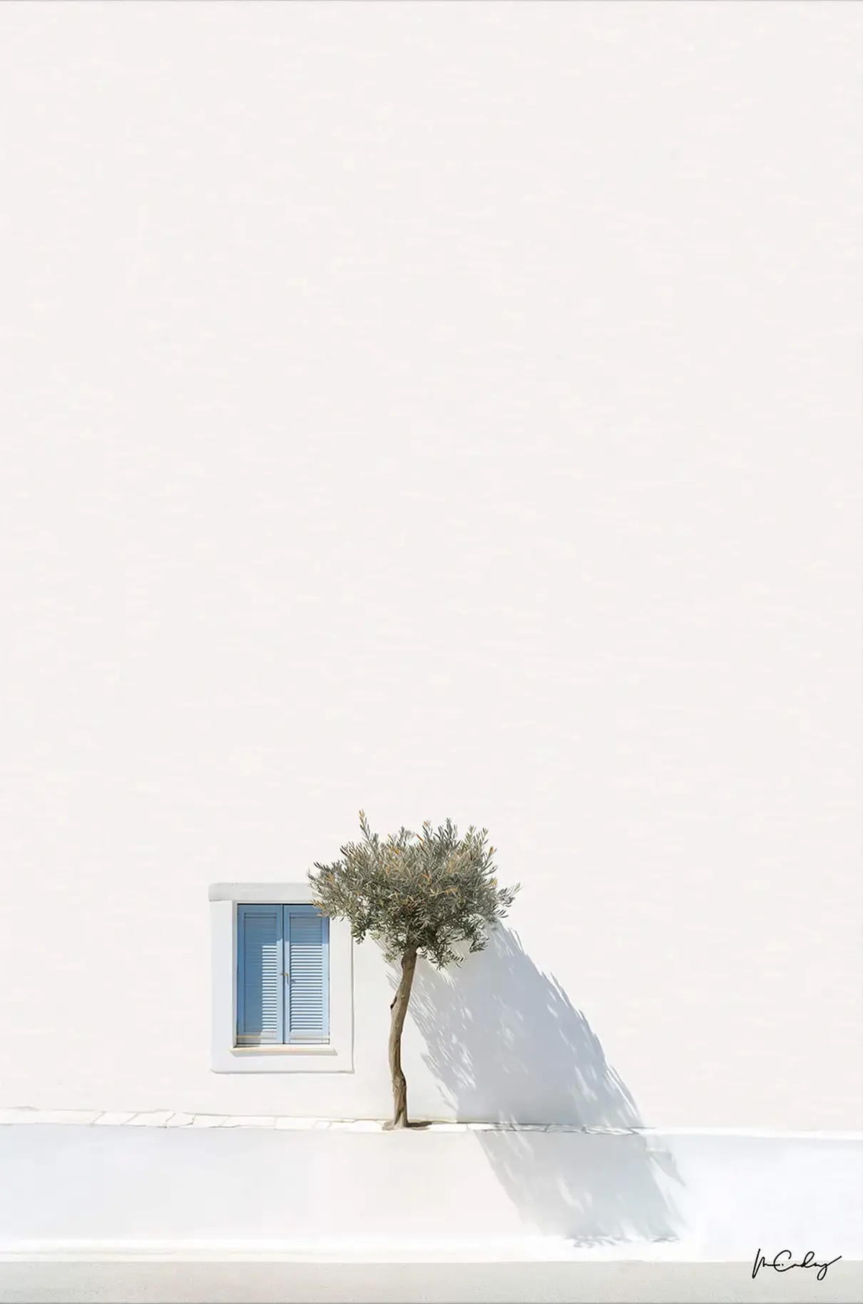 Sun-bleached white fills almost the entire vertical frame, turning the wall into an endless sheet of light. Near the base, a slim olive tree rises, its muted green crown only slightly wider than the rough, sun-tanned trunk. A cool grey shadow slants behind it, echoing the tree’s posture against the blank façade. To the left of the trunk, a small window with powder-blue shutters punctuates the scene, adding a crisp accent of color. The composition feels quiet, allowing the rays, the wall and a single branch to set the rhythm.