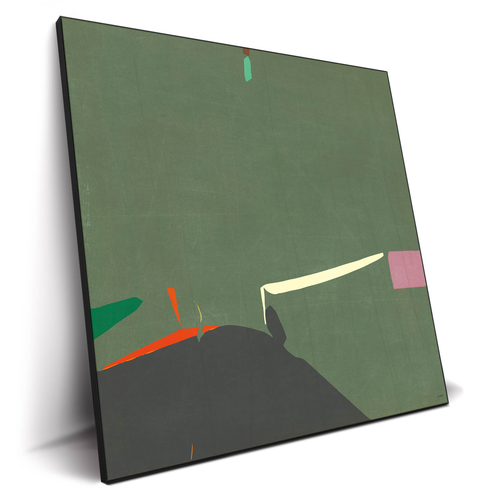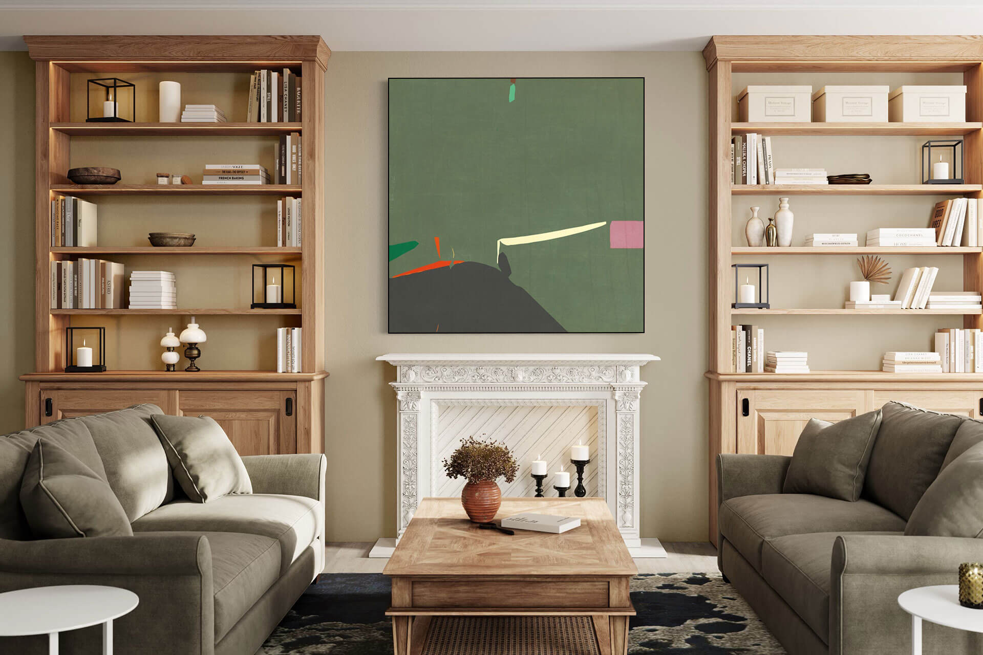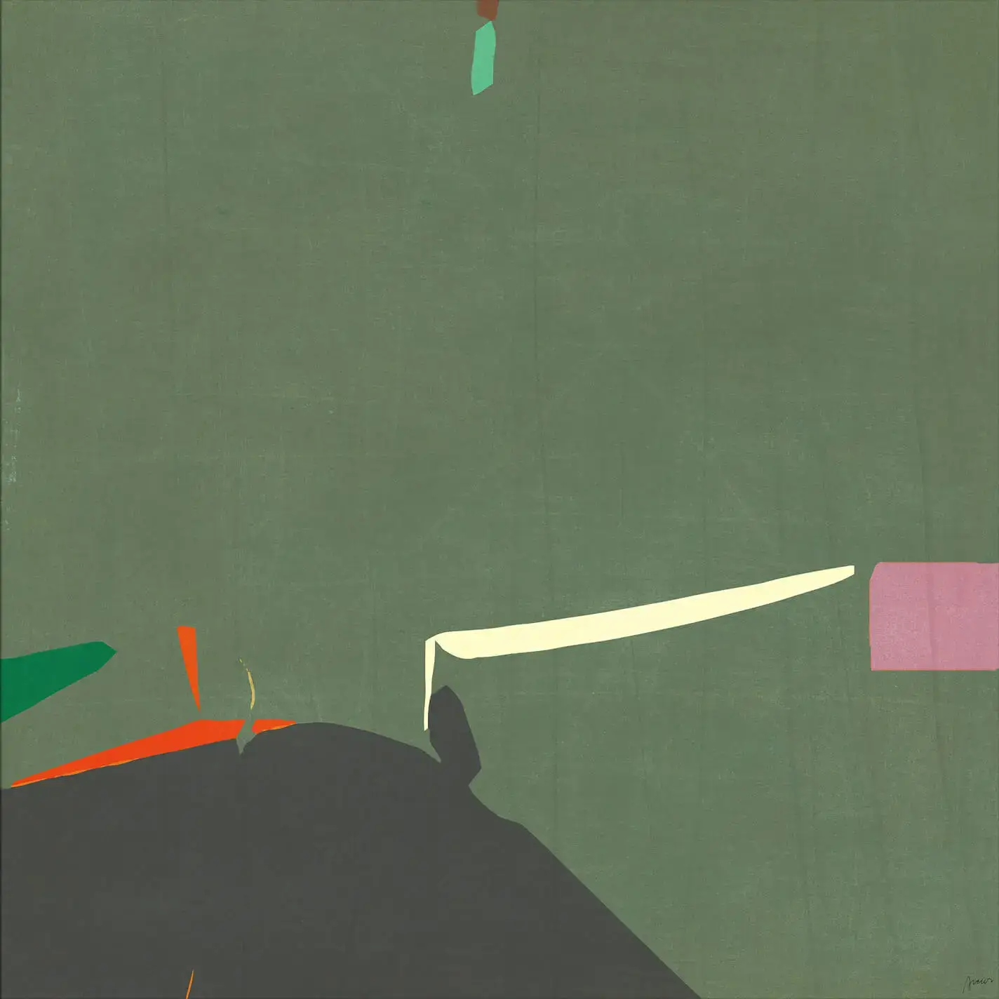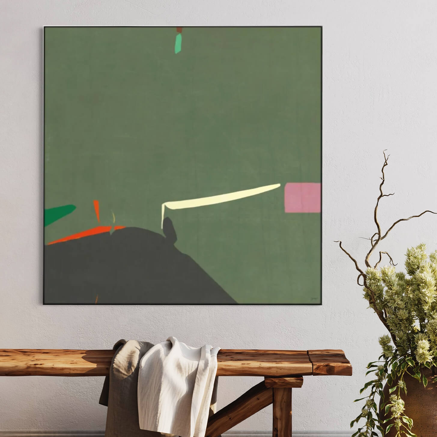 Geometric shapes in a palette of understated greens, blacks, and pops of brighter colors like red and teal create a calm yet playful composition. The dark silhouette of a hill-like form anchors the lower part of the piece.