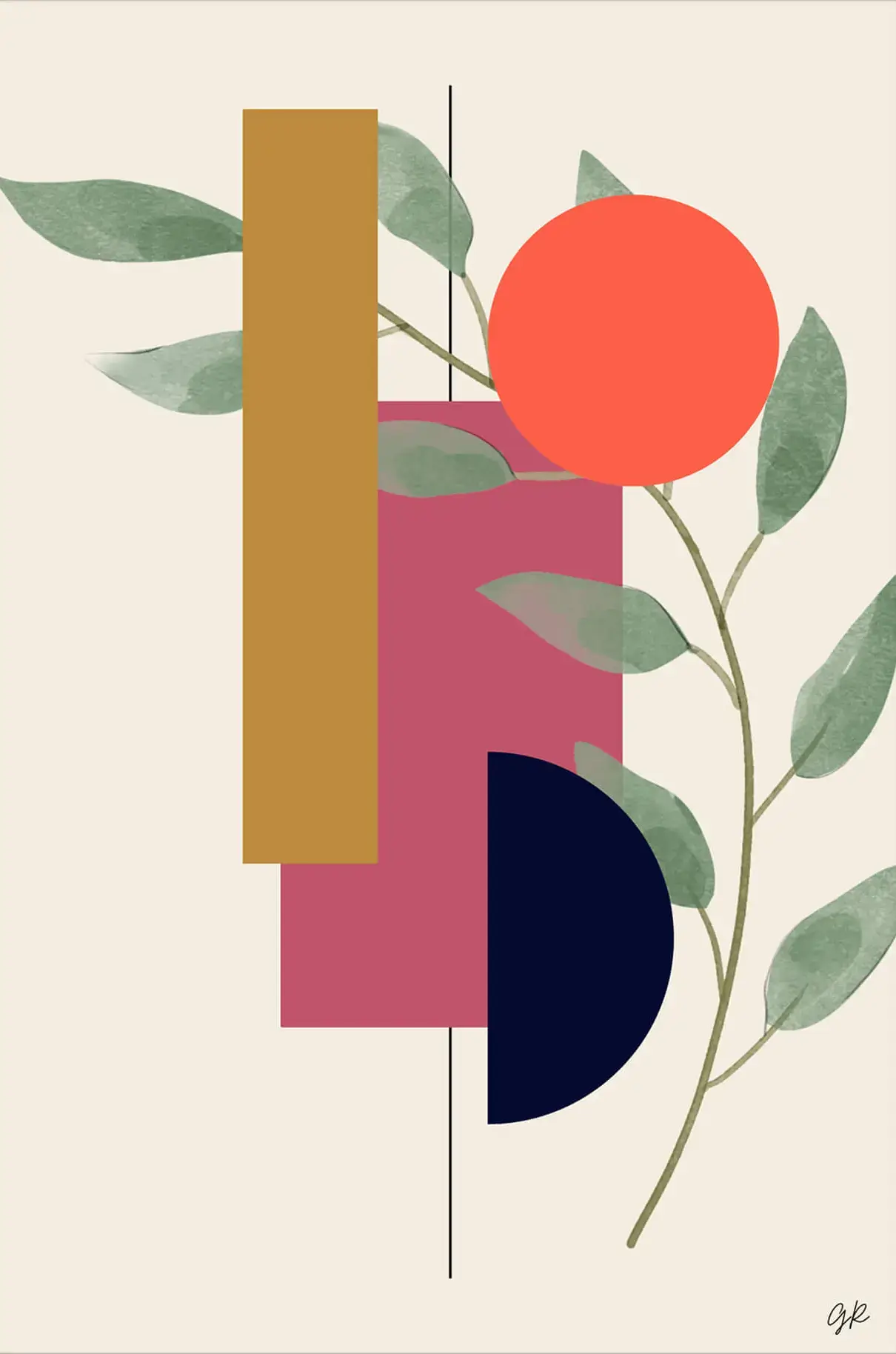 Geometric shapes and a hint of nature come together in an abstract representation. A solid brown rectangle stands alongside a pink square, partially intersecting in a moment of simple overlap. Below, a navy blue half-circle grounds the arrangement, while a sprig with pale green leaves introduces an organic element, adding a natural contrast to the straight lines and sharp corners. Overhead, a red-orange circle hangs, suggesting a sun in a broad, open sky, balancing the minimalist composition.