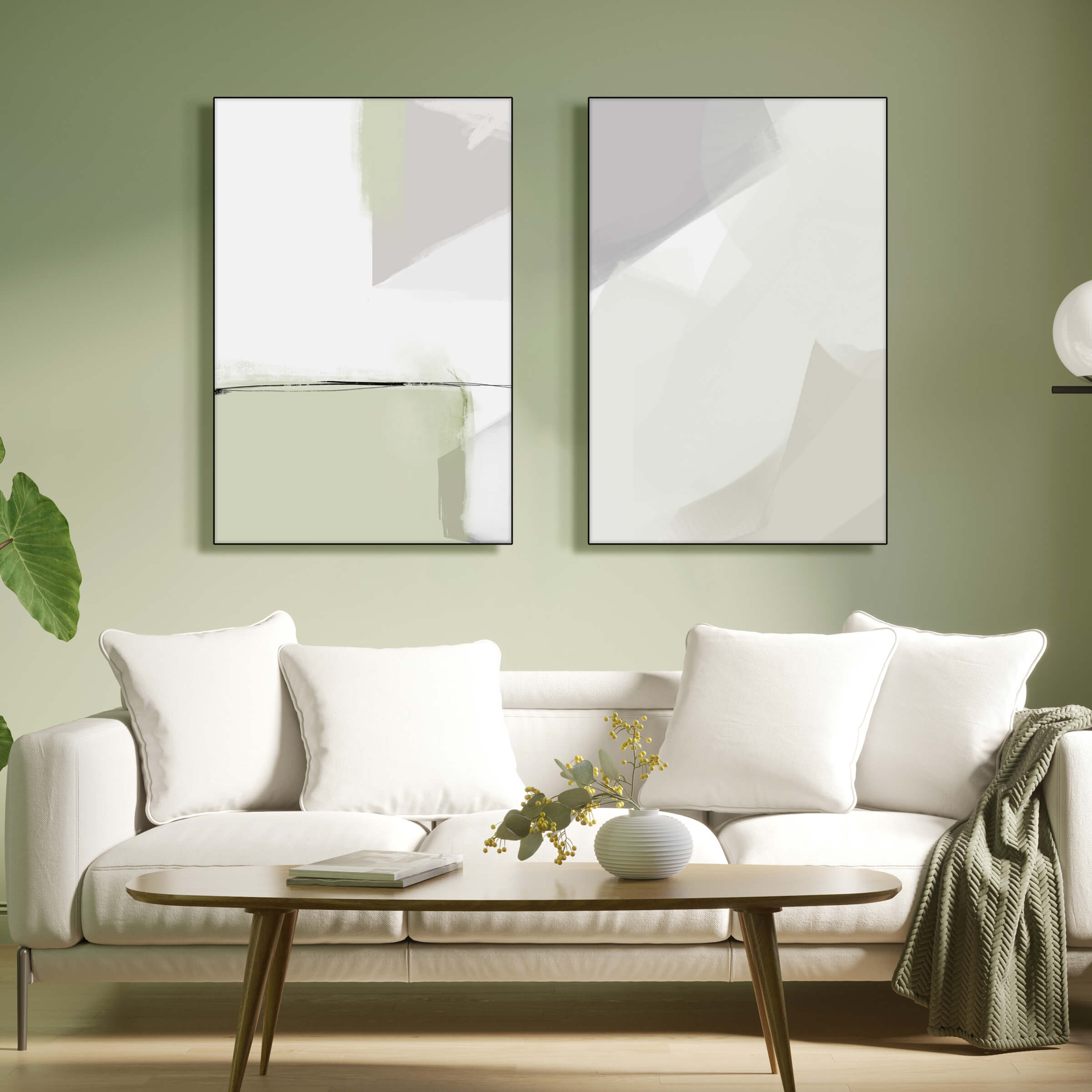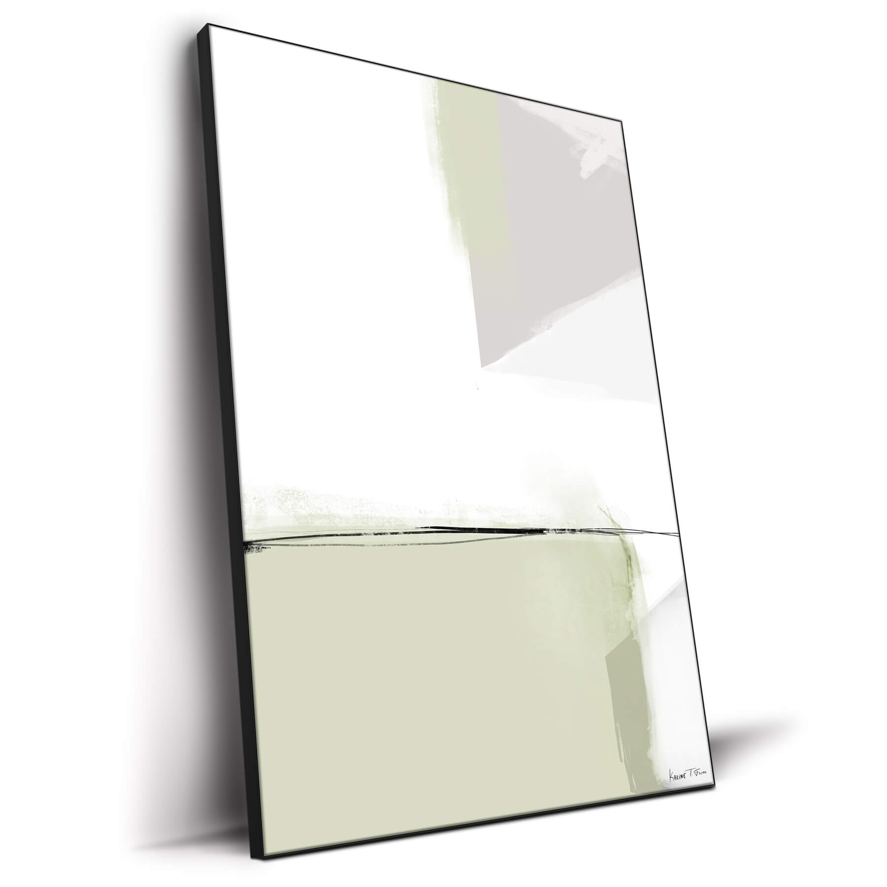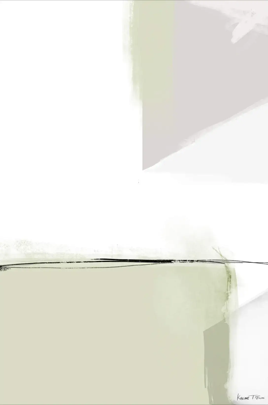 Clean lines and muted tones create a composition that evokes a minimalist sensibility. A horizon line drawn with a delicate hand separates the expanse of pale tones. The subtle exchange of soft greys and light greens lend a sense of open space, a canvas for contemplation.