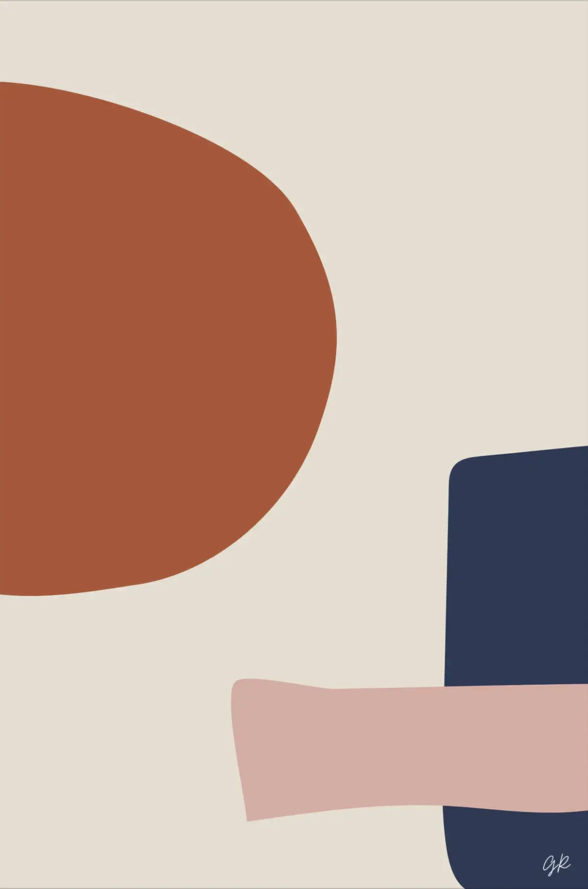 Soft curves and solid blocks of color intersect in this artwork, creating a composition that feels both modern and timeless. A large terra cotta shape nestles against a deep blue form, while a blush-toned band stretches across, uniting the two. The simplicity of the design, with its gentle overlaps and contrasting hues, lends a sense of calm and balance to the piece.