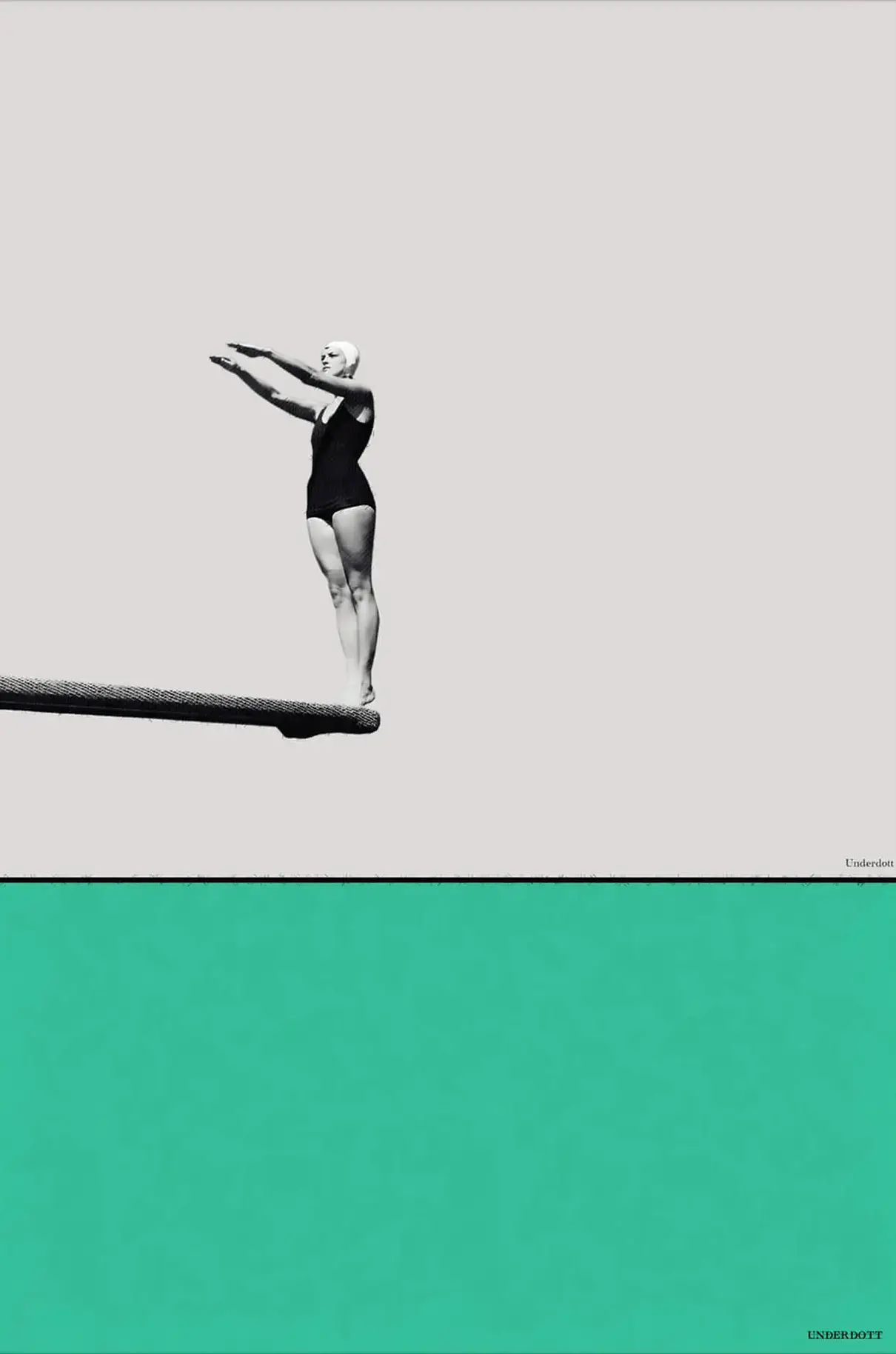 A lone diver in a classic black swimsuit stands at the very tip of a textured diving board, surrounded by a sea of pale gray. Her body forms an arrow, arms extended and ready for flight. The vast empty sky around her heightens suspense. A clean horizon splits the composition and introduces a wide rectangle of saturated teal that suggests still water below. Grainy black and white treatment adds gentle vintage charm that recalls mid century photography.
