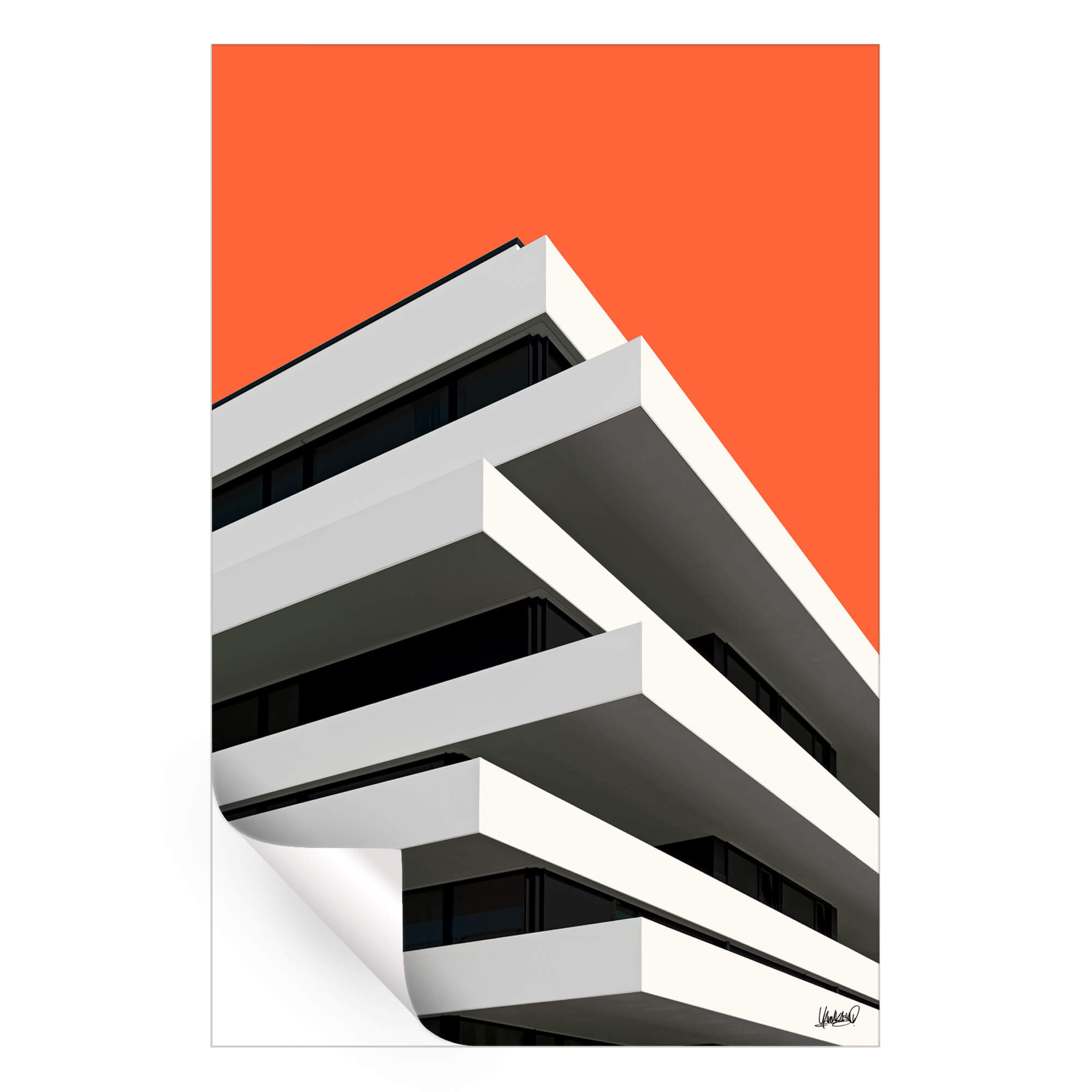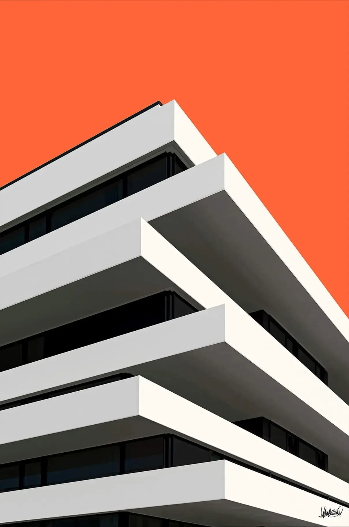 A modern building with white, horizontal layers creates a striking visual against a vibrant orange background. The minimalist design features clean, straight lines and an emphasis on horizontal planes. Each layer is slightly offset, adding depth and a dynamic sense of balance to the structure. The contrast between the white and orange enhances the building’s contemporary aesthetic.
