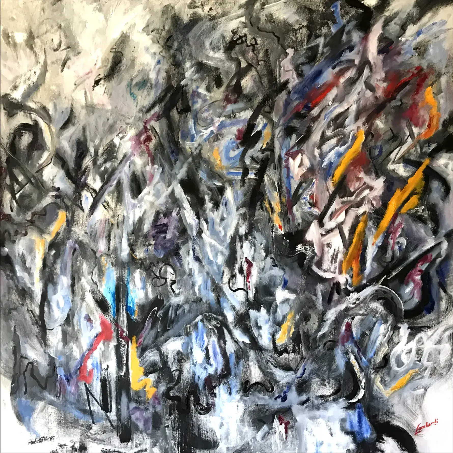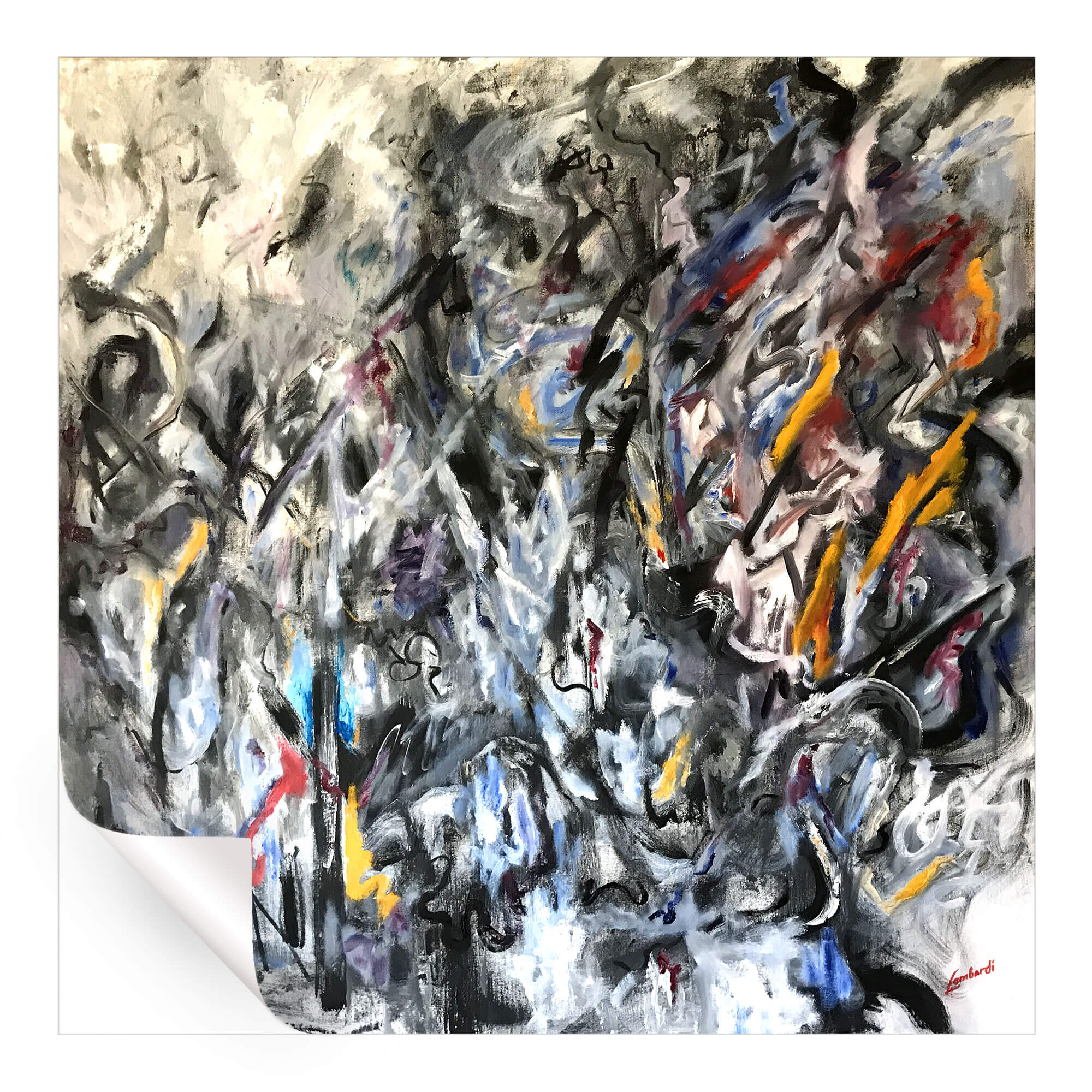 Bob Lombardi’s artwork is an intense whirlpool of grey and black tones, evoking a stormy, turbulent atmosphere. Within this tempest, vivid streaks of red, blue, and yellow emerge like flashes of lightning, providing sharp contrast and a sense of electricity in the composition. The interplay of shadow and color creates a visual rhythm that feels both chaotic and deliberate. This abstract painting captures a sense of raw, unbridled energy, as if the artist has harnessed the essence of a storm onto the canvas.