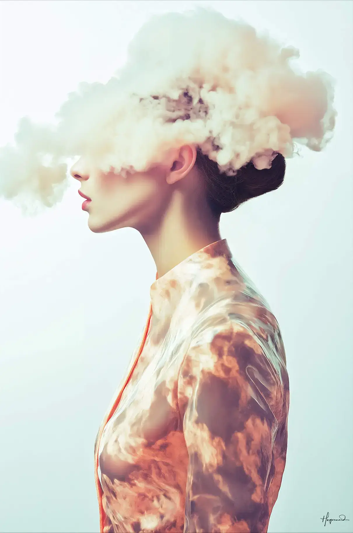 Closer inspection reveals fine digital brushwork that merges photography with painting. The cloud texture hovers weightless yet tactile, suggesting thoughts drifting beyond view. This refined balance of realistic detail and surreal invention typifies work found in contemporary wall art and pairs gracefully with female portrait artwork. Calm tones align with the calming wall art mood category, ideal for reflective interiors.