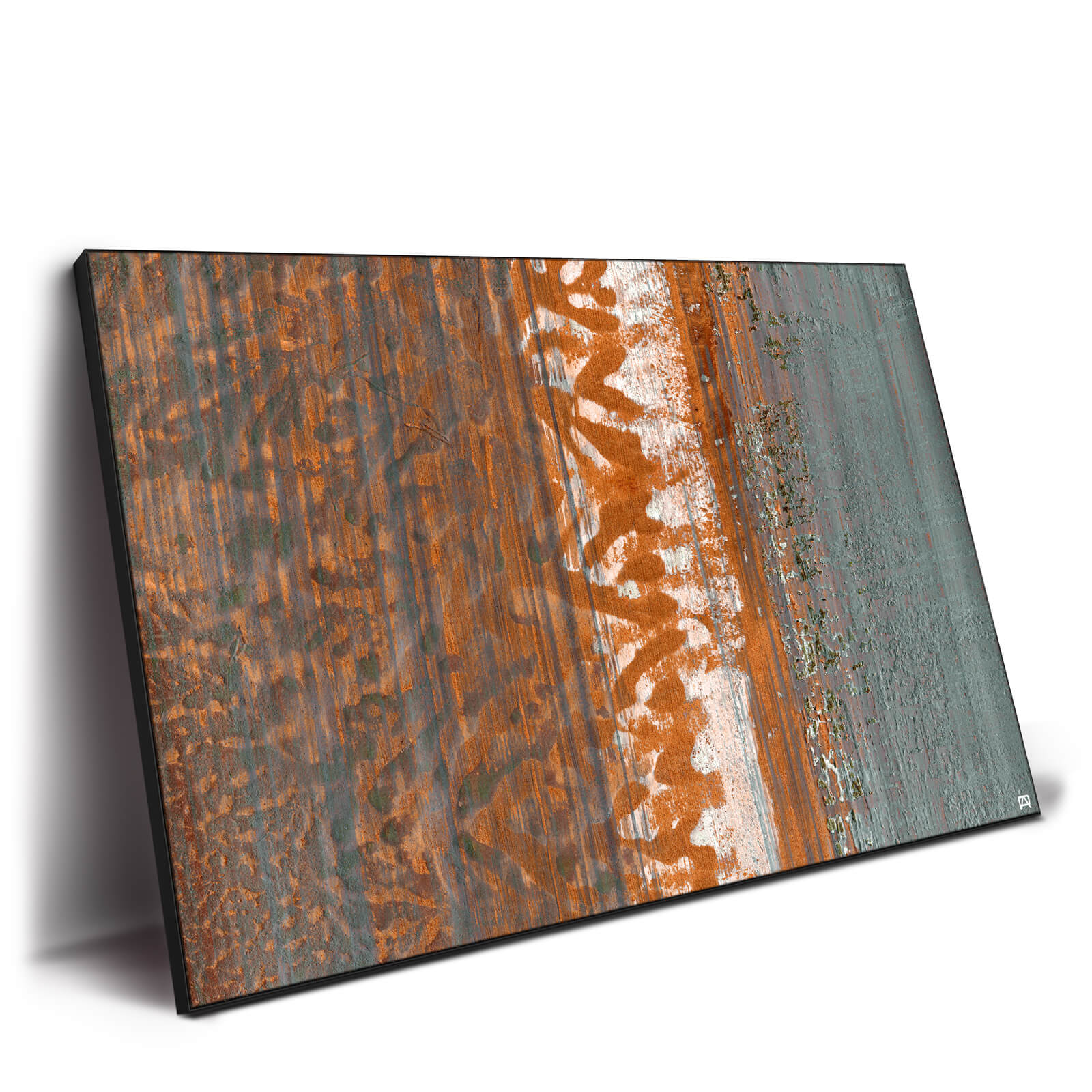 Vivid rusty brown with dark mottling conjures images of corroded metal in this modern abstract art piece.