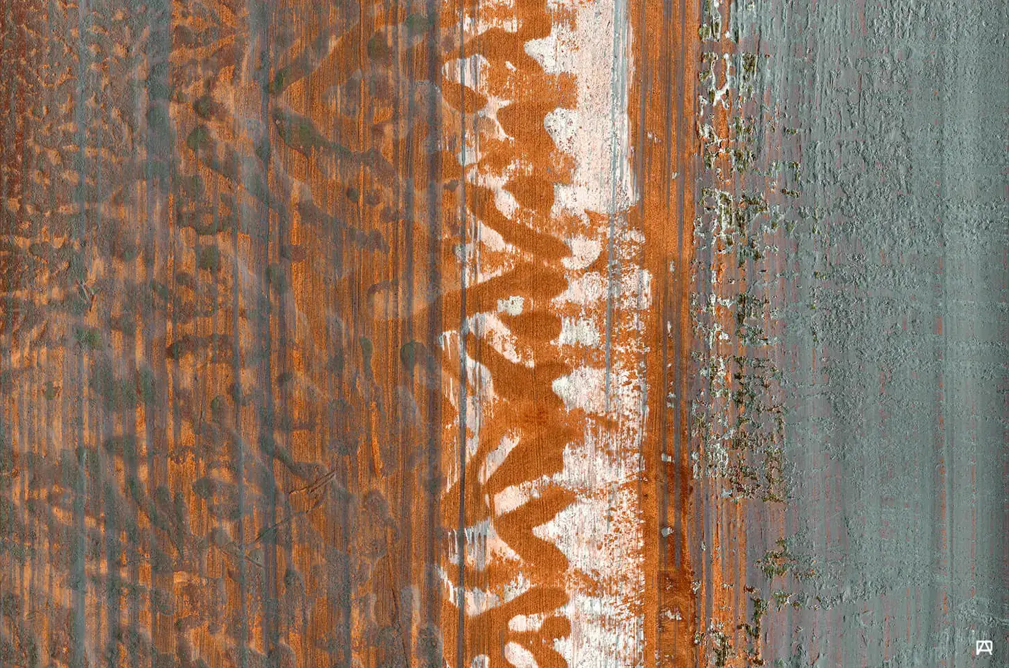 The right side offers a cooler tone with a faded steel color. There is a sense of wear, where areas of paint have been scraped away, revealing a rugged texture underneath.