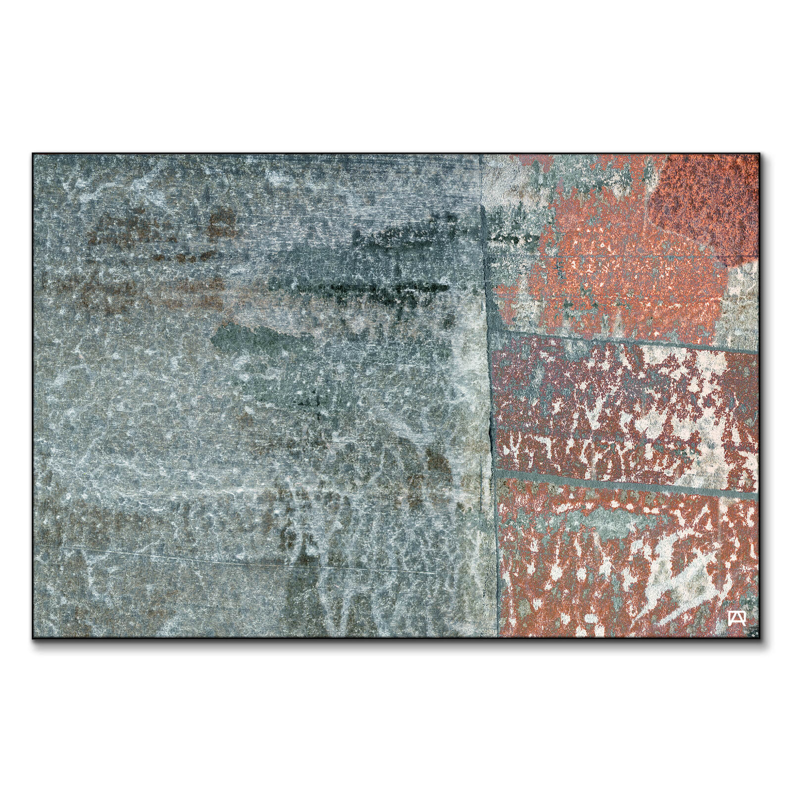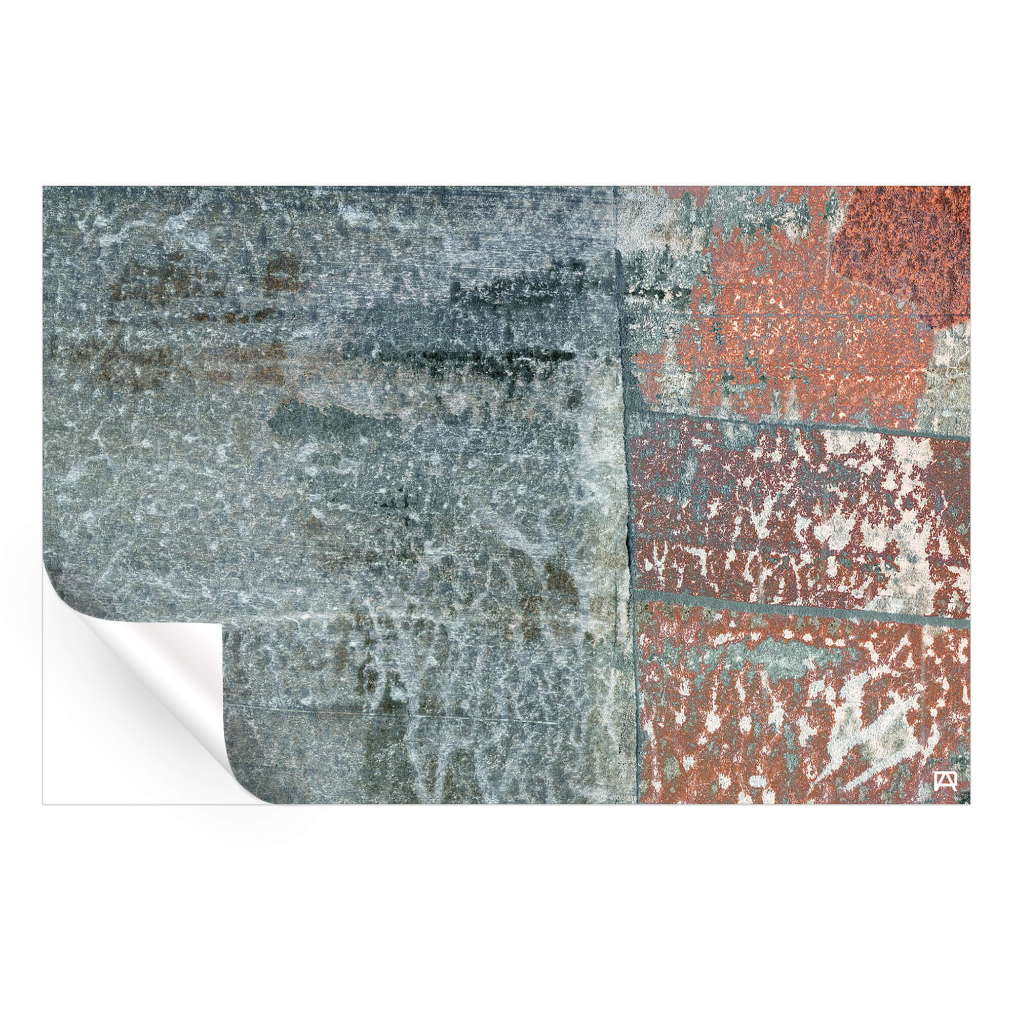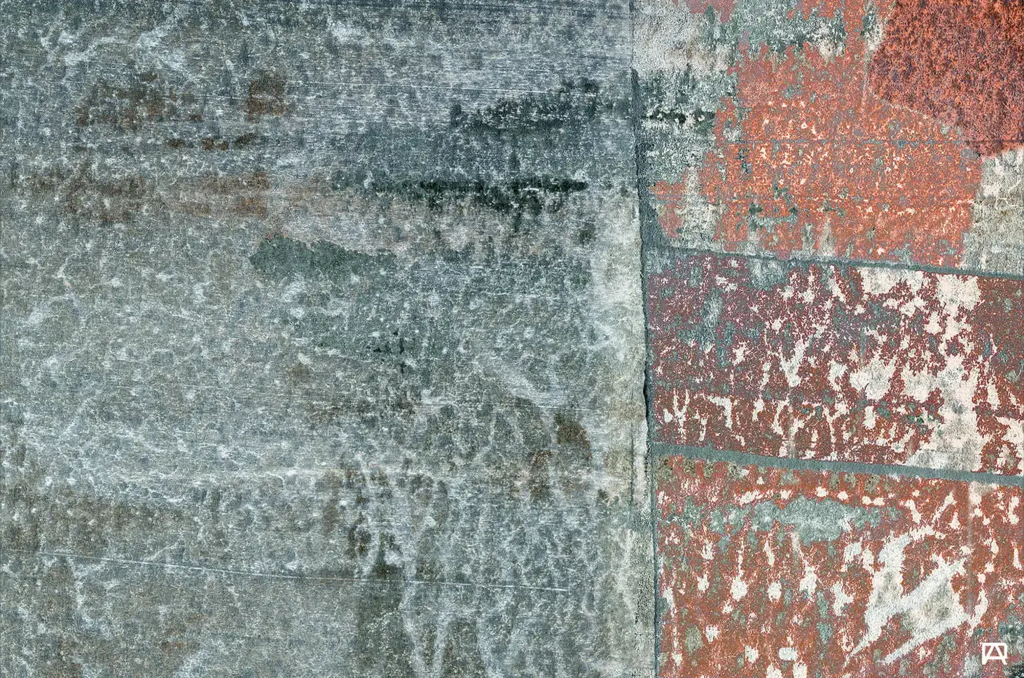 In contrast, rectangular sections are vertically stacked, each exhibiting a different pattern of distress. These rectangles have a brick-like color, and are overlaid with patches of white.
