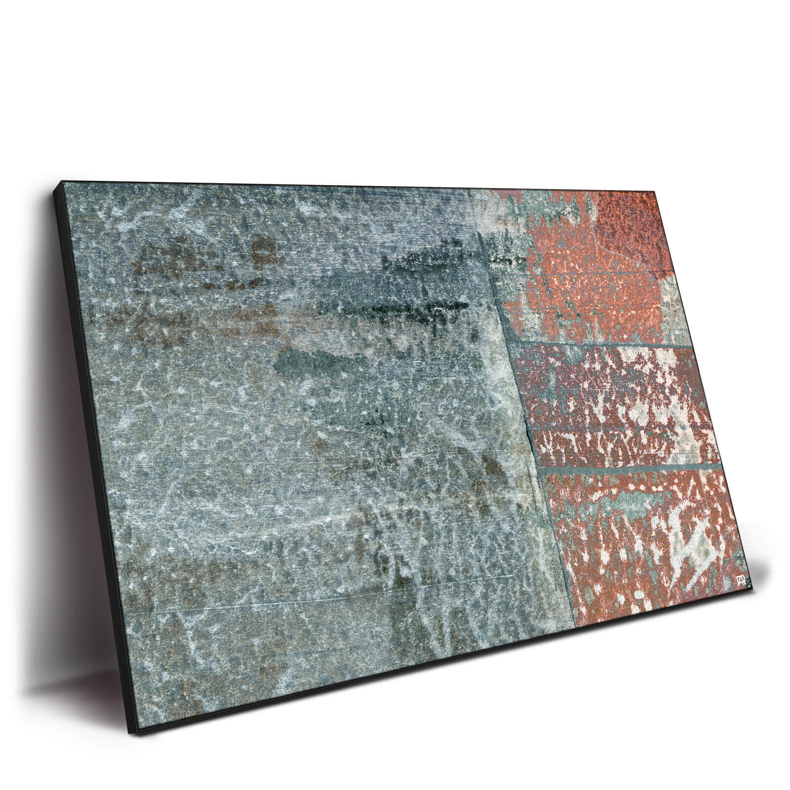Dominated by a large expanse of gray, the surface of this modern abstract wall art is mottled; areas seem to be worn and others have a chalky texture.