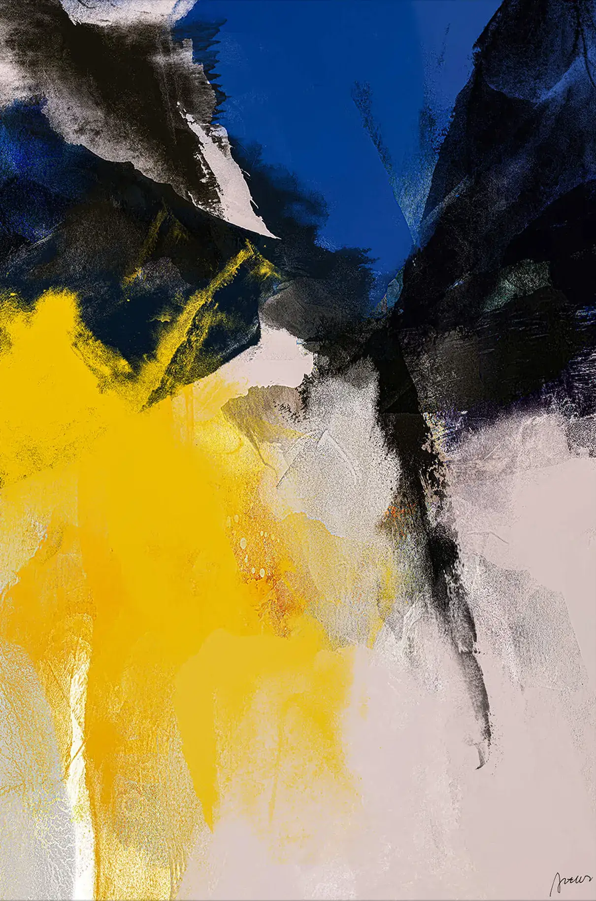 Bold contrasts define this dynamic abstract artwork, with deep blues and blacks colliding with vibrant yellow splashes. The interplay of dark and light hues creates a dramatic effect, enhancing the visual energy of the piece. Brushstrokes swirl together, making the artwork both chaotic and captivating.