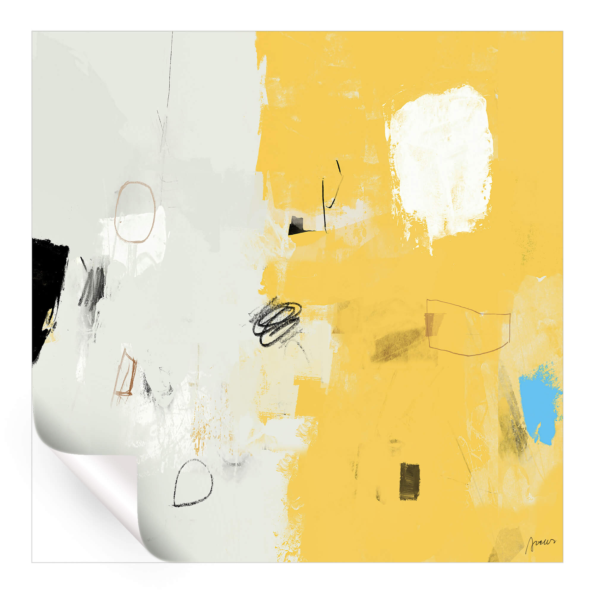 This abstract piece combines rich yellow and white tones, offering a modern and fresh perspective. The composition is marked by sharp contrasts and smooth gradients that create a sense of motion while maintaining a clean, minimalist aesthetic. The artwork invites viewers to engage with its simplicity and bold color choices.