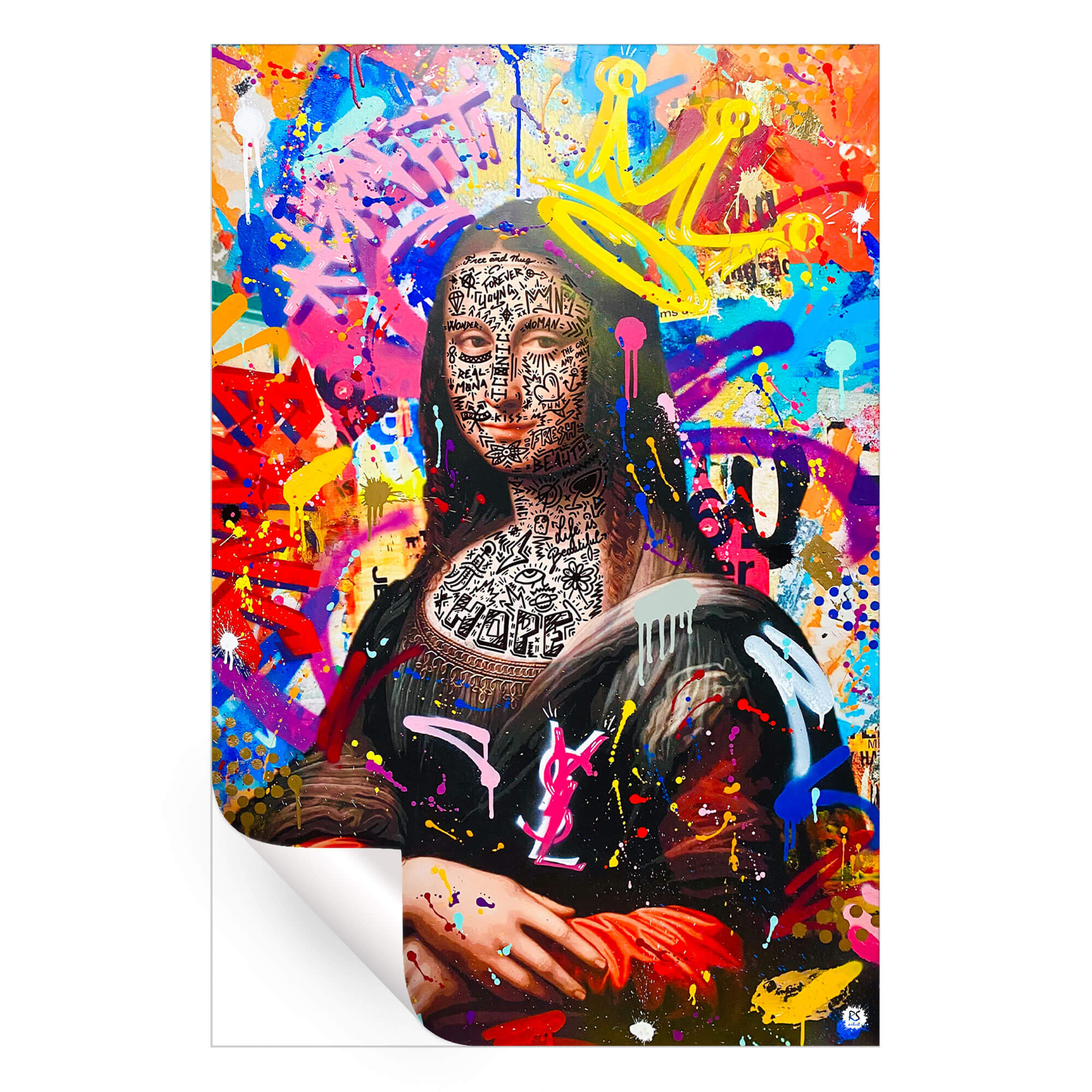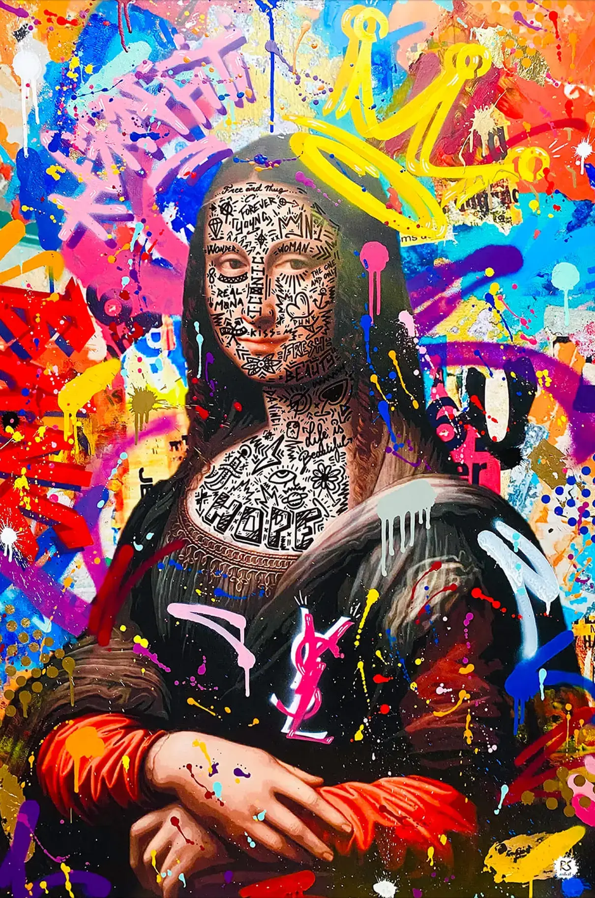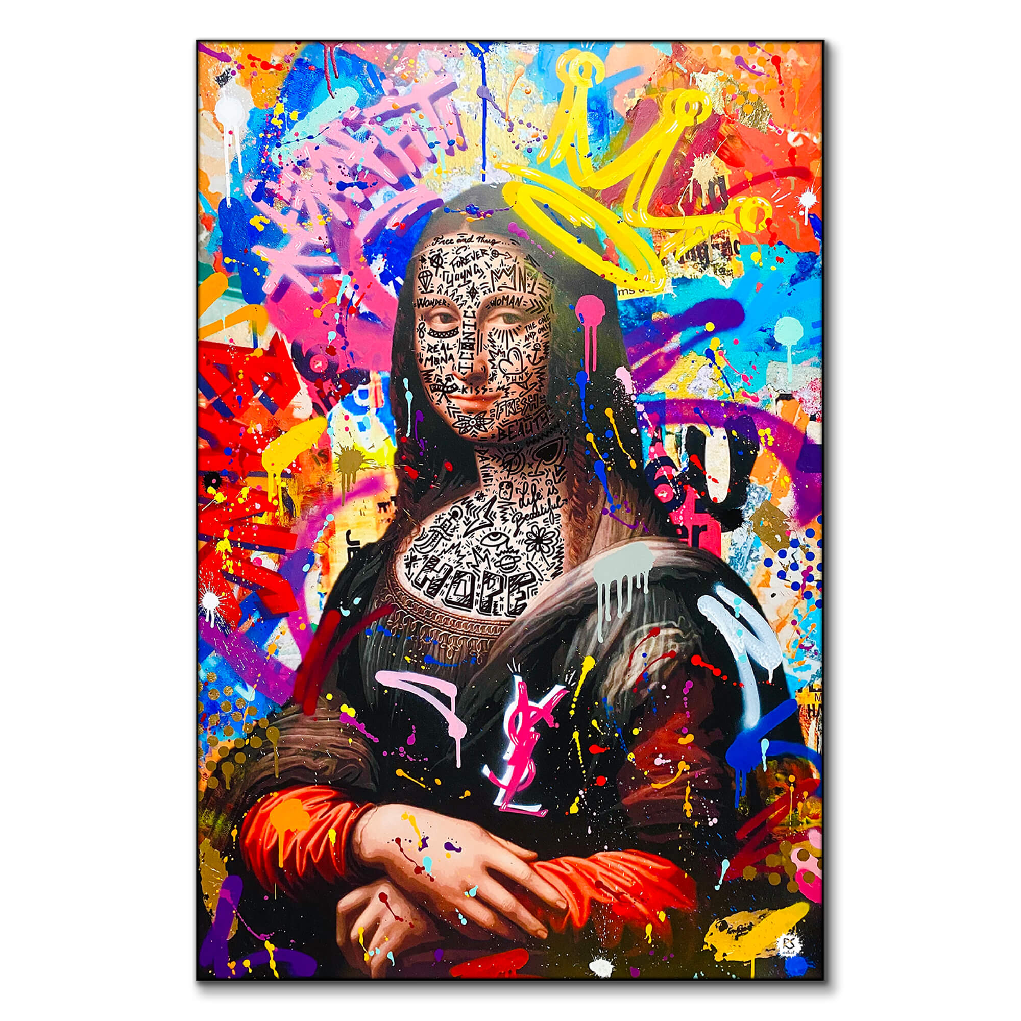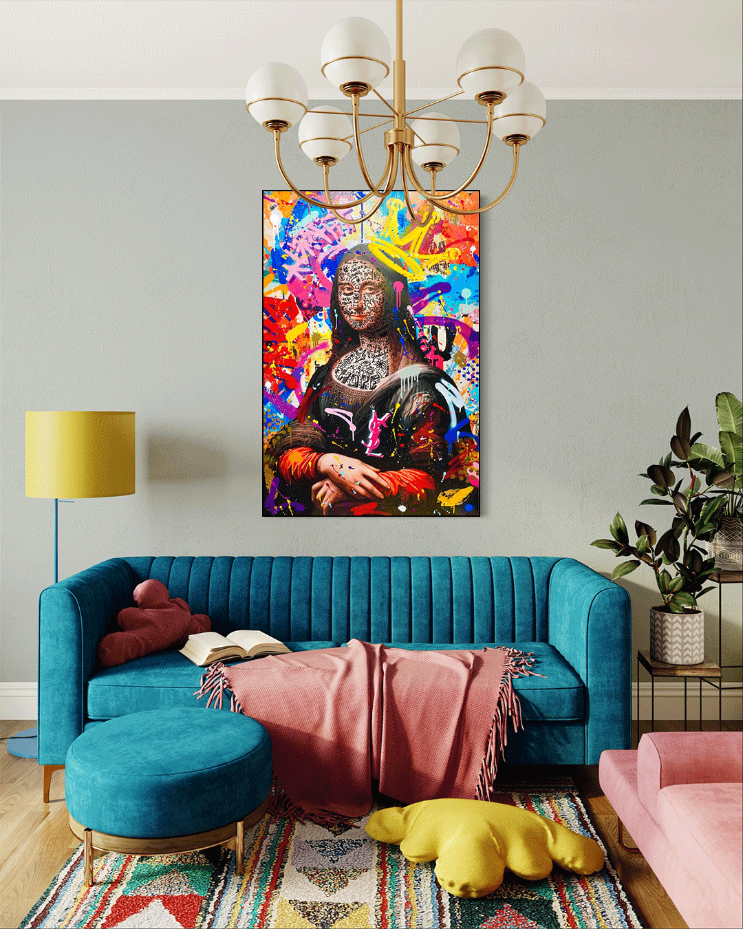 Mona Lisa’s iconic smile takes a walk on the wild side in this vibrant portrait, bursting with a spectrum of graffiti colors and urban flair. The juxtaposition of classical art with the anarchic splashes of street style breathes new life into the timeless masterpiece, offering a fresh perspective that both contrasts and complements the original’s serene composure. It’s a bold reinterpretation that will be the centerpiece of any room, appealing to art enthusiasts who appreciate a touch of modern rebellion in classical works.