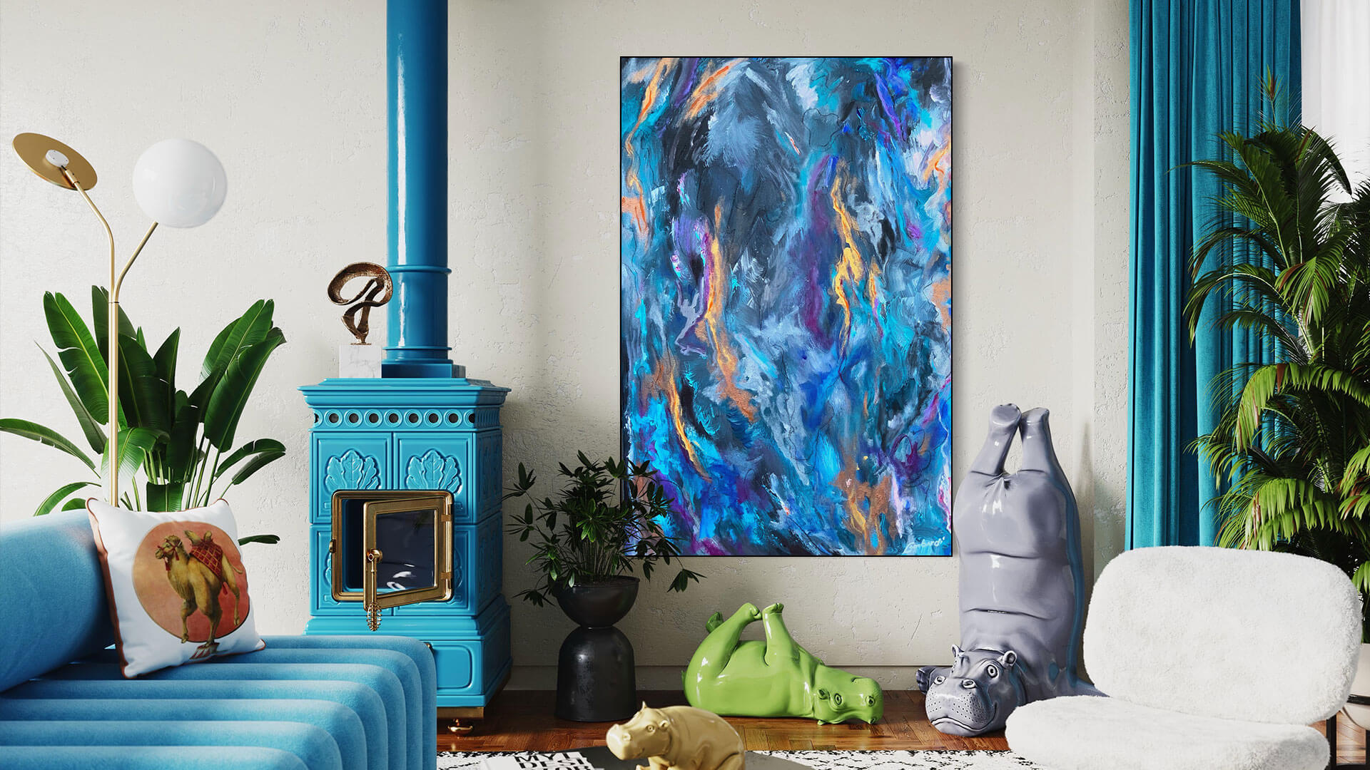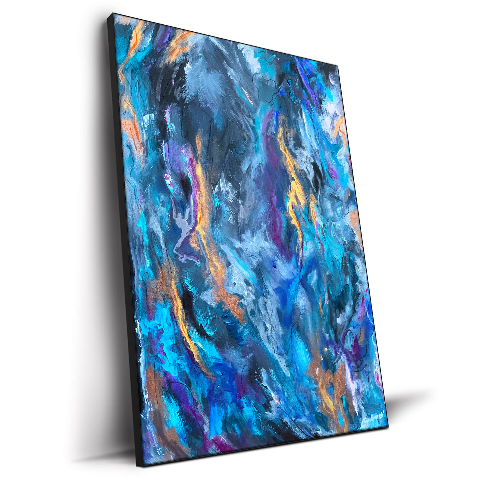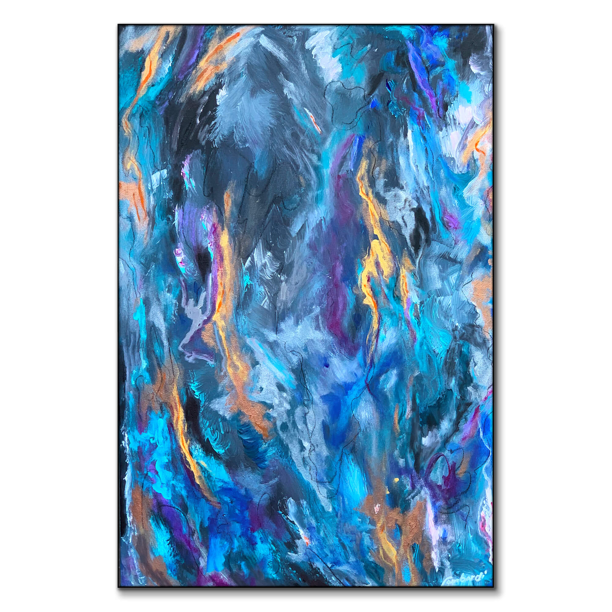 This abstract artwork by Bob Lombardi is a vibrant composition that plays with a myriad of blues accented with bold streaks of orange and subtle hints of purple.