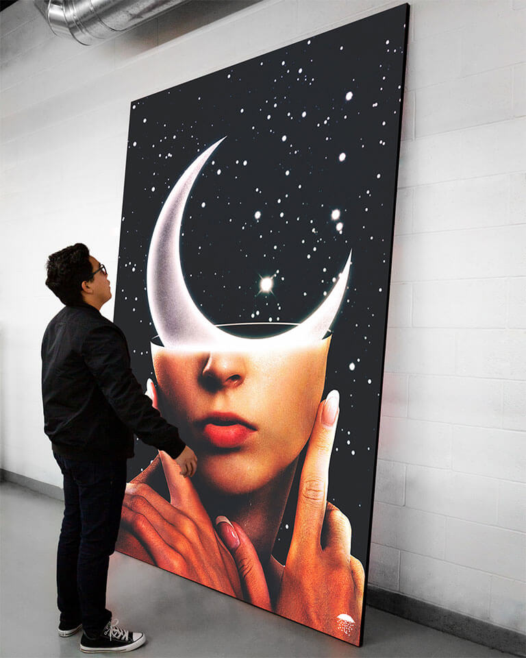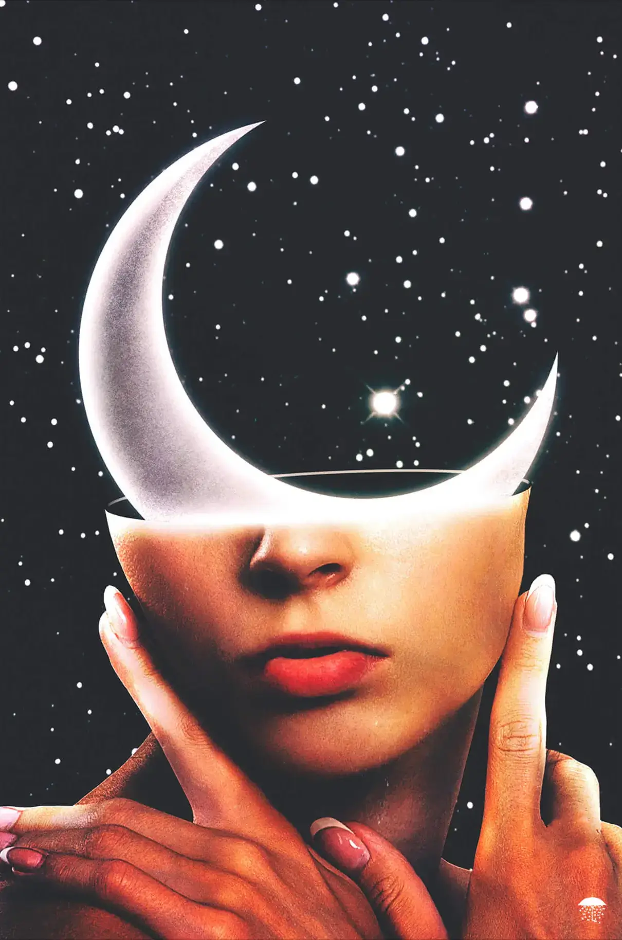 A crescent moon slices across the scene, aligning perfectly with the silhouette of a person’s face, creating an illusion of the moon forming the upper half of their head. Below the celestial curve, the person’s features are graceful, with lips pursed and the figure’s fingers framing each side of their face and the backdrop is a star-studded night sky.