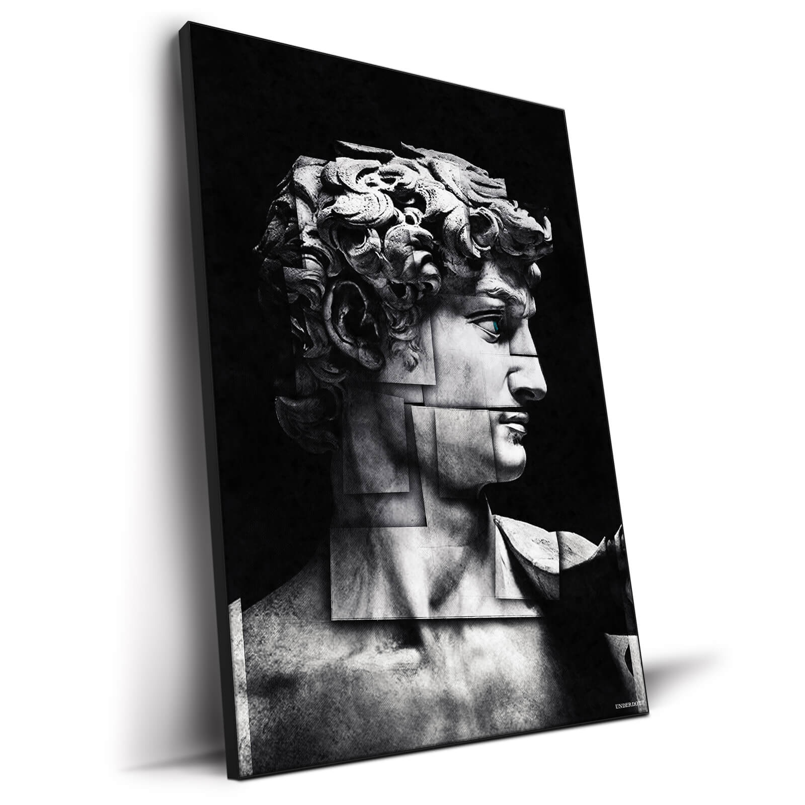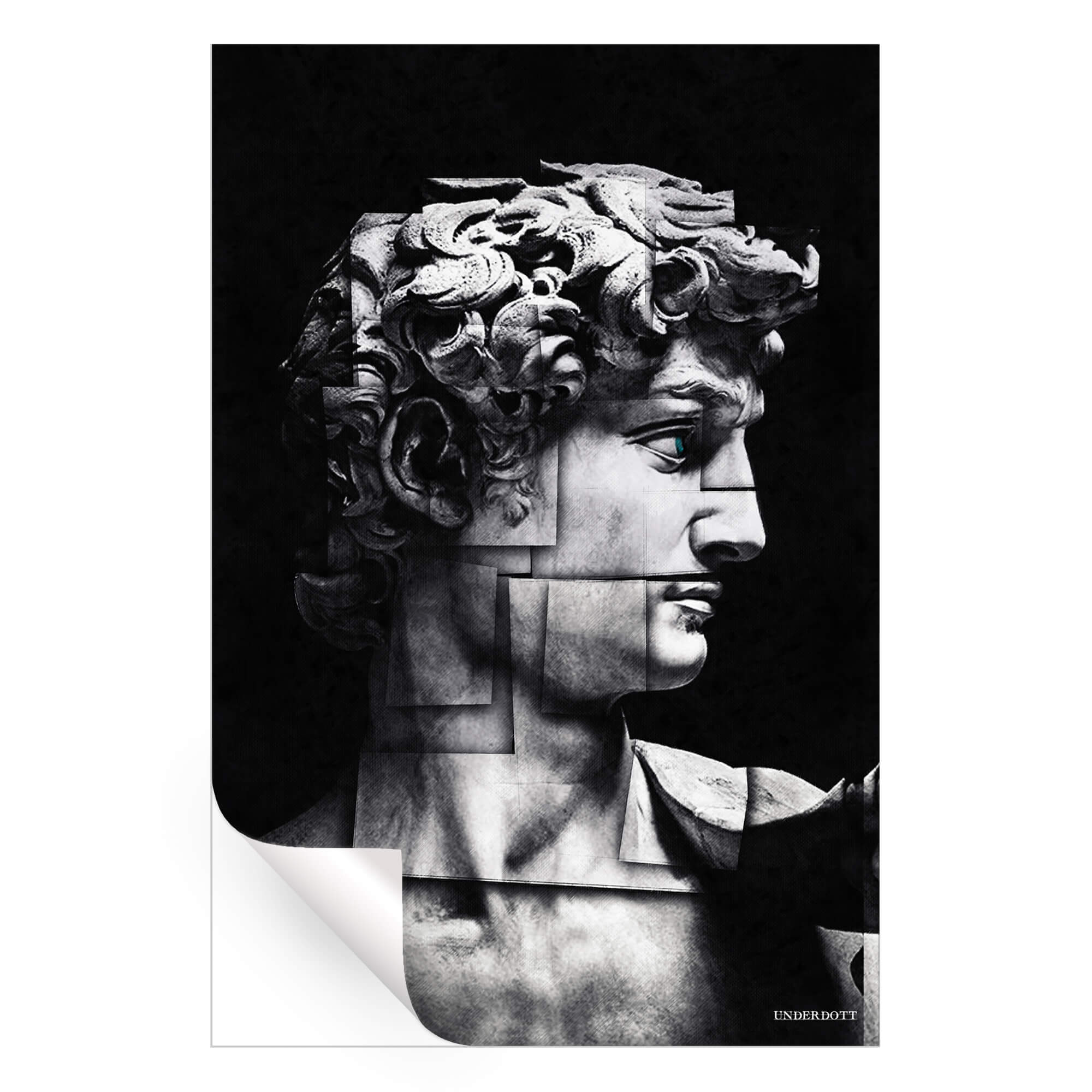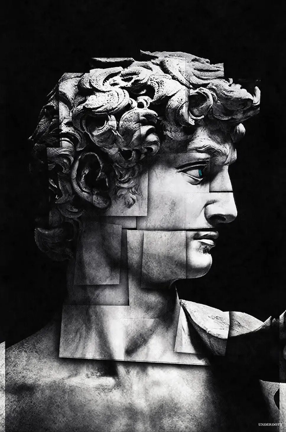 A deconstructed view of a classical statue, Michelangelo’s David. A series of overlapping square and rectangular segments are misaligned to create a disjointed and abstract effect.