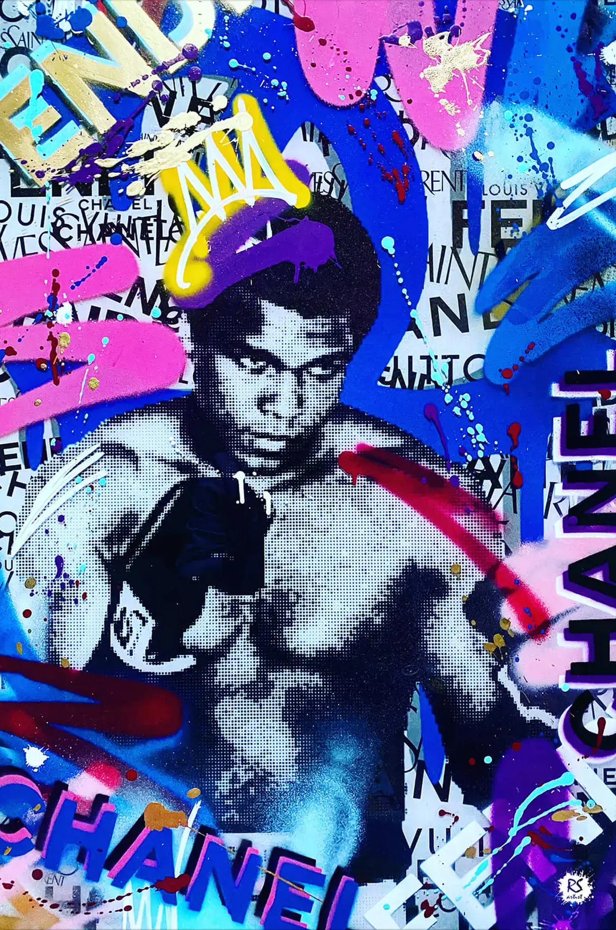 Powerful and determined, Muhammad Ali stands center with his intense gaze conveying strength and focus. Ali is rendered in dot-matrix style, giving him a timeless and classic appearance. Surrounding him is a vibrant explosion of colors—blues, pinks, purples, and yellows—layered with abstract graffiti-like strokes and splatters. The background features a collage of luxury brand names, including “Chanel” prominently repeated.