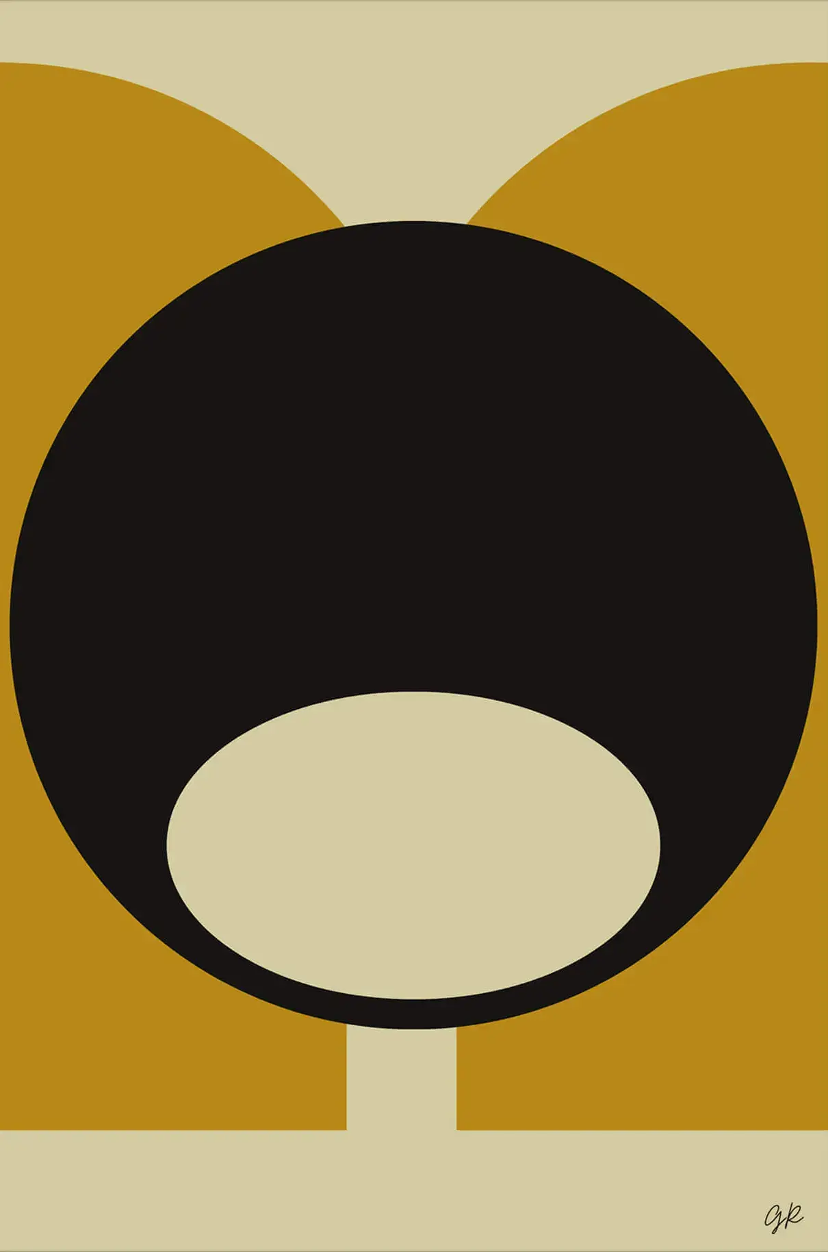Bold geometric shapes take center stage, where a large black circle sits prominently, cradled by a creamy arc at its base, giving an illusion of depth. Mustard yellow forms flank this central motif, their curves mimicking the circle’s edge. The entire composition stands out against a soft-hued backdrop, offering a eye-catching contrast.