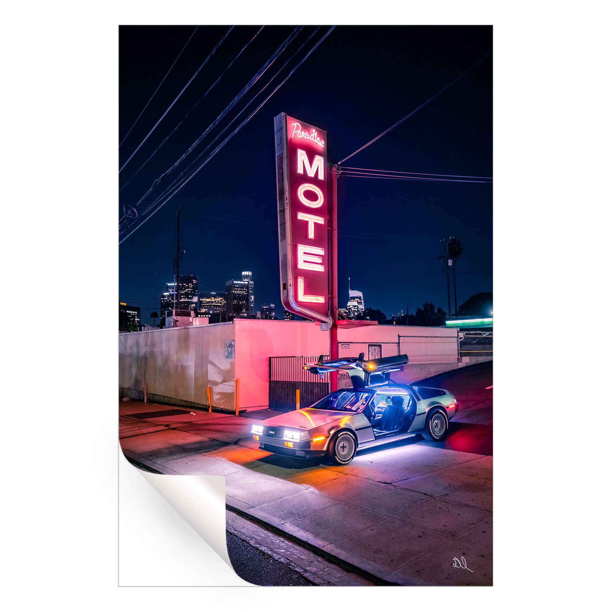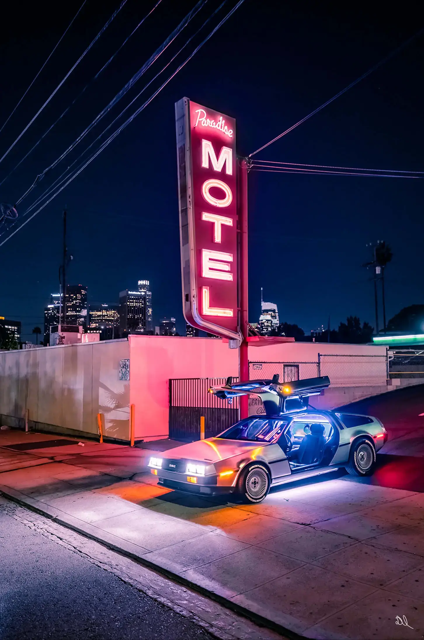 Bathed in the pink and blue hues of the motel’s sign, the DeLorean is a throwback to an era of bold designs and big dreams.