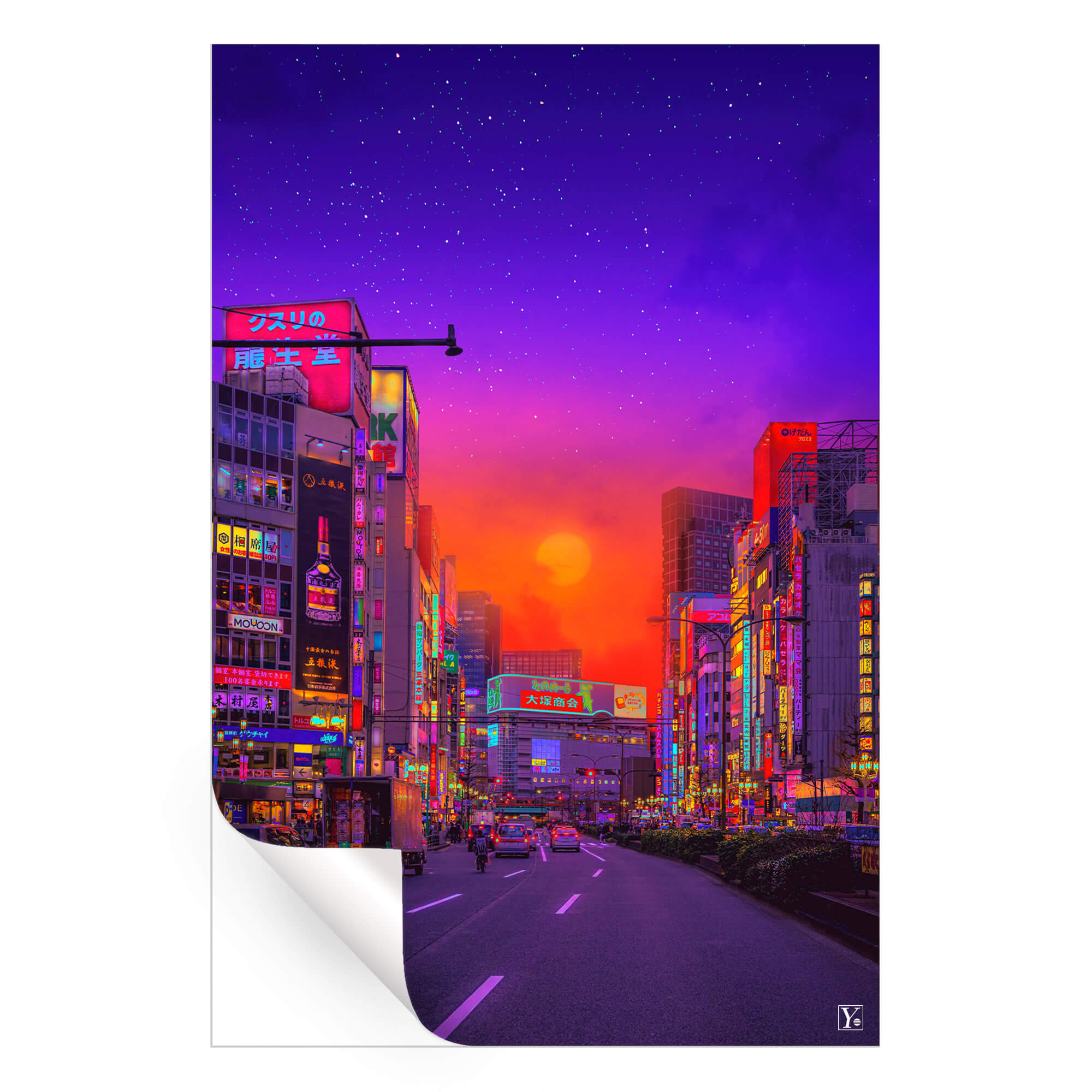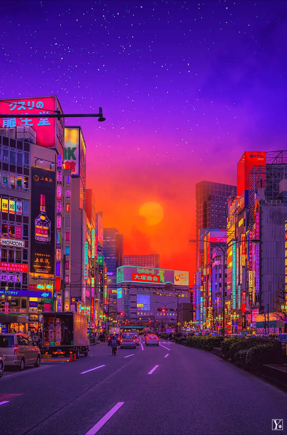 A city street at twilight is awash with a fusion of neon lights and a radiant sunset. Skyscrapers rise into a star-speckled purple sky, while a warm, orange sun hovers at the horizon.