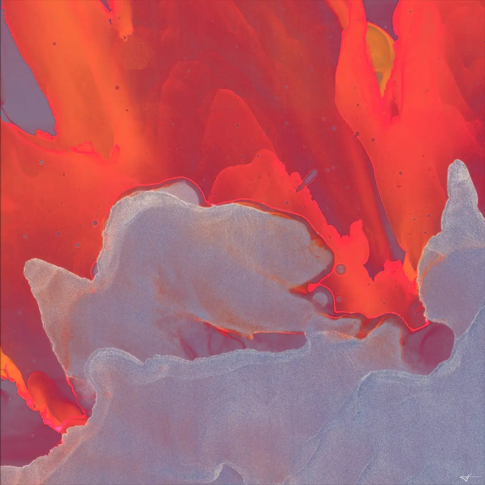 Colors flow and merge with each other, creating intense shapes of red and orange that clash with the cooling effect of the purple and gray.