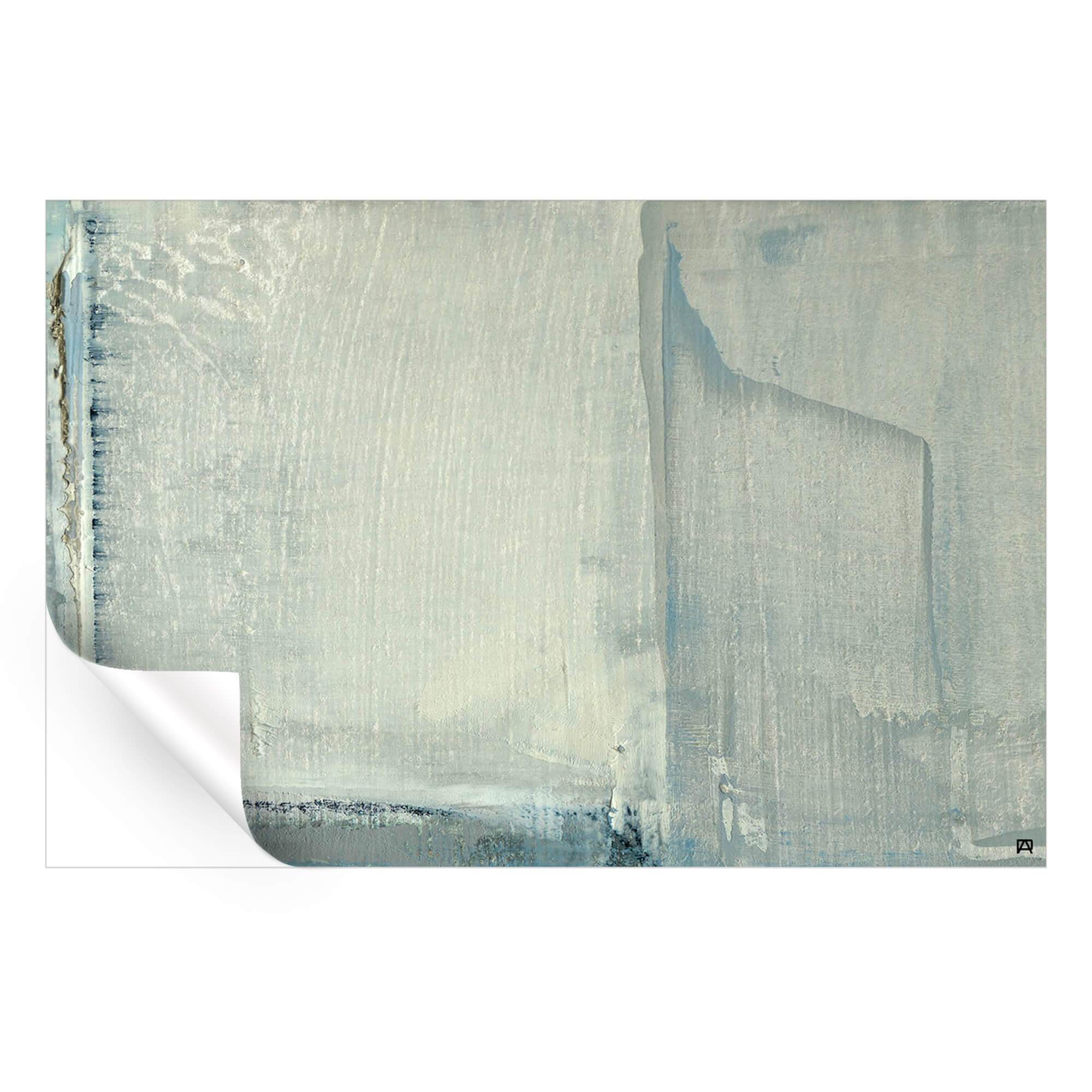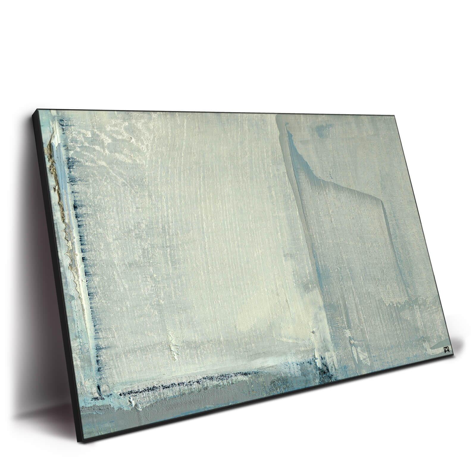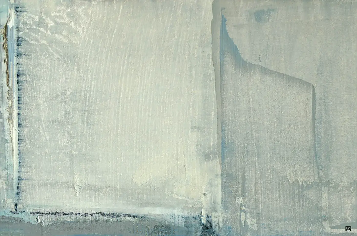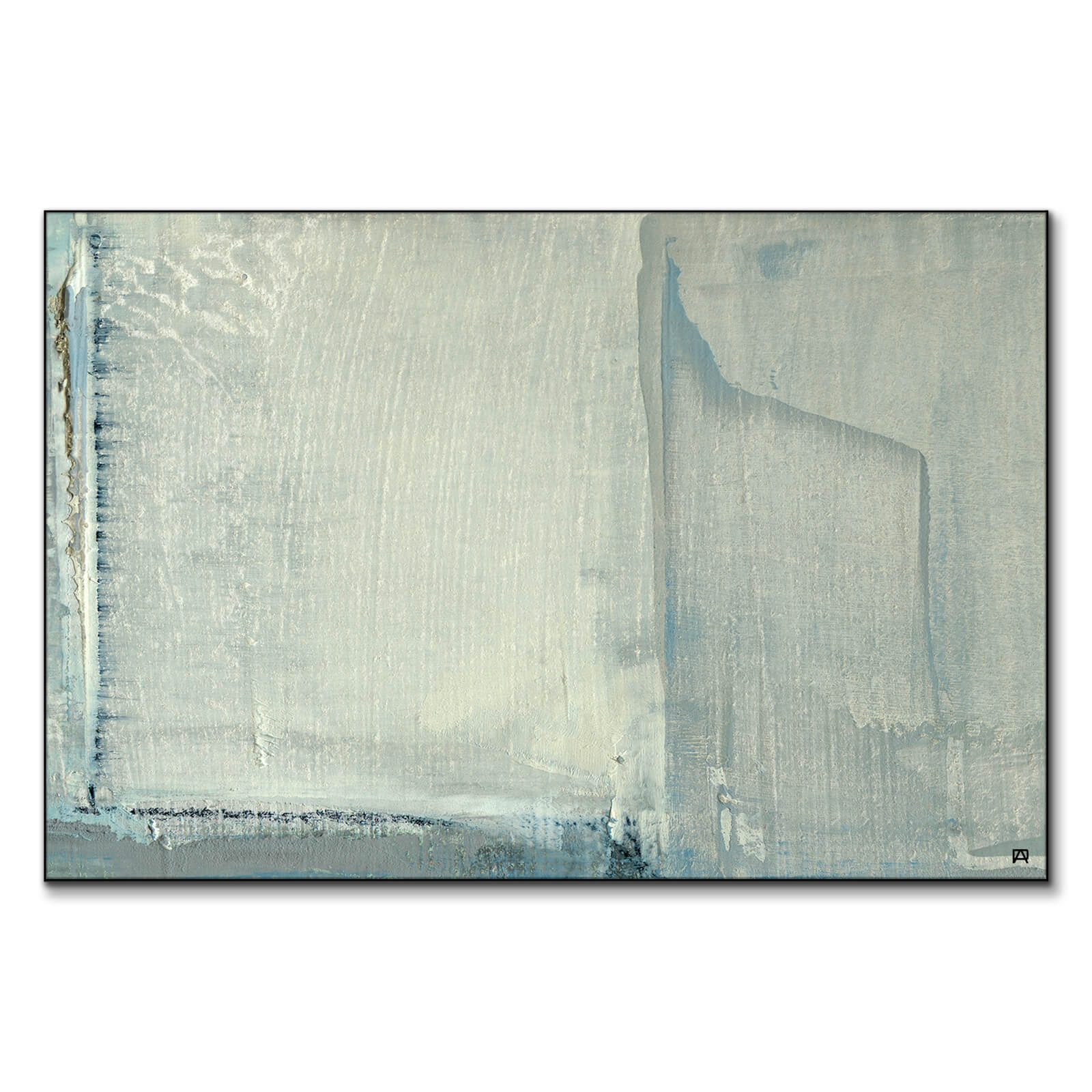 Muted and calm, an emphasis on texture is placed on this neutral abstract painting. Predominantly gray and white in tone, subtle hints of blue add dimension.