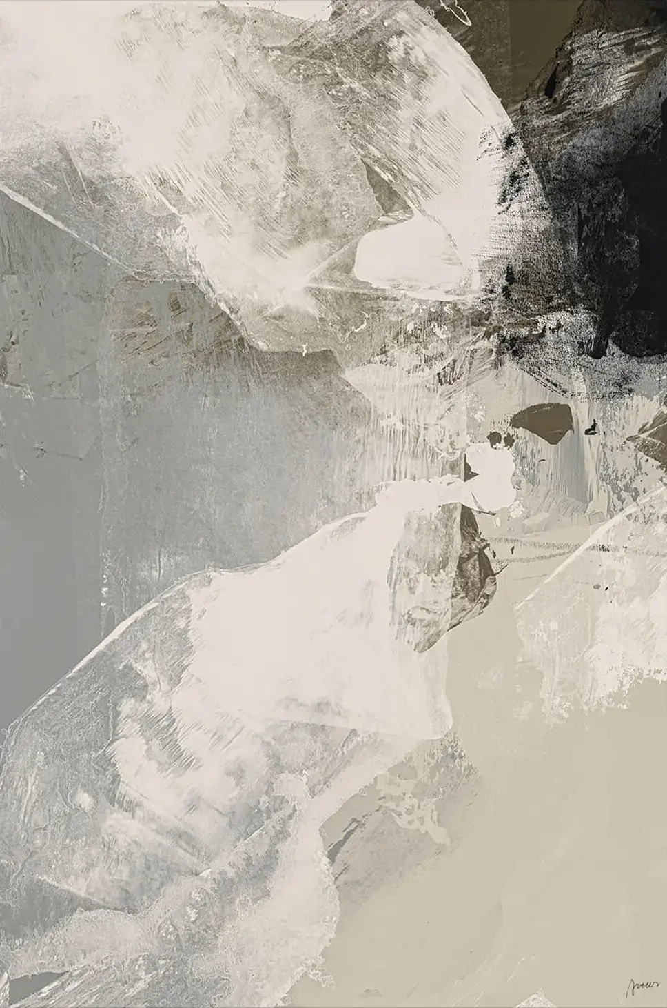 Pale mineral greys sweep upward like mist meeting stone. Near the top right, a shadowed block of raw black presses against delicate beige, creating a quiet moment of contrast. Feathered brushwork hides subtle textures that resemble cracked rock, frost, and fading film. Softer ivory passages glow at the center, suggesting distant light breaking through haze. Each layer feels suspended in time, as if the motion has paused mid-flow. Earthy taupe grounds the lower edge, while narrow streaks of slate crisscross the surface. The mood is calm yet slightly unsettled, inviting long contemplation. Subdued tones make this piece at home beside natural wood, concrete, or minimalist décor. View more pieces with similar serenity in our abstract wall art collection and curated indie art prints.