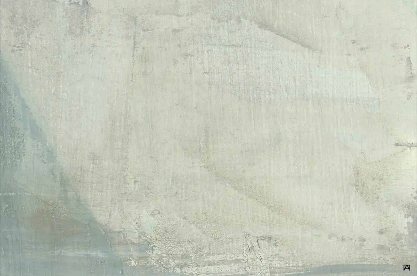 The canvas is covered in a wash of an off-white color, with hints of green at the edges, creating a soft, ethereal effect.